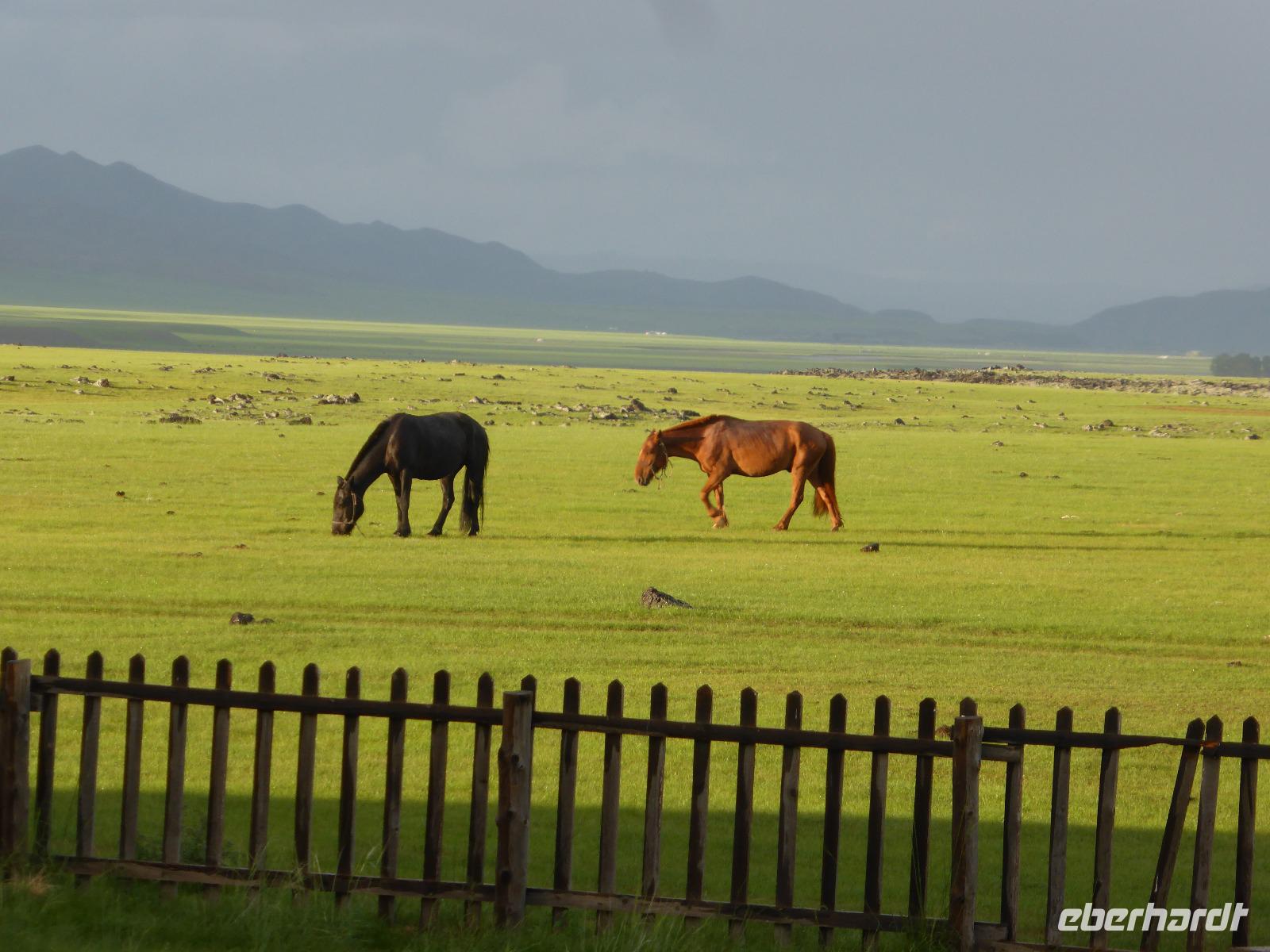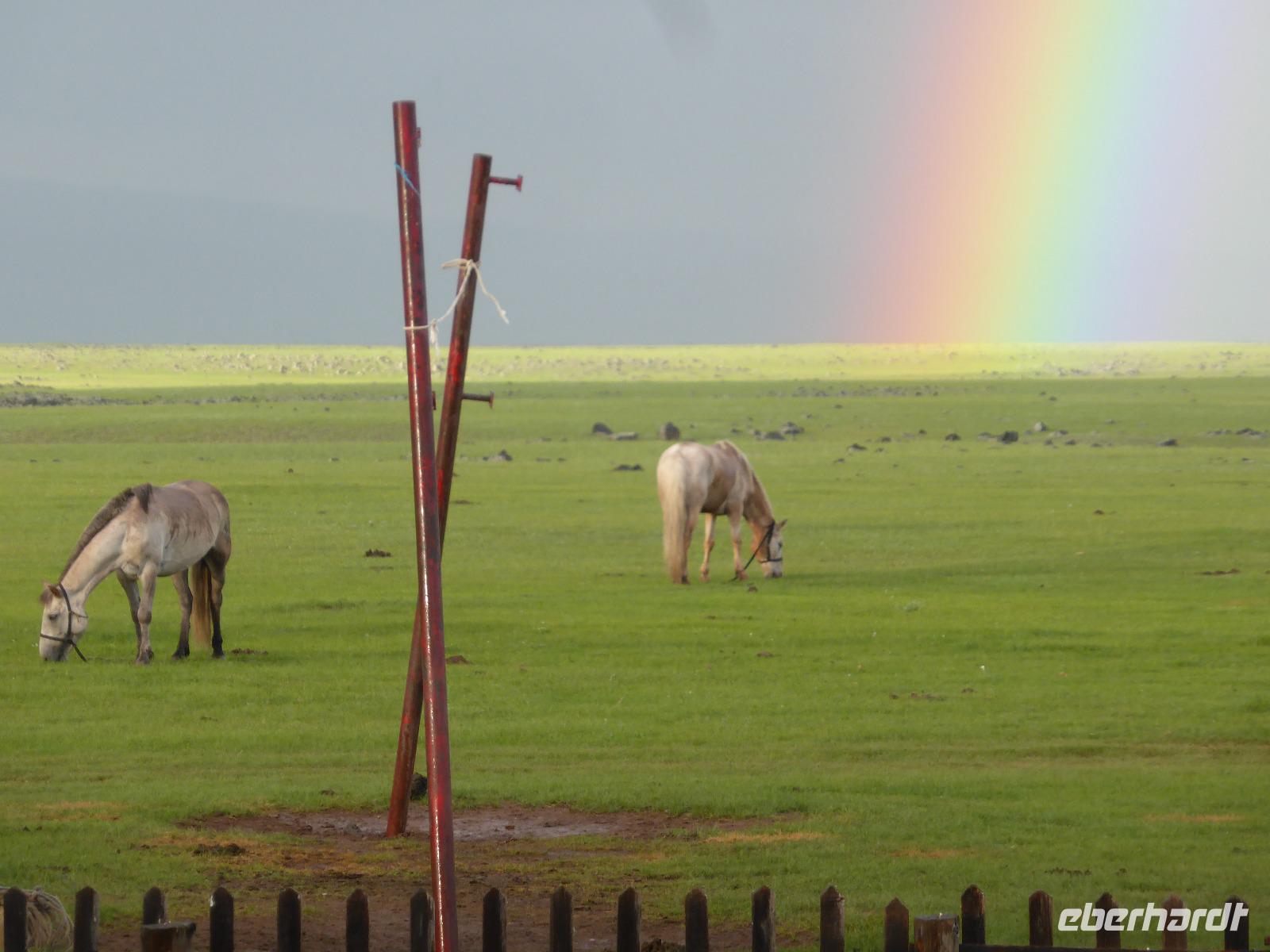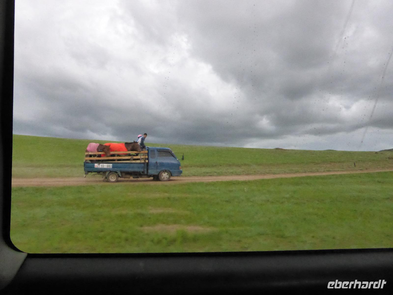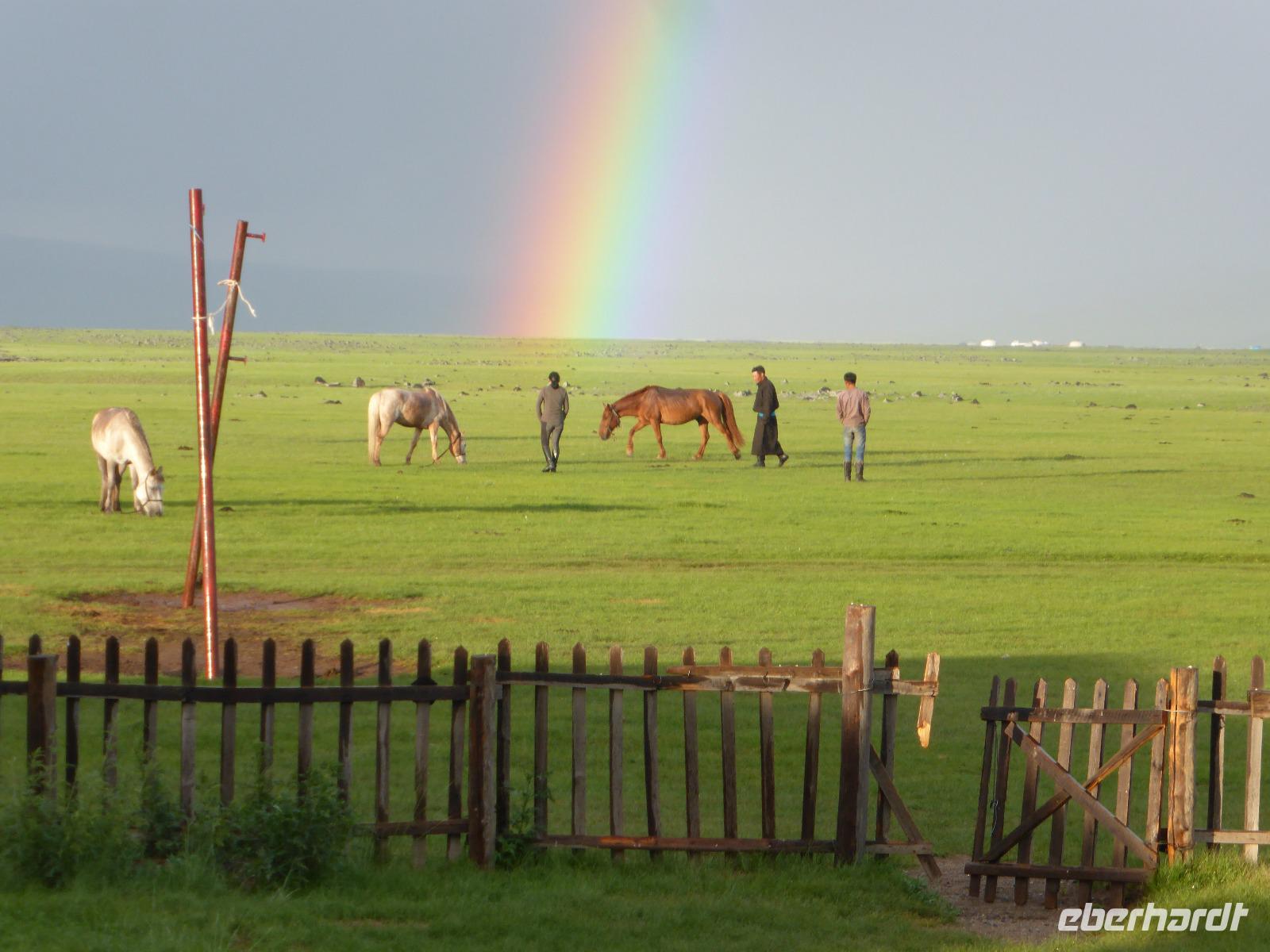 Erst um die Mittagszeit endet der Regen. Dicke weiße Haufenwolken in malerischen Gebilden am Himmel. Dazwischen Blau. Die Landschaft in verschiedenen Grüntöne, geradewegs fahren wir hinein. Mehrere Fahrspuren erlauben nebeneinander zu fahren. Fast wie im Alpenvorland sieht es aus. Immer häufiger sehen wir Jurten und Tierherden. Mittagessen gibt es unterwegs als wir auf die Straße stoßen. Gewissermaßen fahren wir jetzt pausenlos an Tierherden vorbei, freuen uns über einen klassischen Nomaden, der Tiere mit dem Lasso einfangen will.