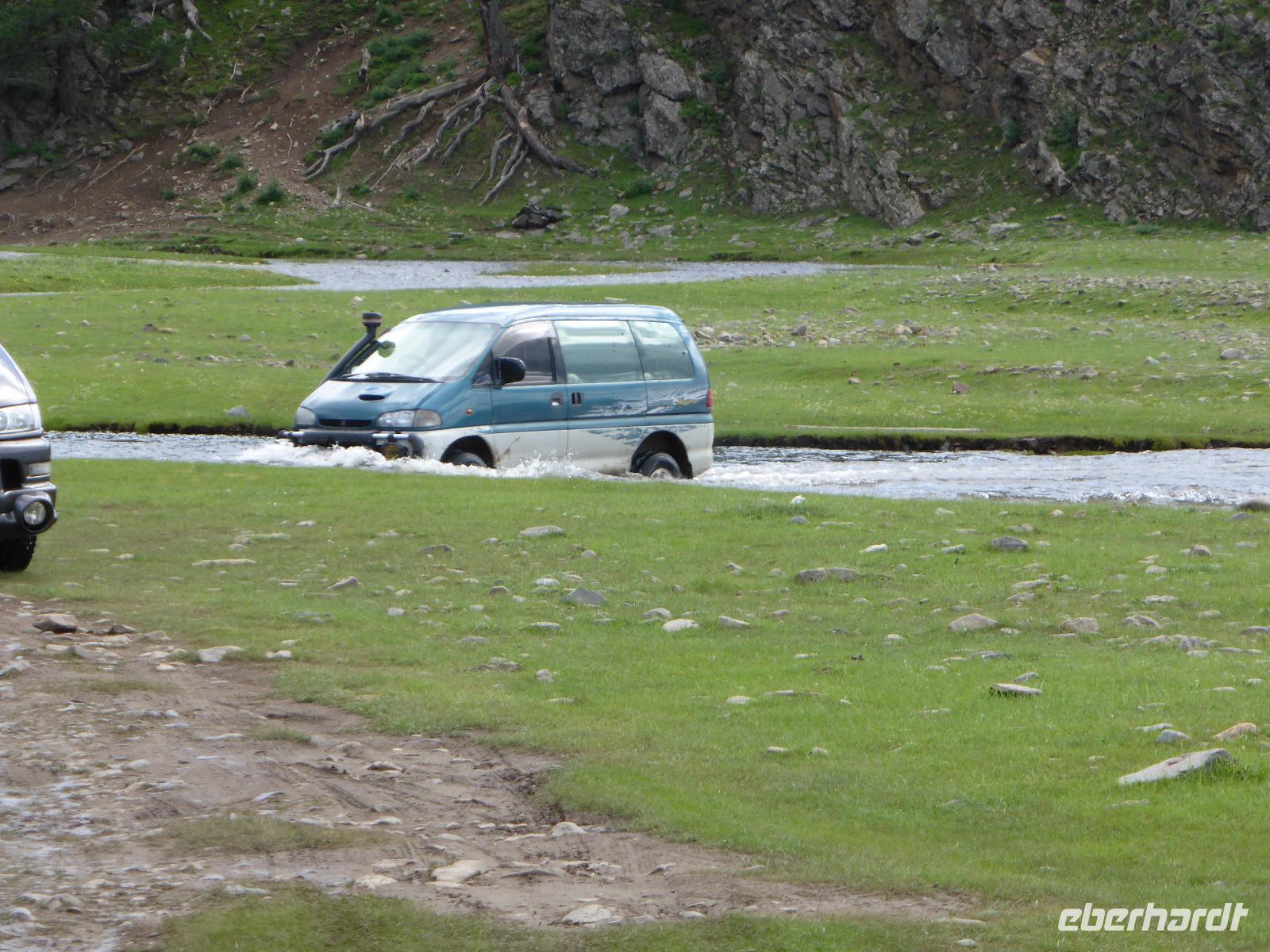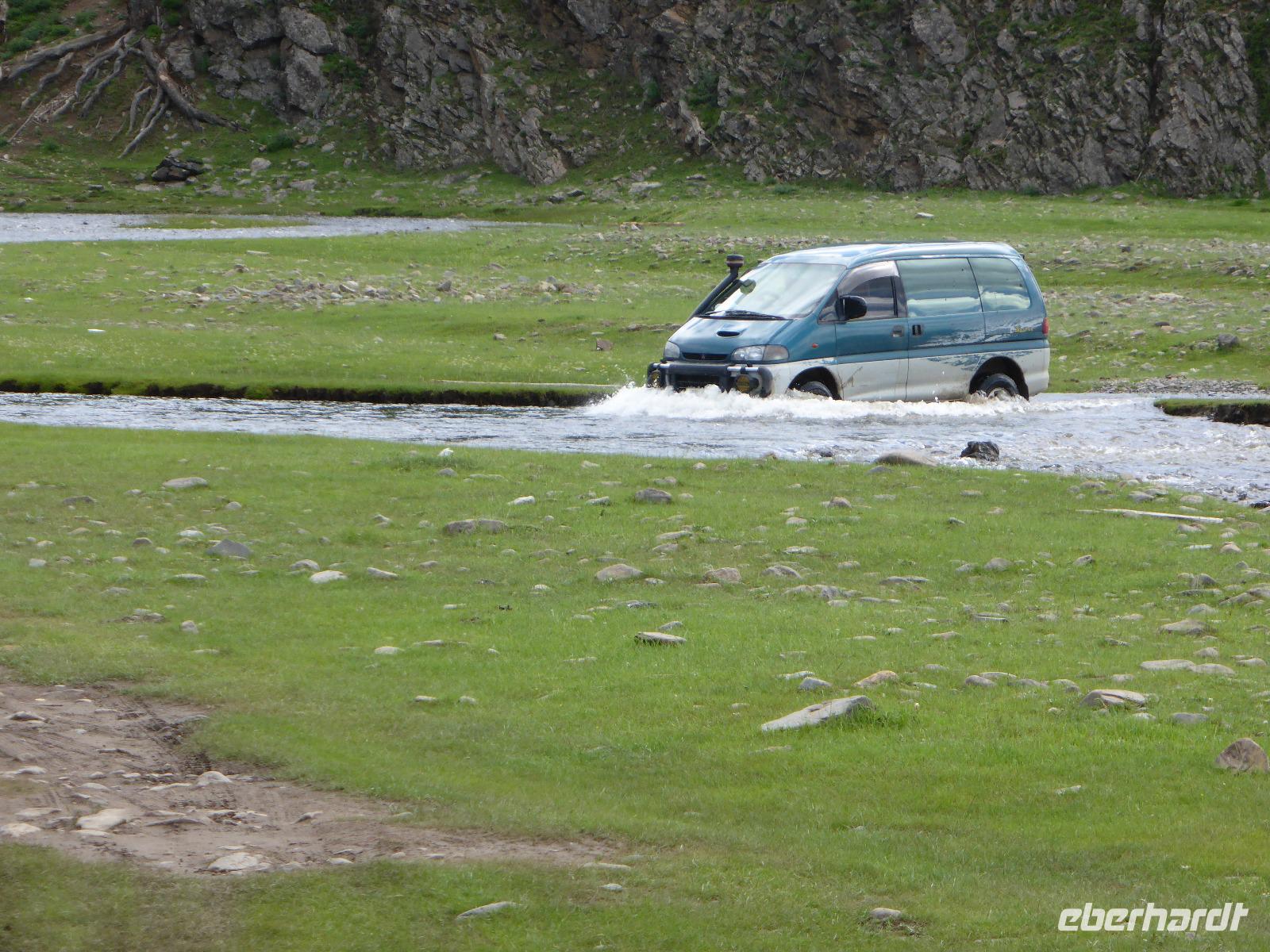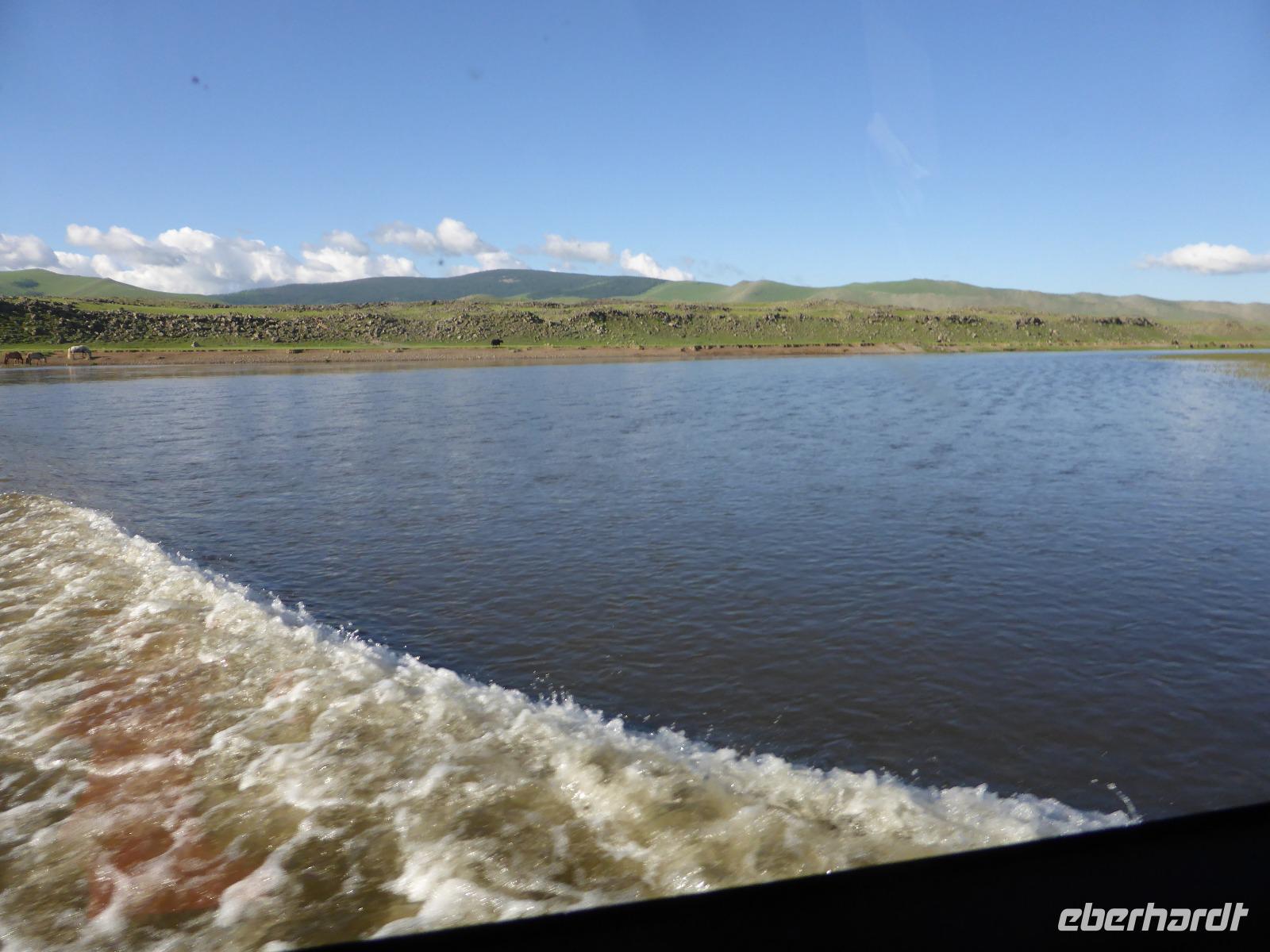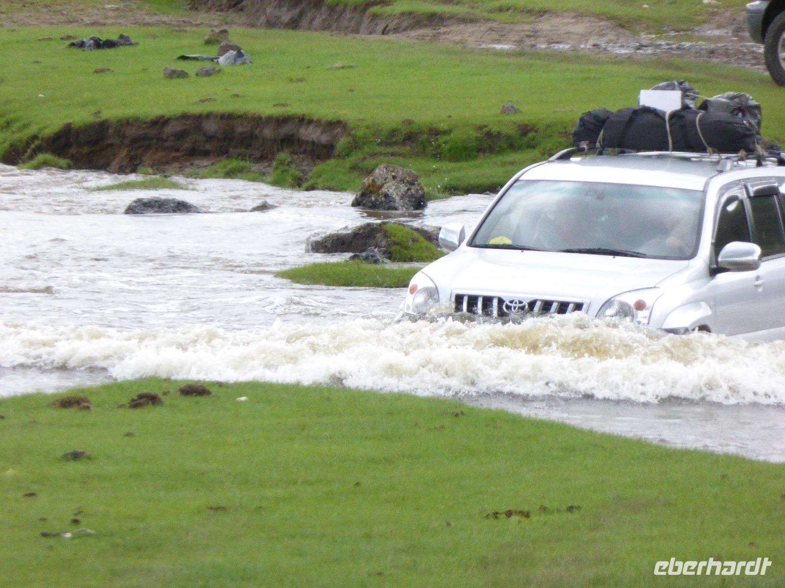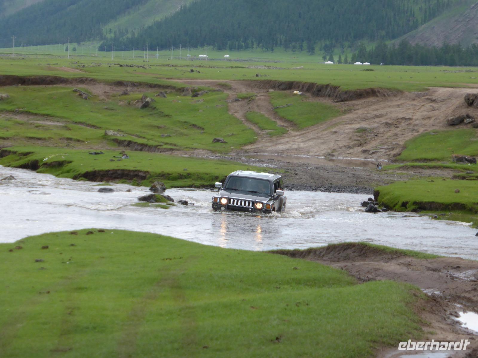 Wir werden heute in größerer Höhe übernachten. Schont fällt das Thermometer. Wir bekommen die ersten Yaks zu sehen. Und es wird abenteuerlich. Waren es bisher Rinnsale, die wir durchquert haben, sind es nun Flüsschen und Flüsse. Die Fahrer suchen den günstigsten Weg. Am Nachmittag kommen die ersten Wälder in Sicht. Angekommen sind wir nun im Oberen Orchontal. Am Nachmittag erreichen wir das Camp.