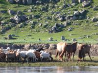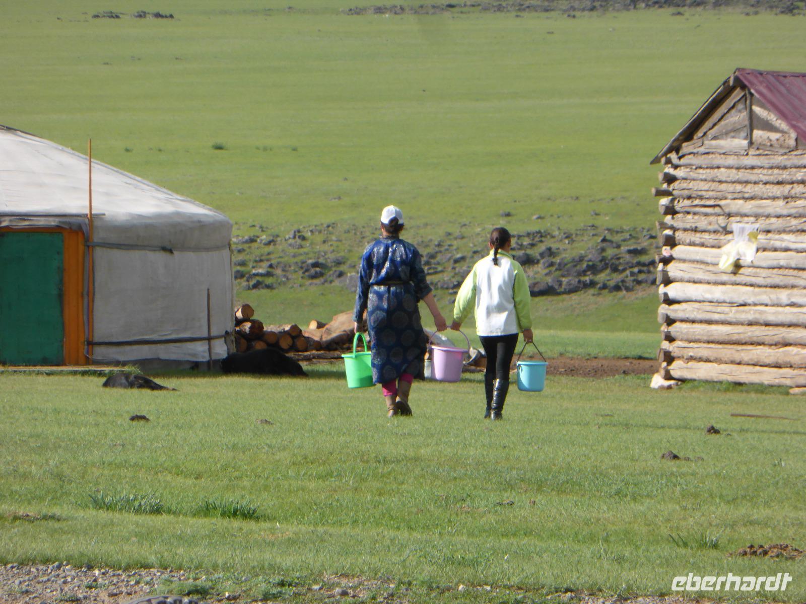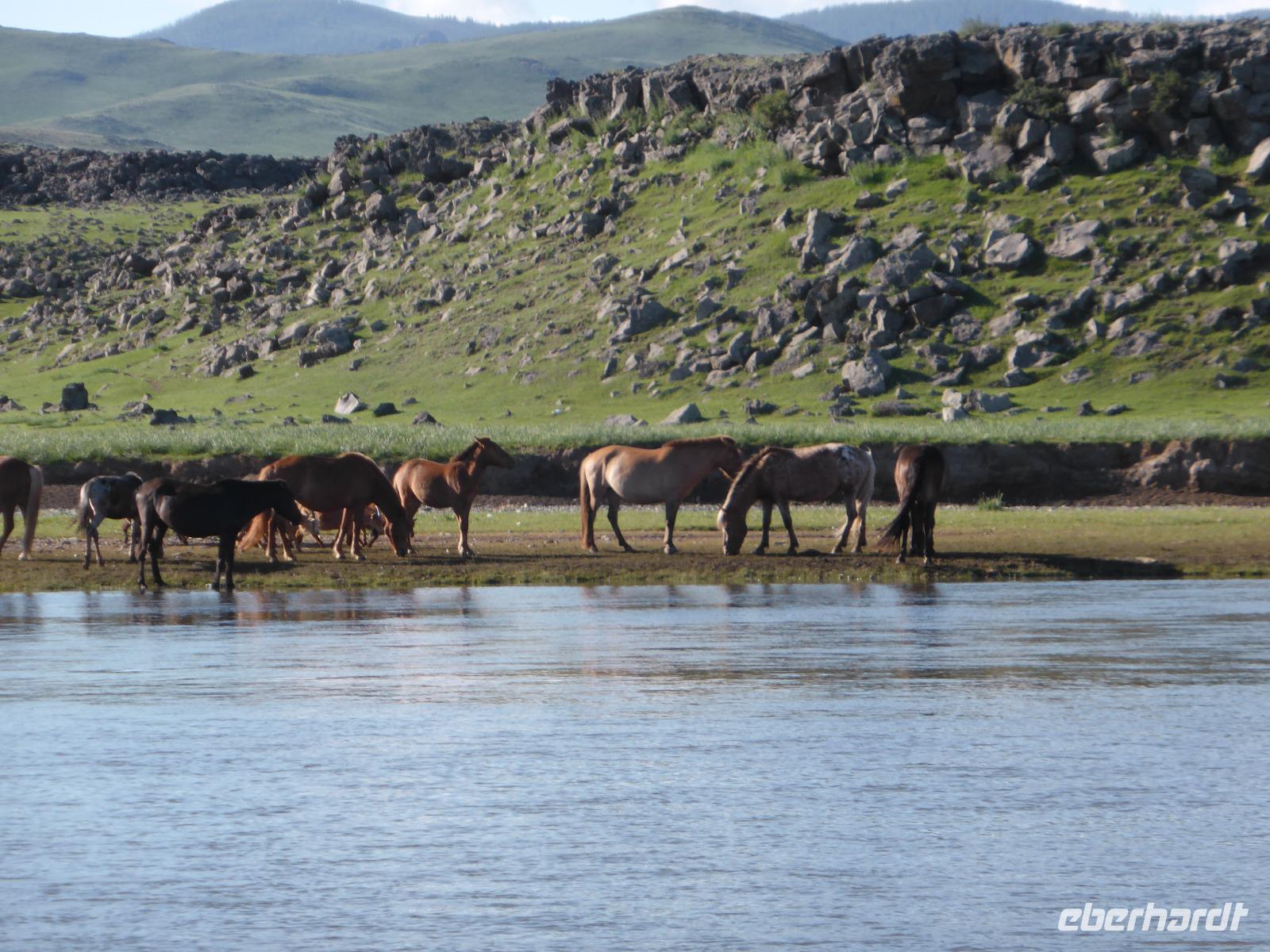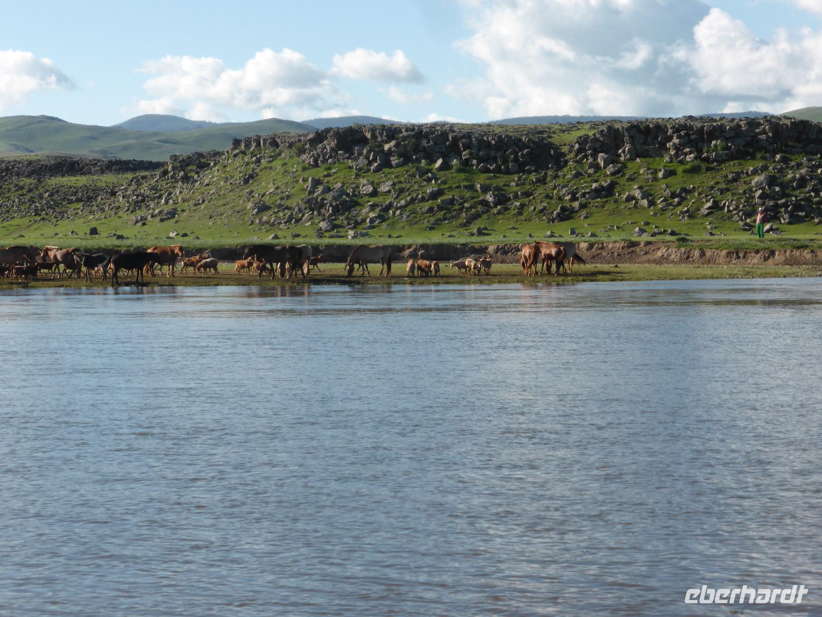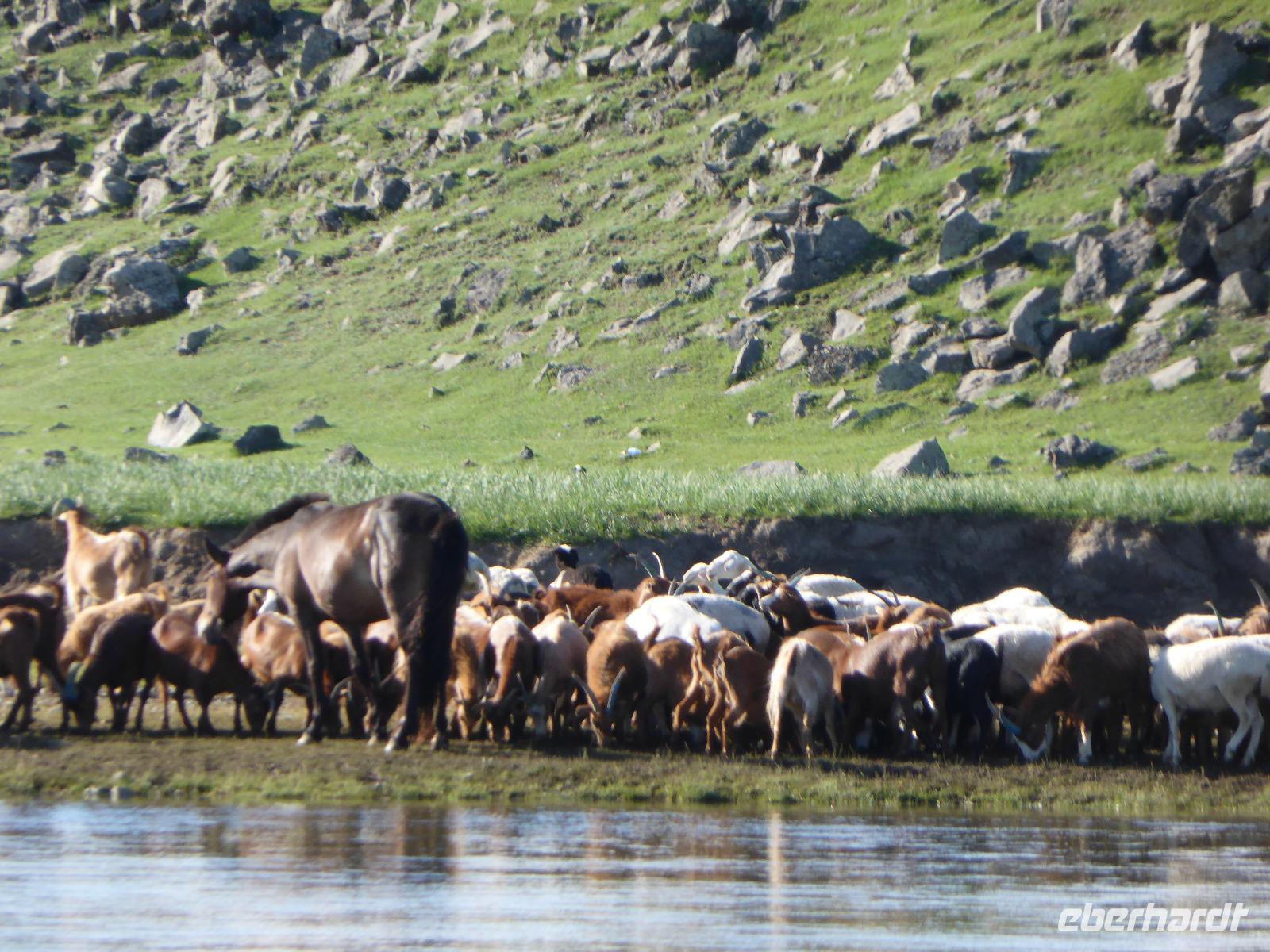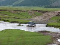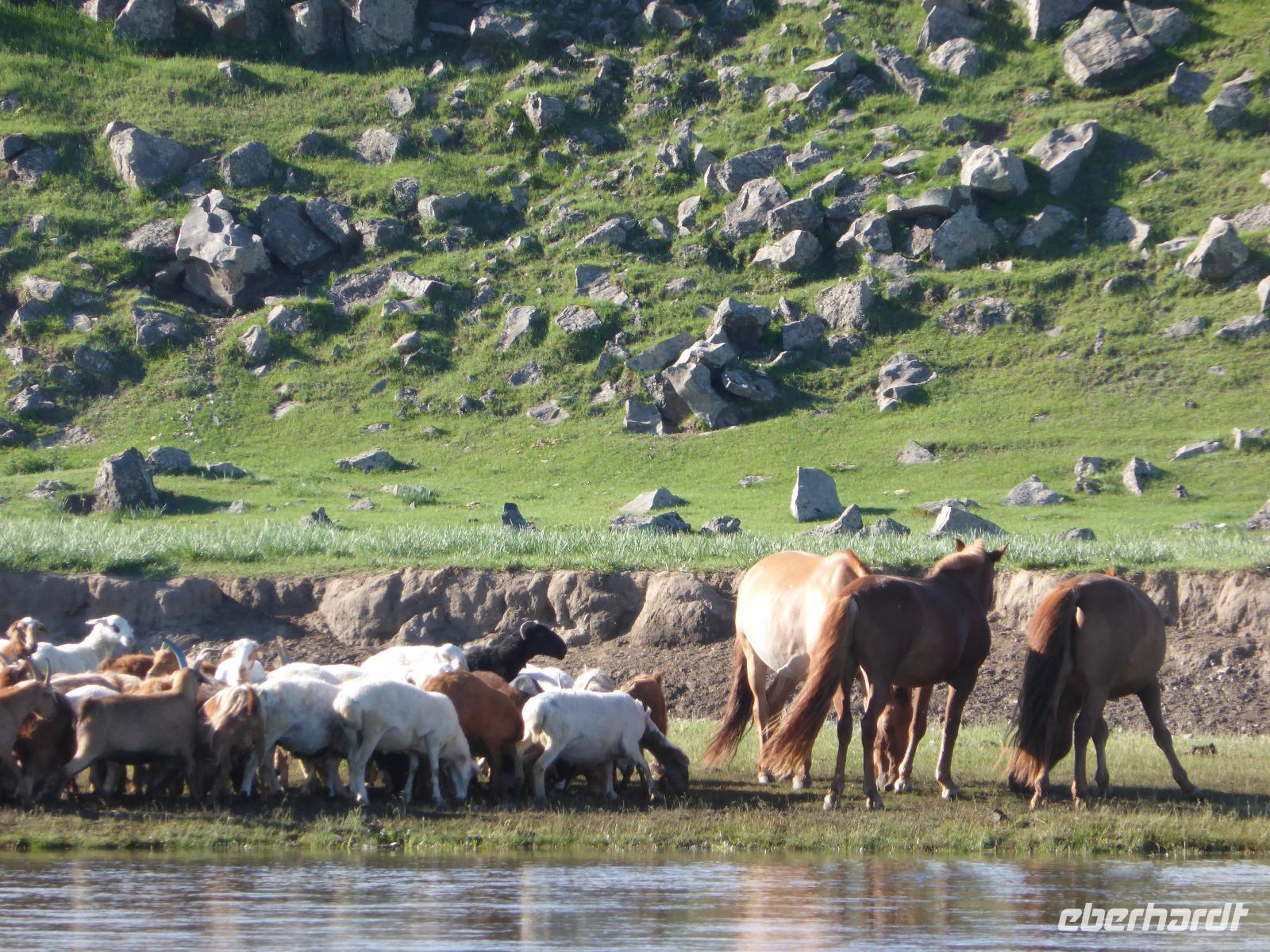 Wir werden heute in größerer Höhe übernachten. Schont fällt das Thermometer. Wir bekommen die ersten Yaks zu sehen. Und es wird abenteuerlich. Waren es bisher Rinnsale, die wir durchquert haben, sind es nun Flüsschen und Flüsse. Die Fahrer suchen den günstigsten Weg. Am Nachmittag kommen die ersten Wälder in Sicht. Angekommen sind wir nun im Oberen Orchontal. Am Nachmittag erreichen wir das Camp.