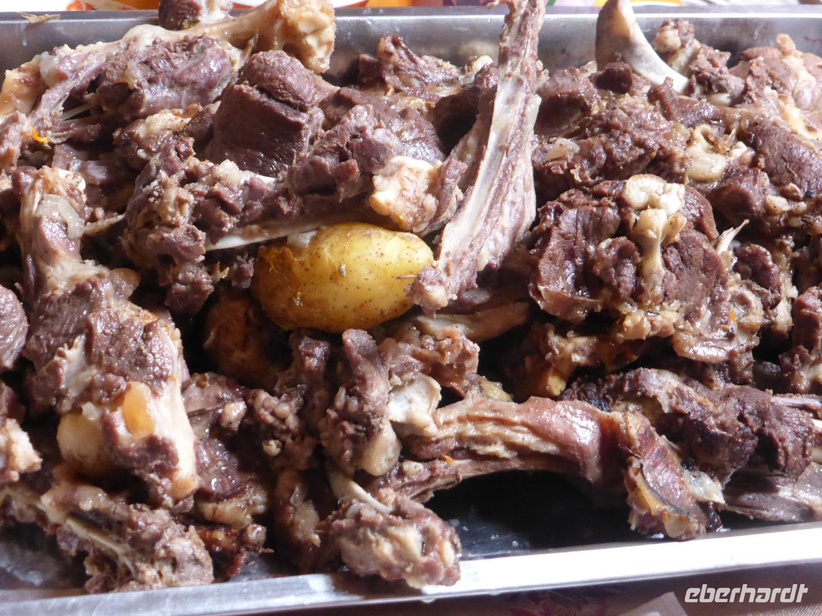 Mittagsszeit. Wir fahren in ein Barbecue-Restaurant, landestypisch das Mobilar. In den Bildschirmen an den Wänden laufen Filme über die Traditionen des Landes. Wir können uns monglische Speisen zusammenstellen und frisch zubereiten lassen. Onon empfiehlt eine typische mongolische Suppe: leicht gegrilltes Fleisch ergibt eine schmackhafte Brühe, dazu Möhren und Kartoffeln und noch ein wenig anderes Gemüse. Schmeckt.