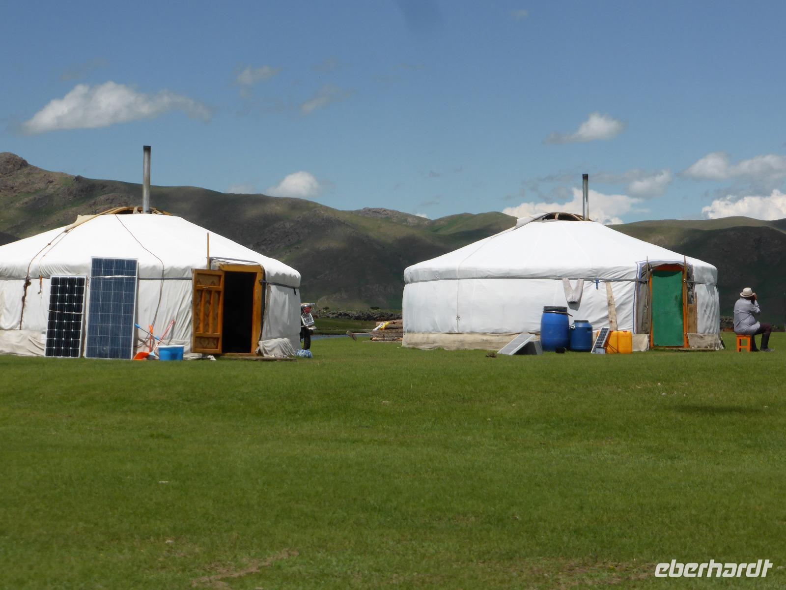 Nicht mehr weit ist es zu unserem ersten Camp. Die Mitarbeiter und Mitarbeiterinnen eilen uns entgegen, begrüßen uns befördern das Gepäck. Die Jurten werden vergeben. Neugierig schauen wir uns darin um. Licht und Strom aus Wand wird es abends geben. Wir richten uns ein.
