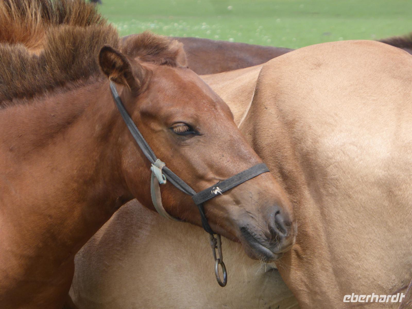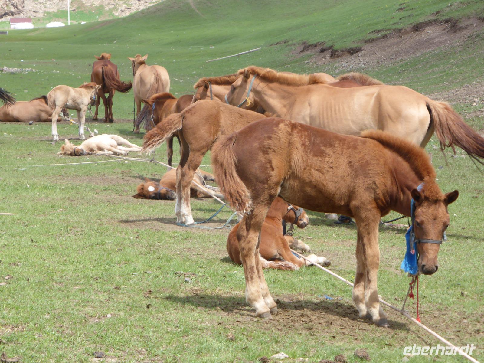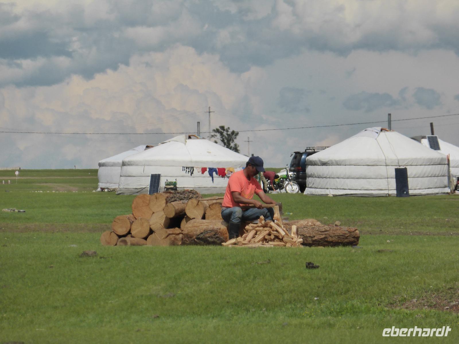 Ziemlich kühl heute. Wir passieren das Tor zum Orkhon Valley Nationalpark und fahren entlang des Orkhon-Flusses. Es hatte geregnet und es ist sehr beschwerlich zu fahren. Wir werden durchgeschüttelt. Aber machen wunderschöne Beobachtungen: Yaks ziehen am Fluß entlang. Nomadenfamilien dicht an dicht. Pferdeherden. Der Höhepunkt der bechwerlichen Fahrt ist eine breite tiefe Wasserstelle. Das Wasser läuft fast in den Motorraum der Fahrzeuge. Immer wenn eines in die Fluten fährt, halten Die draußen den Atem an. Wir gehen zum Wasserfall. Mittagessen gibt es bei einer jungen Nomadenfamilie. Mongolischer Ziegentopf. Die Zubereitungsart ist spannend. Für die Nachspeise steht auch Marmelade von Gut und Günstig auf dem Tisch. Das Beste aber kommt zum Schluss: die Schüssel mit den Innereien wird hereingetragen. Unsere Fahrer regen uns an zu kosten. Und wir befinden danach: das war das Beste von Allem. Köstlich. Wir wollen noch nicht zurückfahren. Die Campingstühle aus den Autos kommen wieder zum Einsatz. Die Bäuche voll, sitzen wir mitten auf der Wiese vor den Jurten, schwatzen, lassen die Seele baumeln. Beobachten, dass man auch im Sitzen Holz hacken kann, beobachten, wie der alte Mann Stunde um Stunde vor der Jurte sitzt und vor sich hin sinnt. Fotographiert werden auf seinem bunten Hockerchen möchte er nicht. Einer unserer Fahrer leistet ihm eine Weile Gesellschaft und sie unterhalten sich. Pferde mit ihren Fohlen befinden sich gleich in der Nähe. Jungen reiten vorbei. Das Naadam-Fest mit den Pferderennen steht kurz bevor.