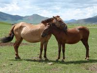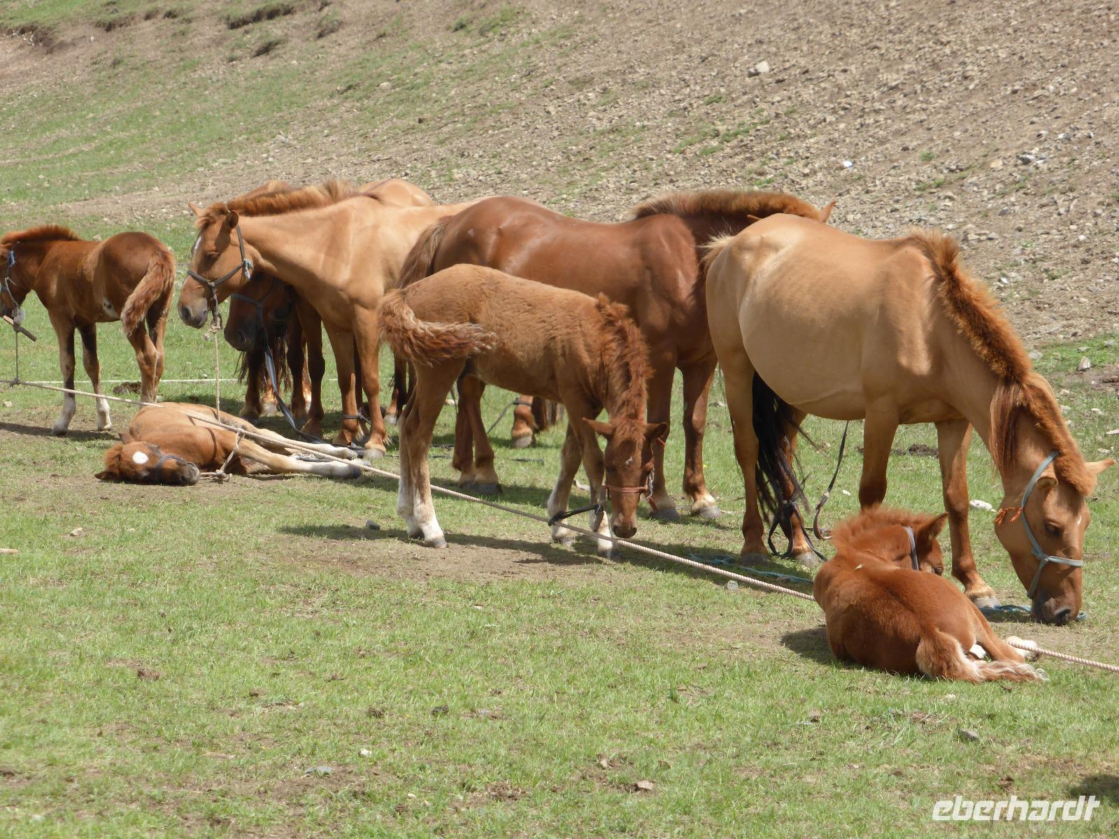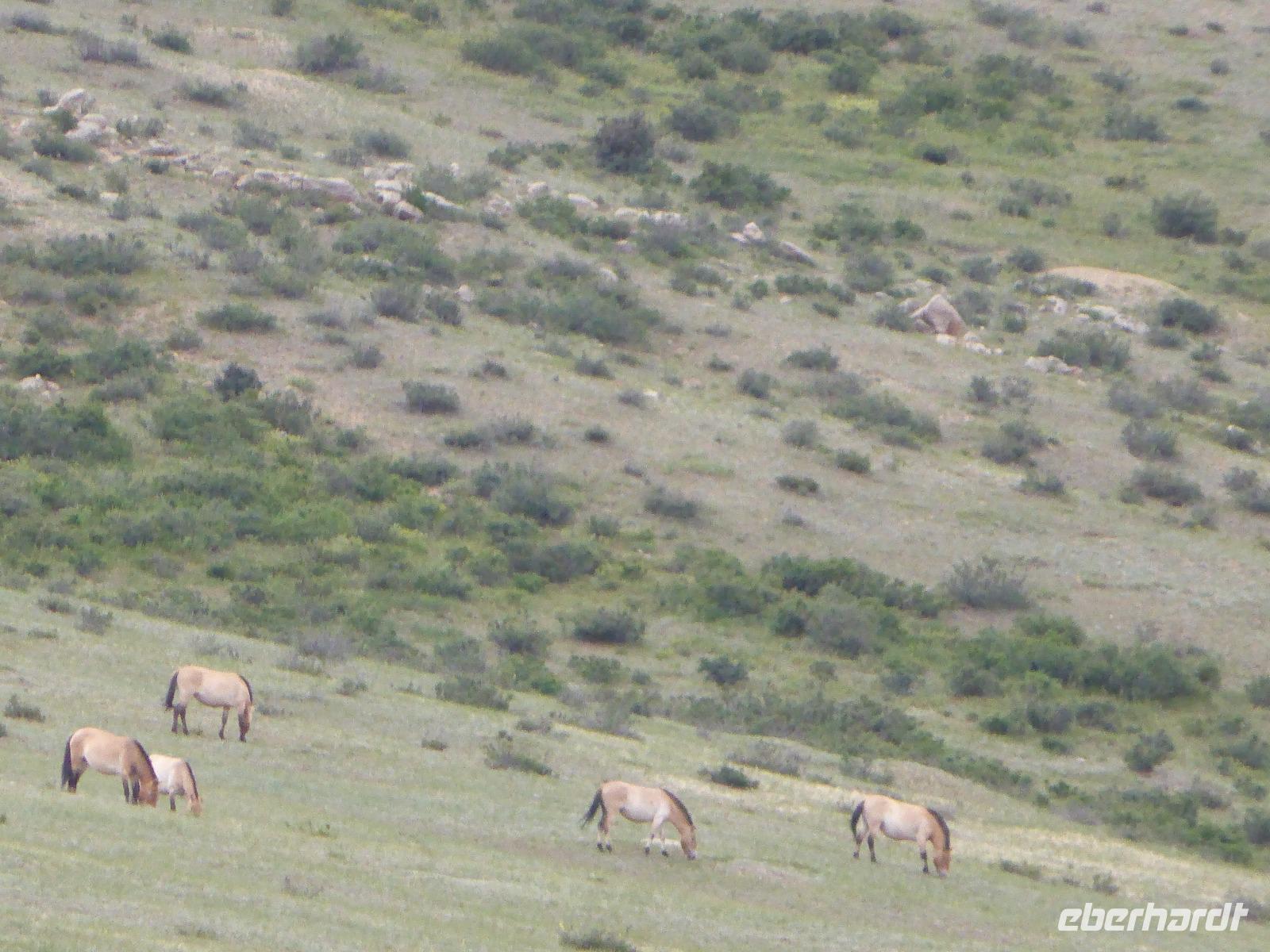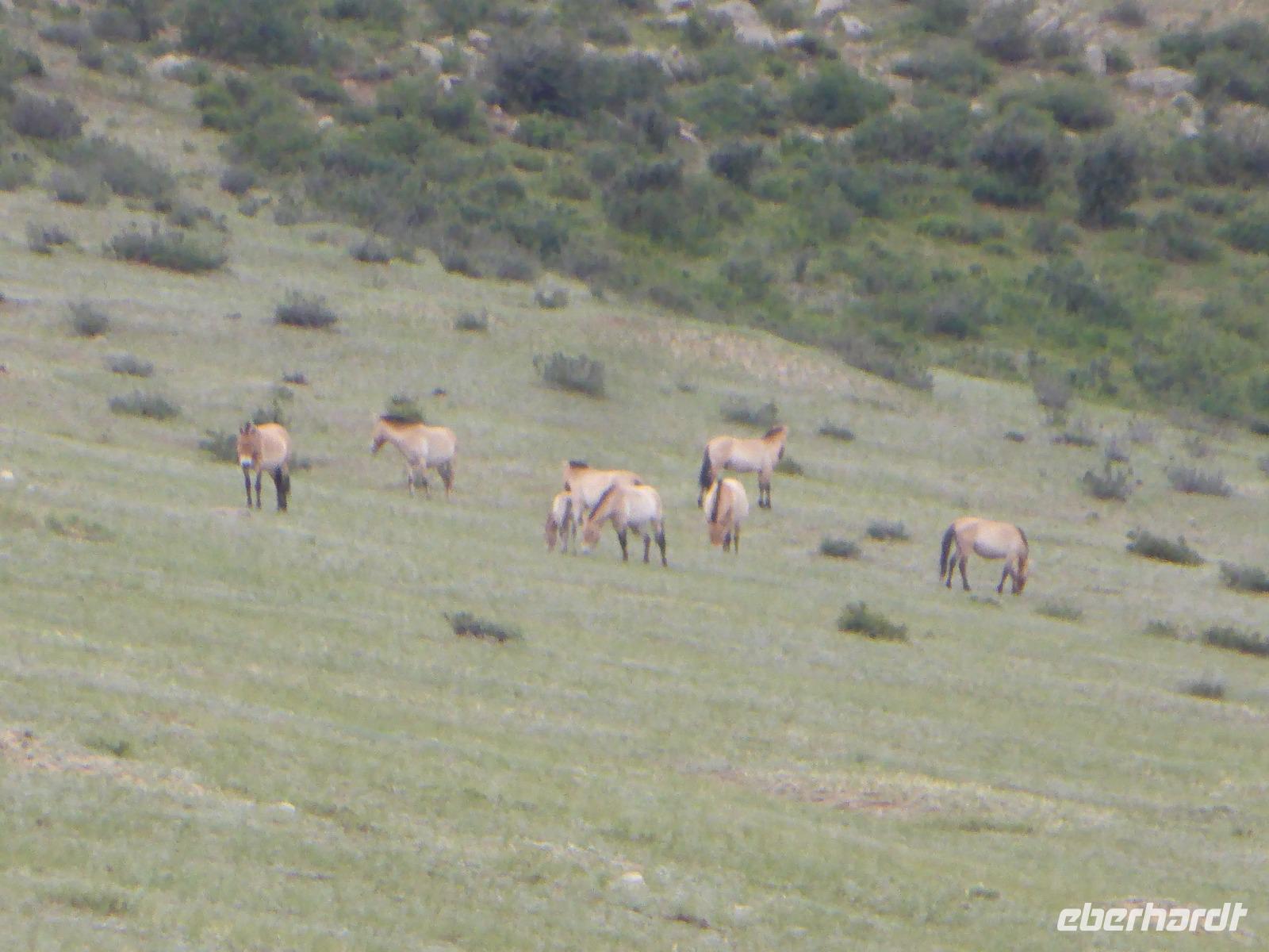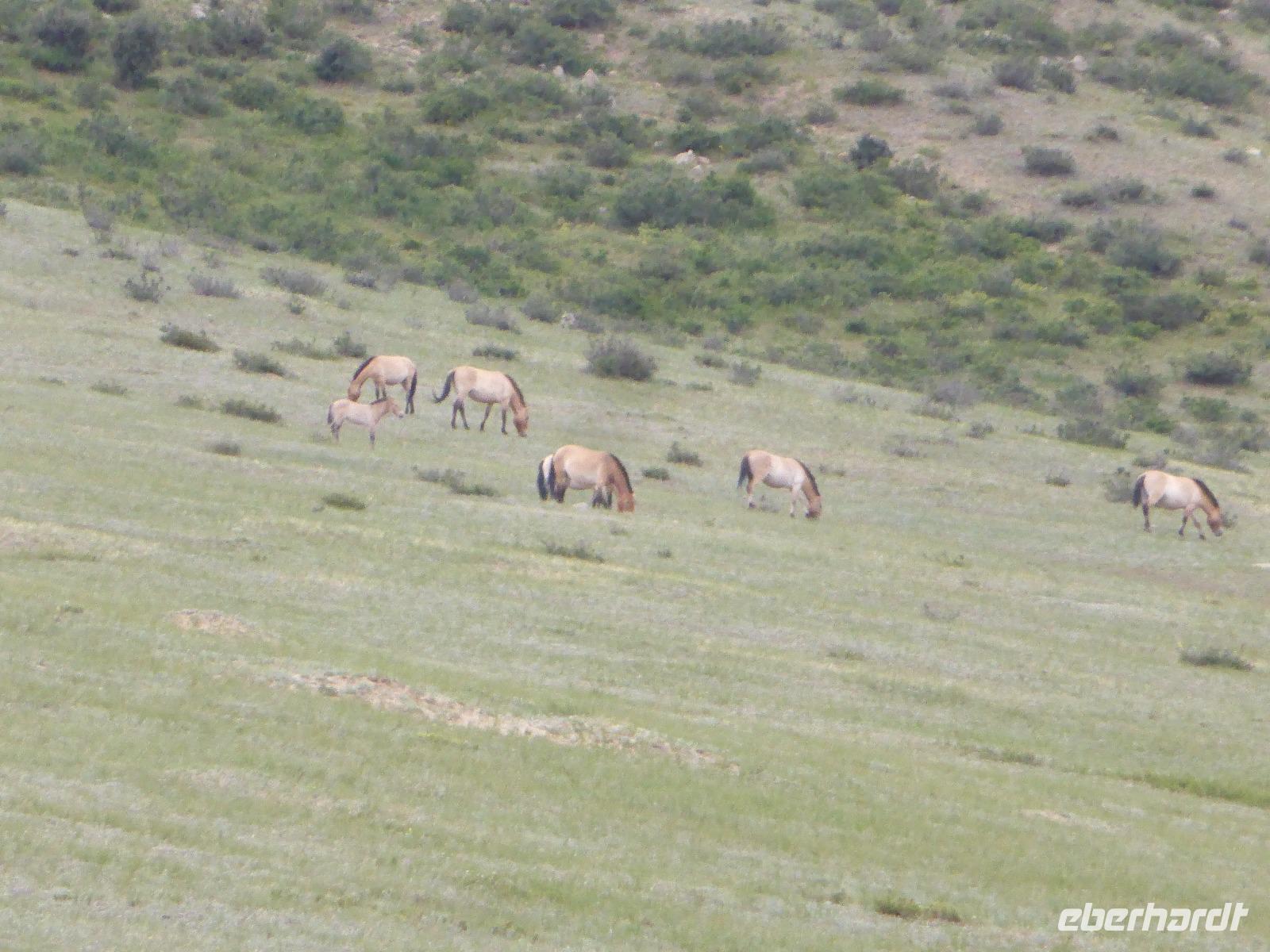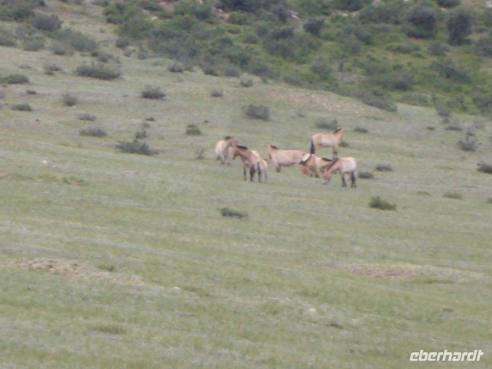 Gegen Abend erreichen wir den Hustai-Nationalpark. Und haben Glück. Wie andere Besucher auch bekommen wir eine kleine Herde von Przewalski-Pferden zu sehen.