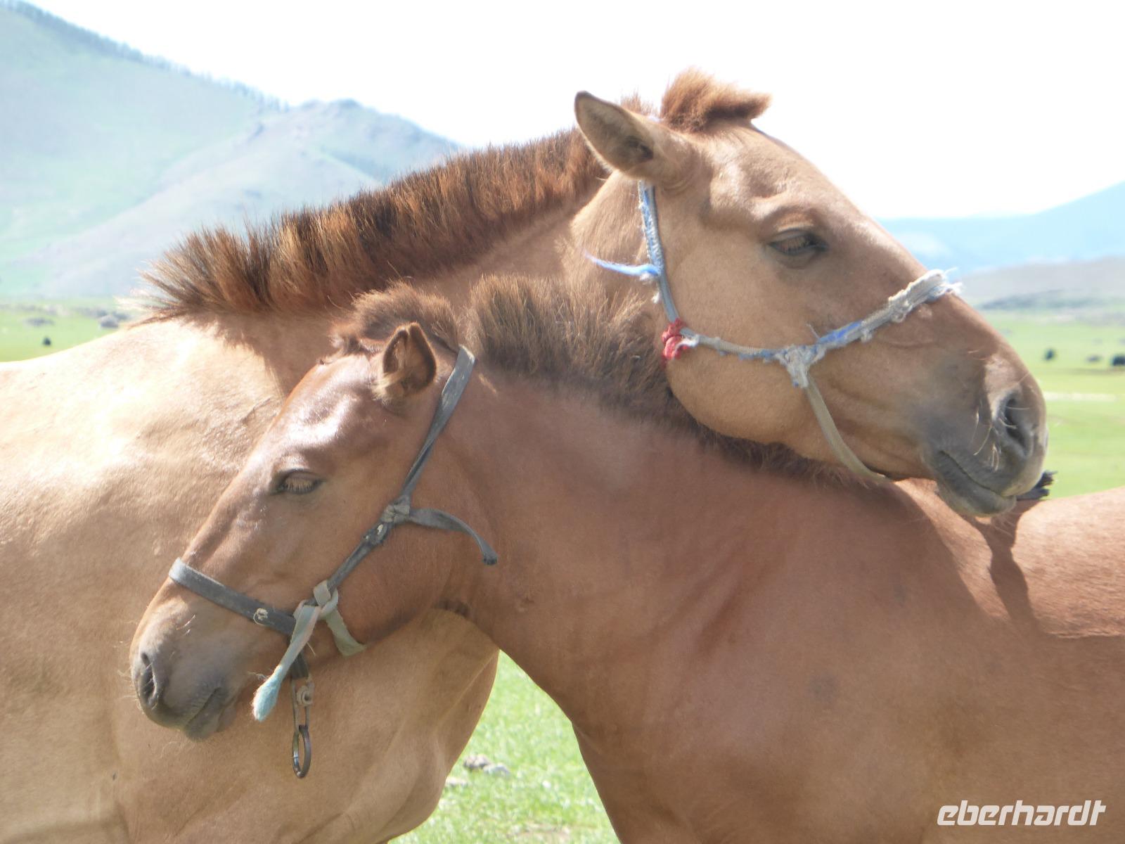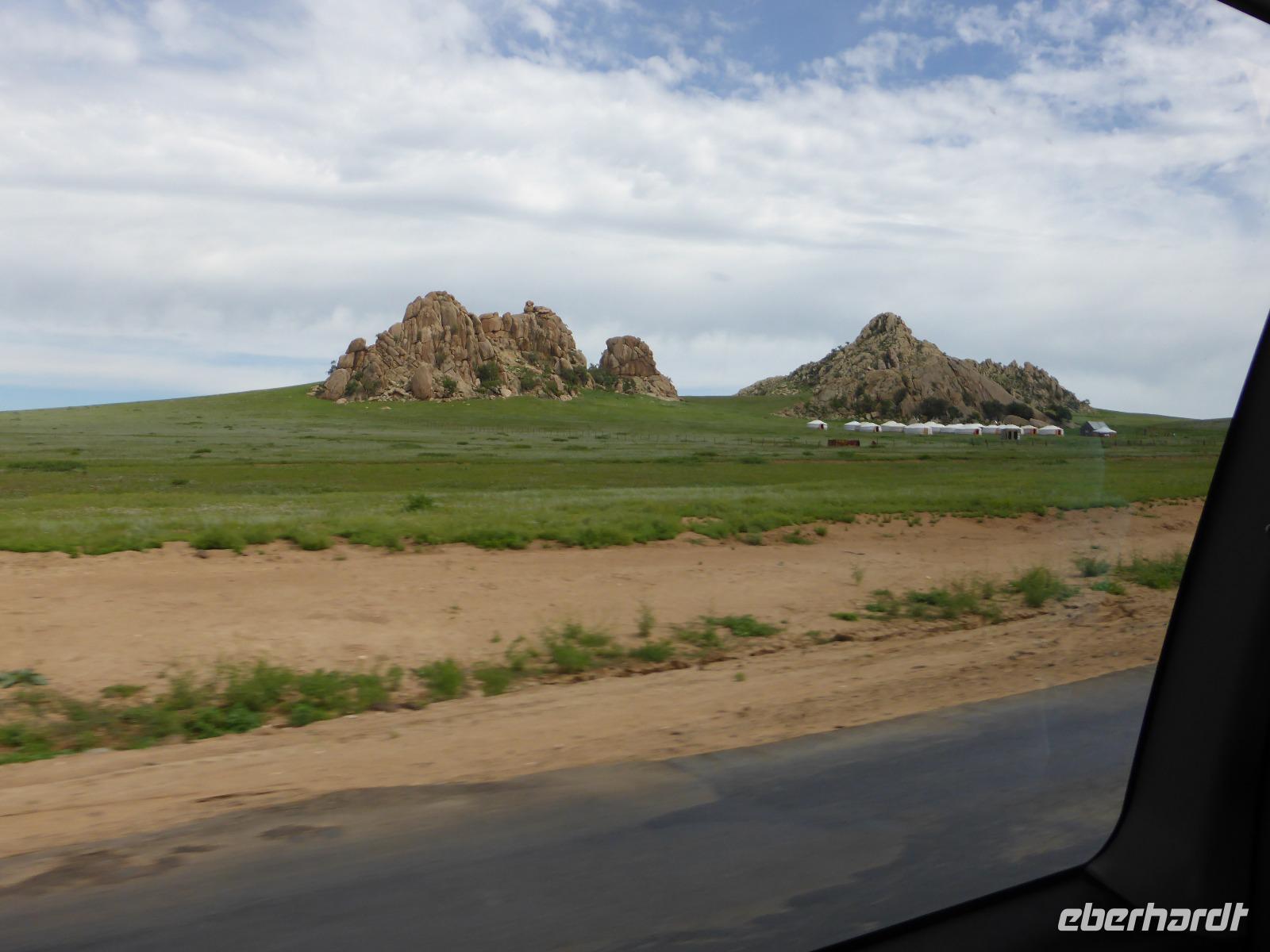 Wir verlassen nun auch das Randgebiet der Stadt. Rechts und links zu sehen erste Nomaden mit zwei bis drei Jurten, in der Nähe ihre Tiere. Unweit meist ein Fluss. Pferde. Sie stehen dicht gedrängt, stecken die gesenkten Köpfe zusammen. Das spendet Schatten. Nach knapp zwei Stunden ein Stopp an einem Ovo. Ein- bis dreimal im Uhrzeigersinn drumherum zu laufen, bringt Glück für die Reise. Weiterfahrt und neue Eindrücke. Steppenadler. Kraniche. Kamele. Vereinzelt nur, denn die Vegetation hier ist nicht üppig. Die Wiesen sind in Steppengras übergegangen.
