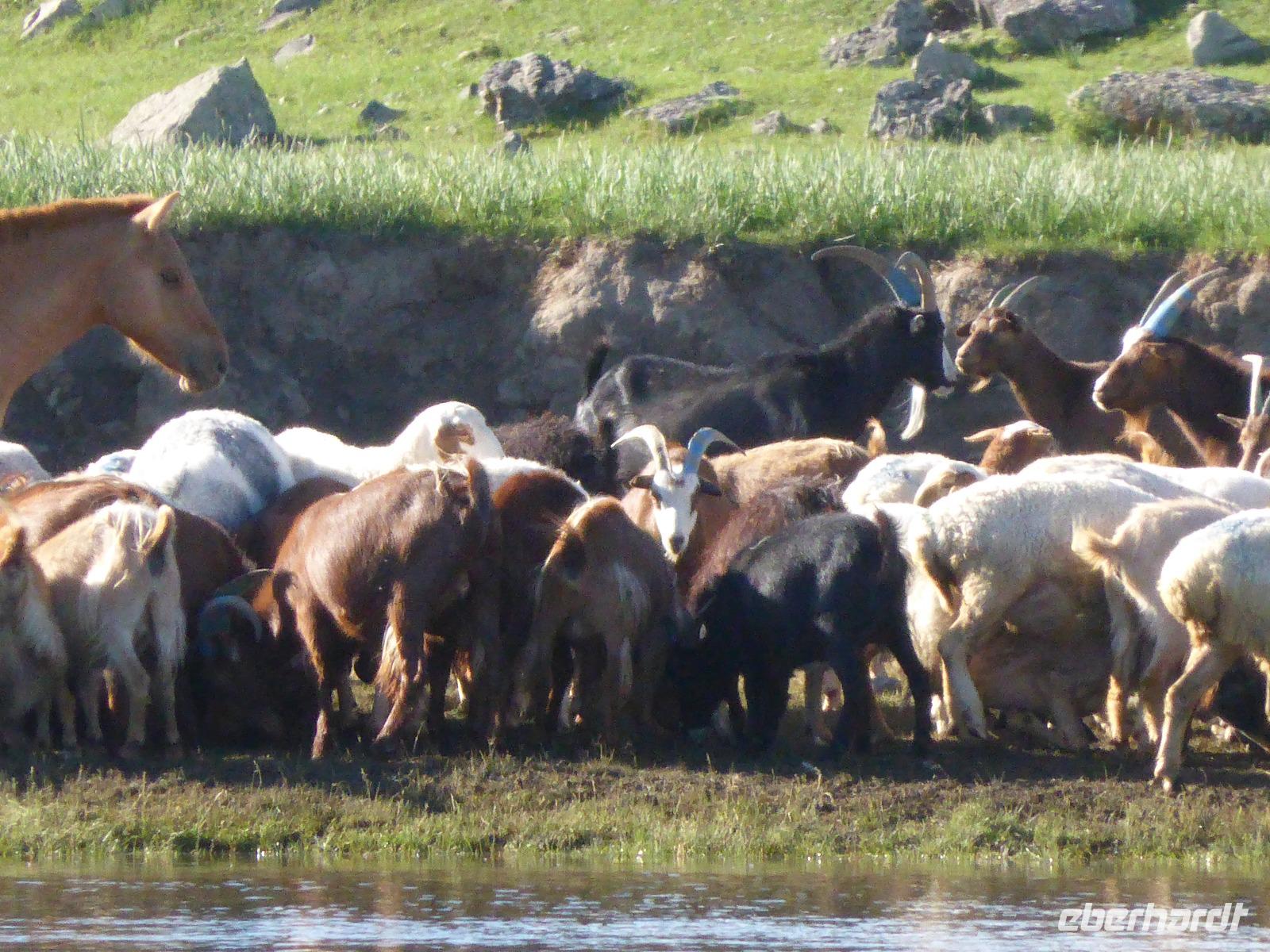 Eine riesige Ziegenherde! Tausend Tiere in Etwa. Meine Güte, so viele. Wir steigen aus und nähern uns vorsichtig. Die Tiere halten sich vorwiegend in der Nähe einer Tränke auf. Haben Durst. Es ist kein Wasser drin. Schon schauen sich einige Gäste hilfesuchend nach einem Wasserhahn um. Etwas abseits, neben einem Motorrad hocken ein älterer Mann mit mongolischer Kleidung und eine Frau auf der Erde. Sie beobachten uns. Schweigen. Er raucht. Die Reisebegleiterin stellt den persönlichen Kontakt her. Onjo, der alte Nomade, ist freundlich, möchte wissen, woher wir kommen. Gerne lässt er sich fotographieren. Wir bedanken uns. Die Beiden gehen mit zur Wassertränke und prüfen, wie es um die zur Verfügung stehende Wassermenge steht. Hier ist ein Oberflächenbrunnen und erst genügend Wasser muss sich ansammeln, um alle Tiere versorgen zu können. Möglicherweise uns zum Gefallen stellen sie die Pumpe an und es läuft Wasser in die Tränke. Na das ist ein Gedränge und Gewusel. Es kommen bei diesem ersten Versuch nicht alle zum Zuge. Für uns war es ein Erlebnis, den Tieren so nah zu sein und in den Alltag der Nomaden schauen zu können. Kaum sind wir weitergefahren, sehen wir an die sieben Gazellen in hohem Tempo davonlaufen.