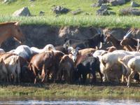 Geschafft. Die Landschaft rechts und links der Straße flach. Einöde? Mongolische Landschaft! Vereinzelt Tiere. Kühe mit Jungtieren, Ziegen und Pferde, auch gemischt. Die Landschaft wird hügeliger. Kein Grün. Tiere stehen auf dem Kamm eines Hügels und es wirkt wie ein Scherenschnitt. Eine Kuhherde wartet an einem Brunnen. Auf einem Motorrad kommt ein Mongole herangefahren. Nicht auf einem Pferd herangaloppiert. Die Zeiten haben sich geändert in der Mongolei.