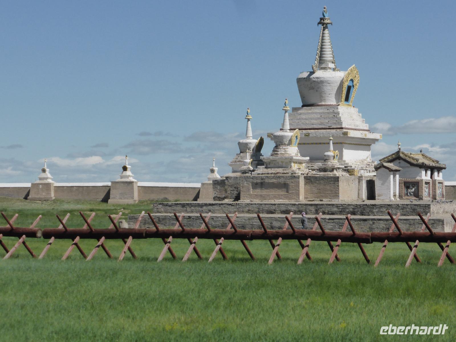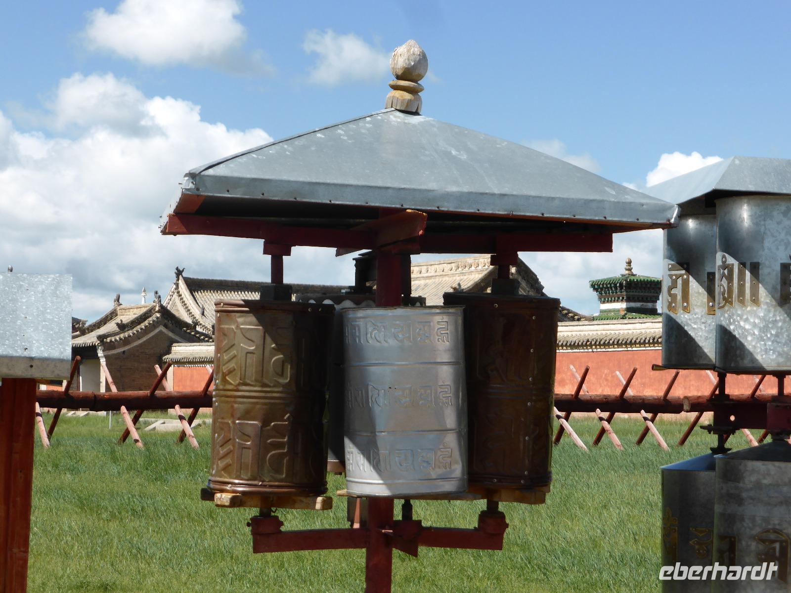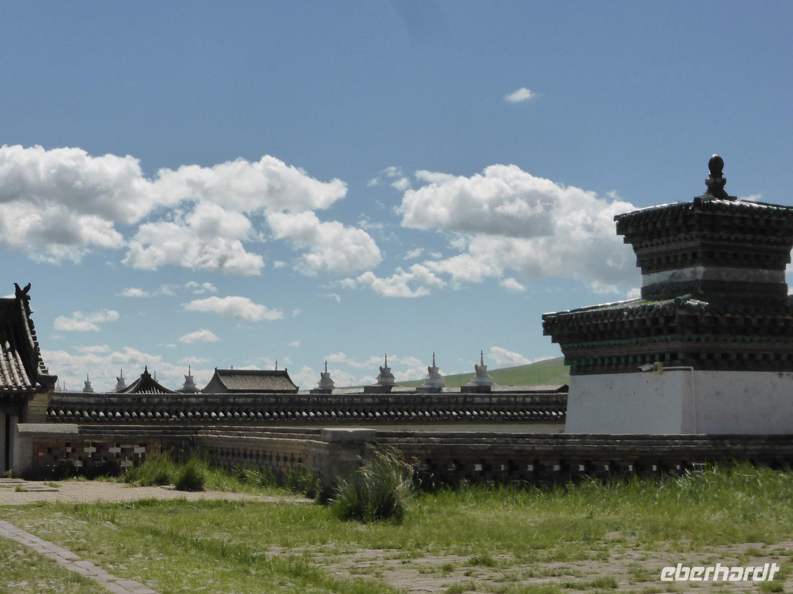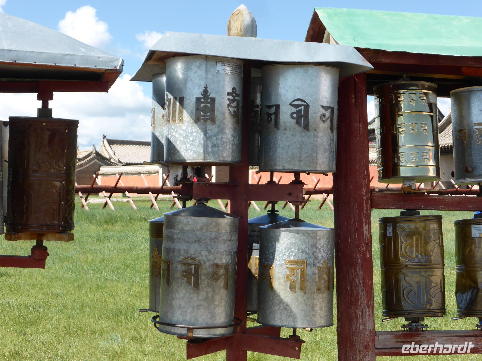 Das Bild wandelt sich. Nun türmen sich große Felsbrocken rechts und links der Piste auf. Monolithgestein. Ein Junge in mongolischer Tracht treibt mit seinem Pferd eine Ziegenherde gekonnt in die gewünschte Richtung. Wir erreichen die Stadt Harhorin, früher hieß sie Karakorum, wurde zerstört und später wieder aufgebaut. Nur die Steinerne Schildkröte stammt noch aus der dmaligen Zeit. Am Ortsrand befindet sich die beiendruckende Anlage des Erdene-Zuu-Klosters. Ausgiebig besichtigen wir das Kloster. Sambaga erklärt ausführlich. Jetzt in den Morgenstunden werden die Gläubigen zum Gebet gerufen. Wir können die Prozedur beobachten oder beiwohnen.