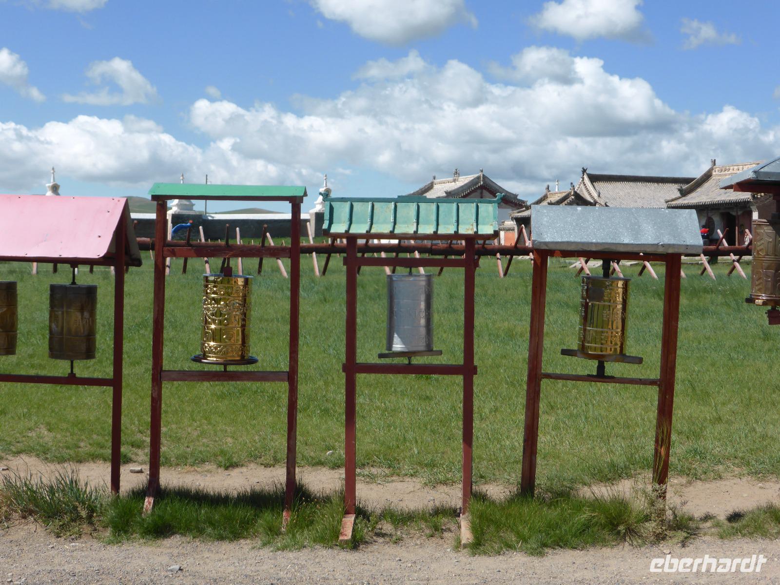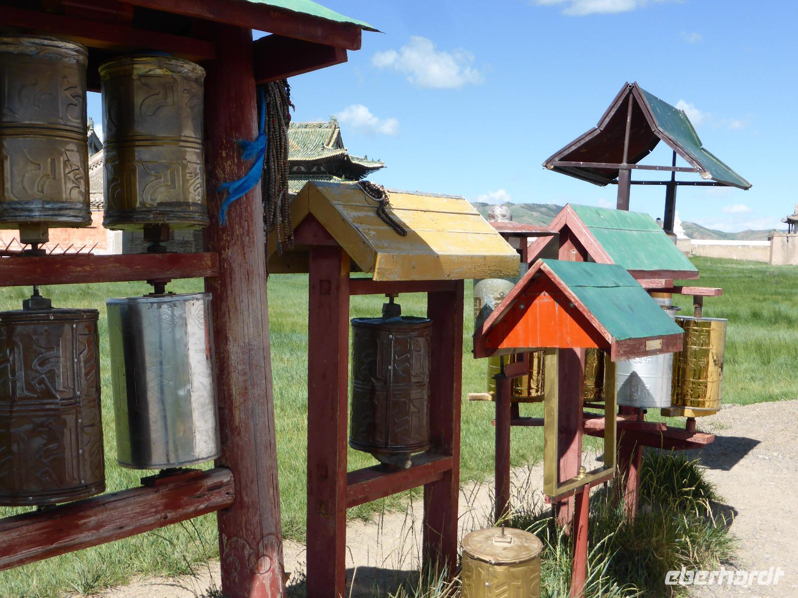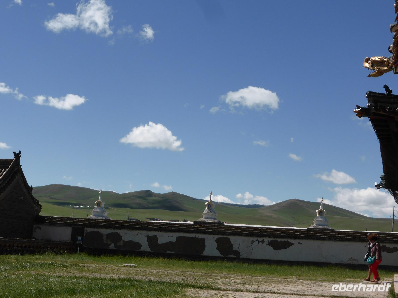 Das Bild wandelt sich. Nun türmen sich große Felsbrocken rechts und links der Piste auf. Monolithgestein. Ein Junge in mongolischer Tracht treibt mit seinem Pferd eine Ziegenherde gekonnt in die gewünschte Richtung. Wir erreichen die Stadt Harhorin, früher hieß sie Karakorum, wurde zerstört und später wieder aufgebaut. Nur die Steinerne Schildkröte stammt noch aus der dmaligen Zeit. Am Ortsrand befindet sich die beiendruckende Anlage des Erdene-Zuu-Klosters. Ausgiebig besichtigen wir das Kloster. Sambaga erklärt ausführlich. Jetzt in den Morgenstunden werden die Gläubigen zum Gebet gerufen. Wir können die Prozedur beobachten oder beiwohnen.