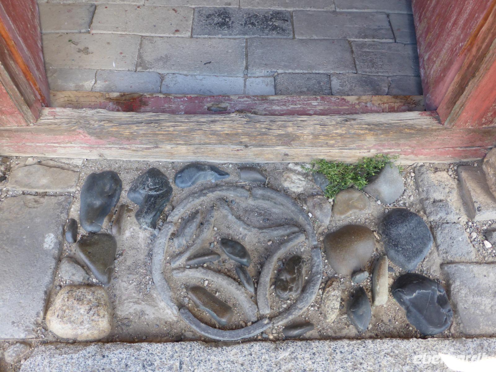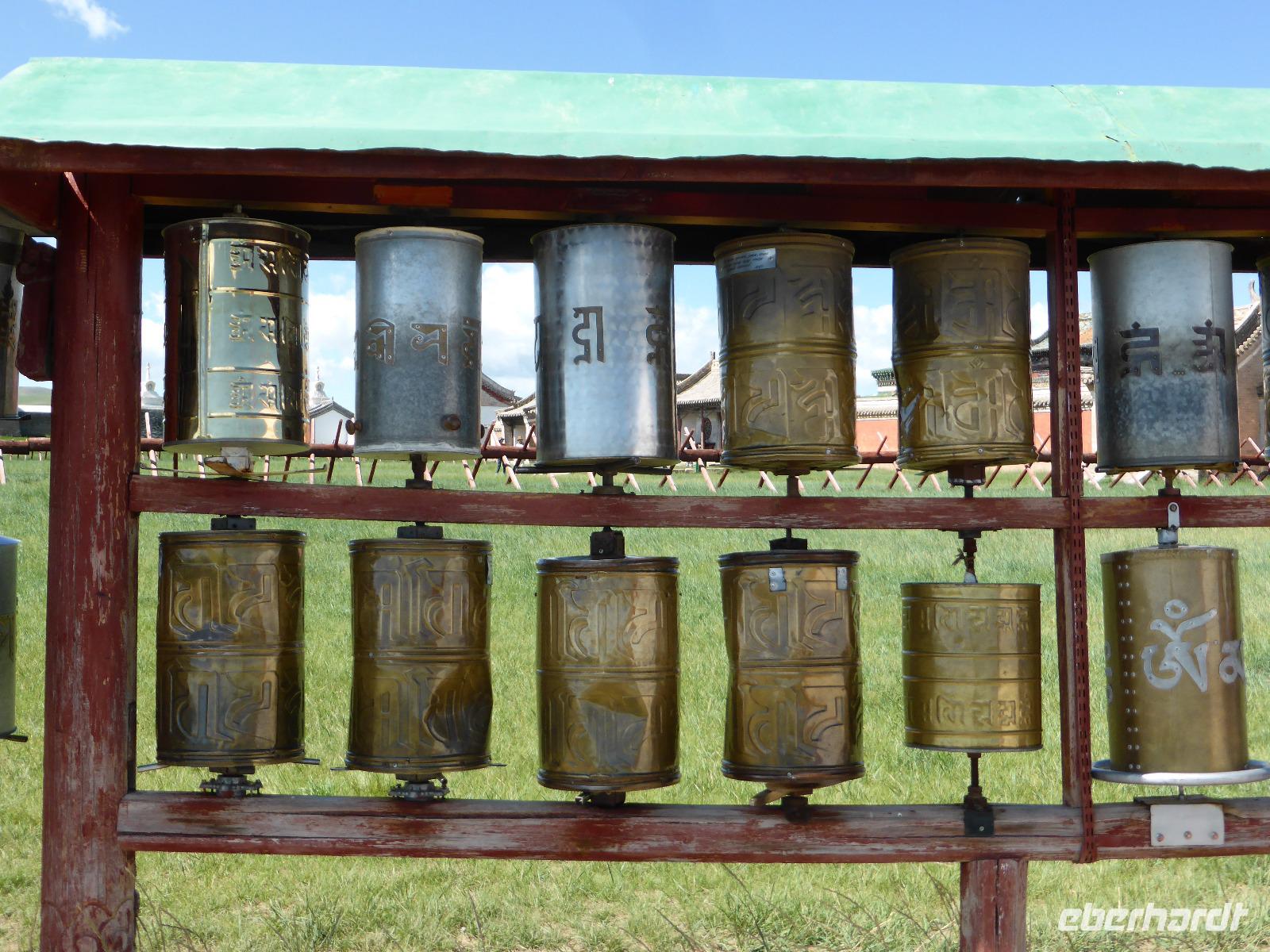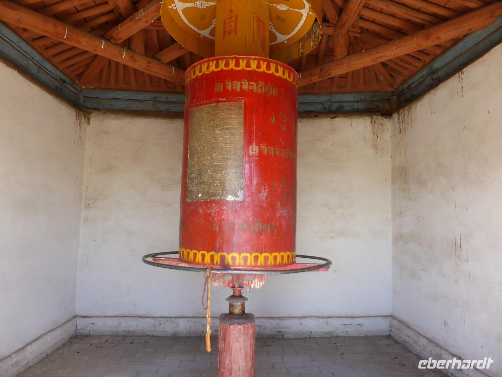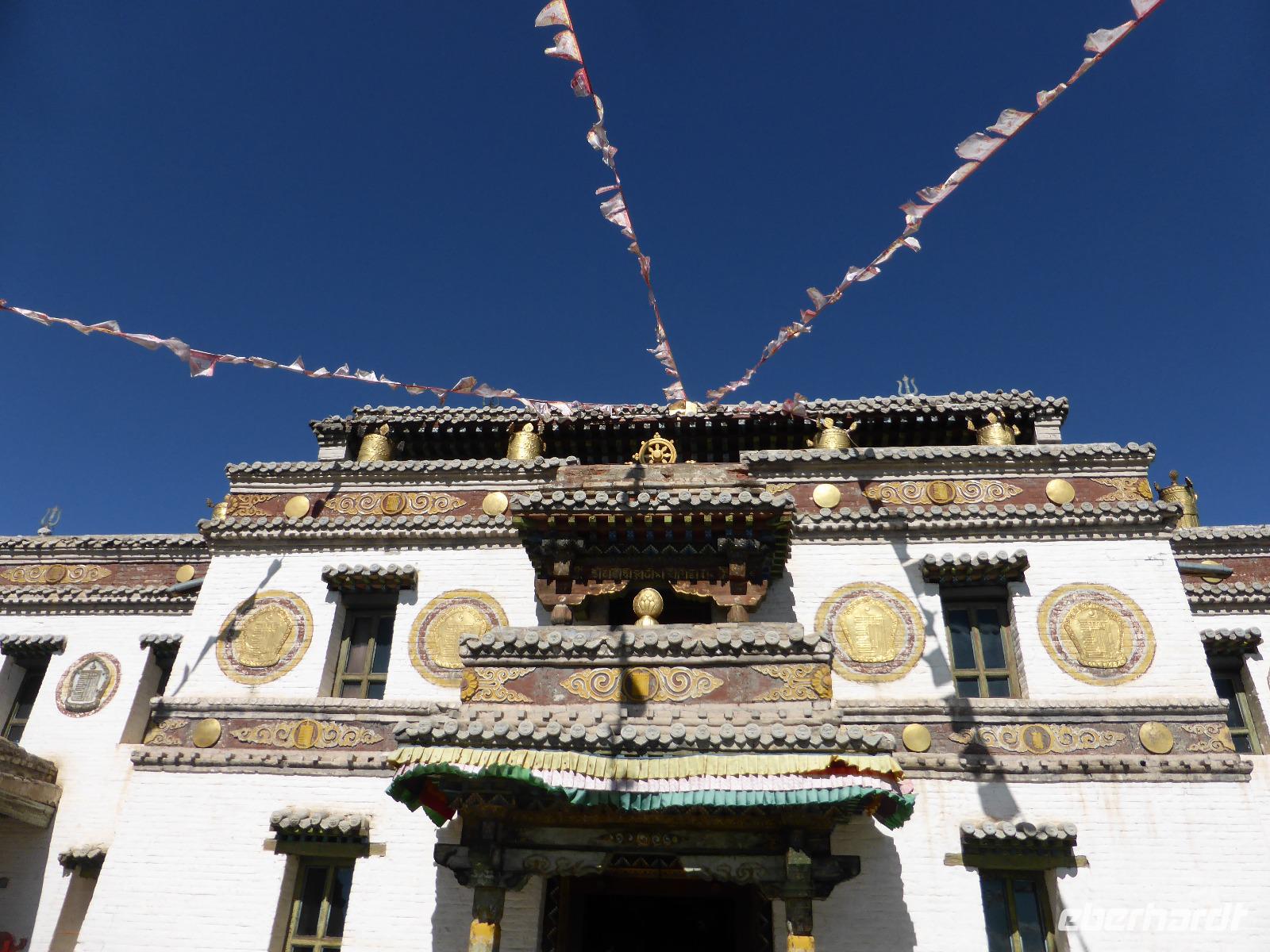 Das Bild wandelt sich. Nun türmen sich große Felsbrocken rechts und links der Piste auf. Monolithgestein. Ein Junge in mongolischer Tracht treibt mit seinem Pferd eine Ziegenherde gekonnt in die gewünschte Richtung. Wir erreichen die Stadt Harhorin, früher hieß sie Karakorum, wurde zerstört und später wieder aufgebaut. Nur die Steinerne Schildkröte stammt noch aus der dmaligen Zeit. Am Ortsrand befindet sich die beiendruckende Anlage des Erdene-Zuu-Klosters. Ausgiebig besichtigen wir das Kloster. Sambaga erklärt ausführlich. Jetzt in den Morgenstunden werden die Gläubigen zum Gebet gerufen. Wir können die Prozedur beobachten oder beiwohnen.