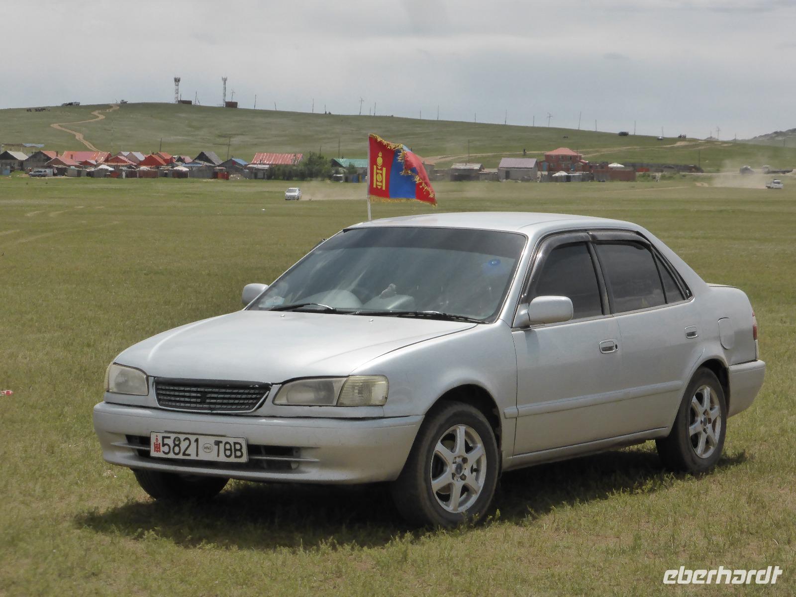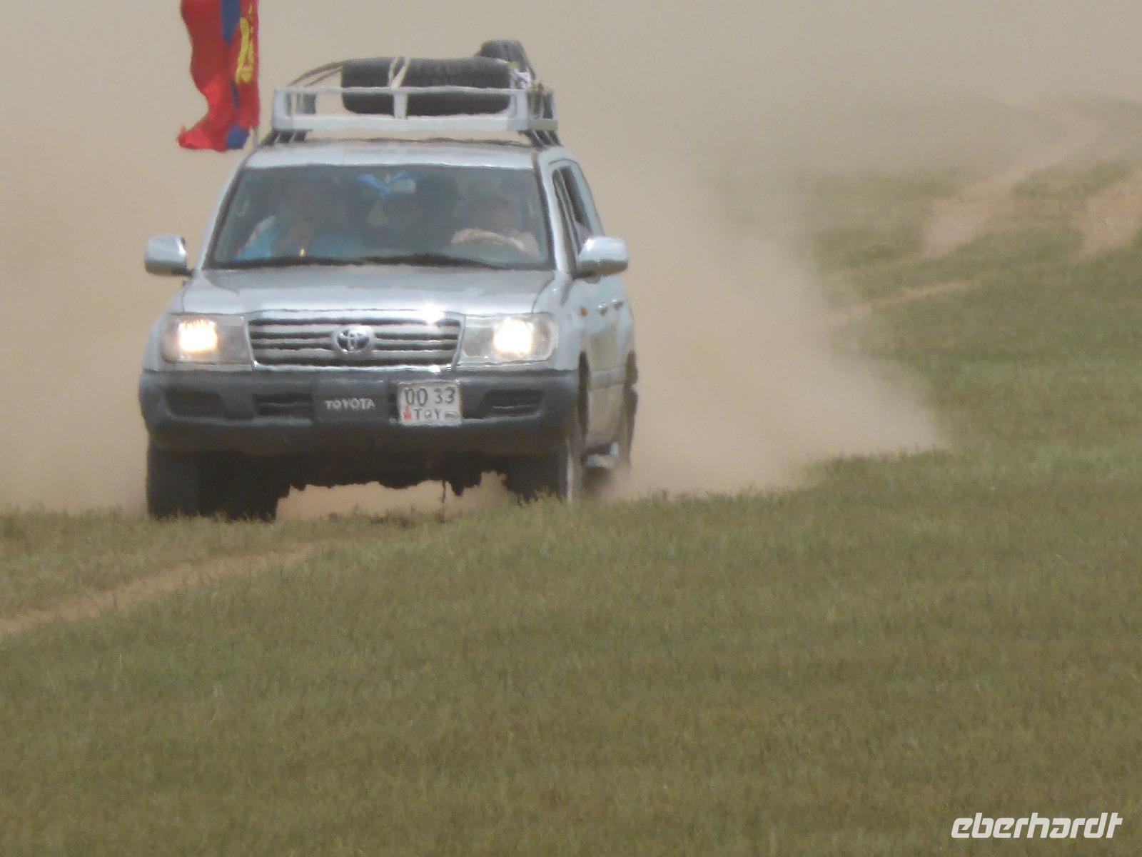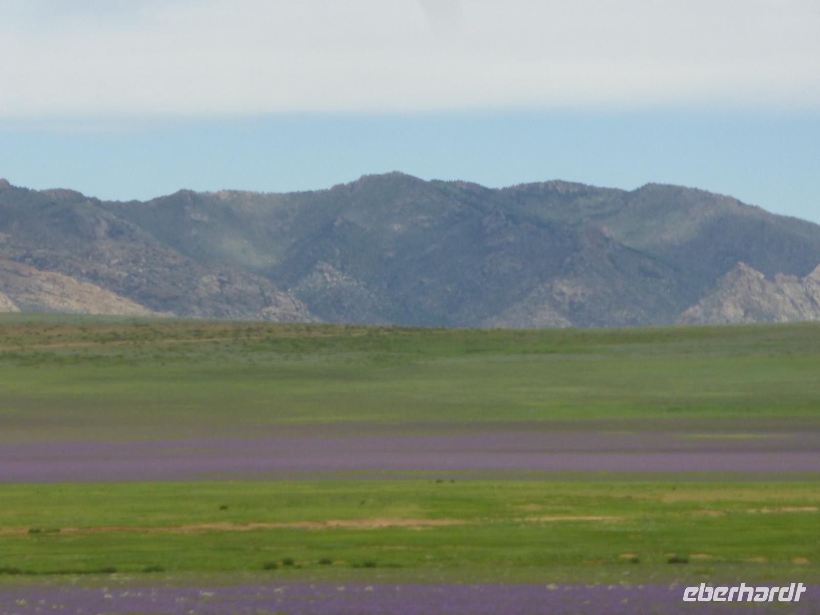 Die Wüste lassen wir hinter uns. Steppenlandschaft jetzt. Ein grüner Flaum breitet sich aus. Schon sehen wir eine größere Tierherde von Ziegen und Schafen. Der mongolische Hirtenhund hält sie zusammen. Das Gras wird üppiger. Es verdunkelt sich der Himmel. Und nun regnet es, zum ersten Mal, seit wir da sind. Tiere stehen eng zusammen, regungslos. Es scheint öfter zu regnen hier, kleine Oberflächenseen sind geblieben. War es in den Tagen zuvor Staub, den die Fahrzeuge aufgewirbelt haben, ist es heute Wasser. So sehen die Autos nun auch aus. Der Steppe tuts gut, sie wird grüner und grüner. Weitaus mehr Tiere finden hier Futter. Die ersten Steppenblümchen sind zu sehen.