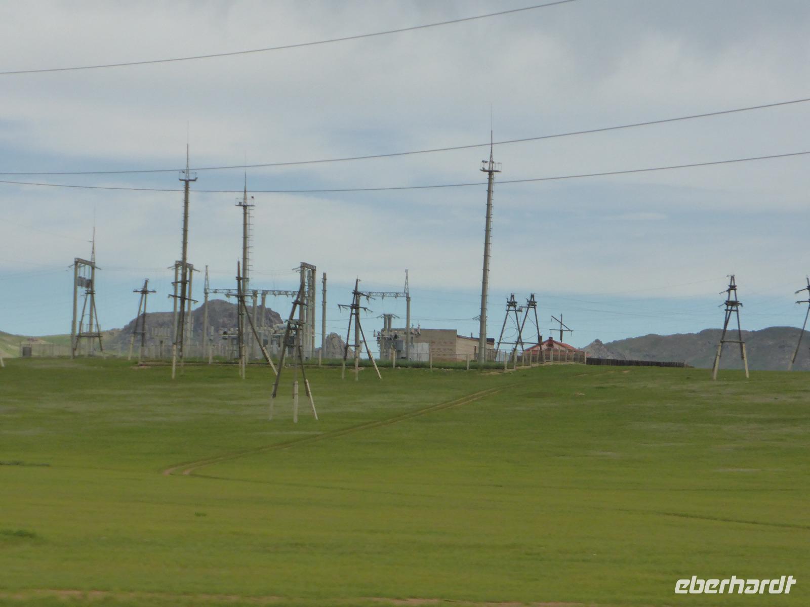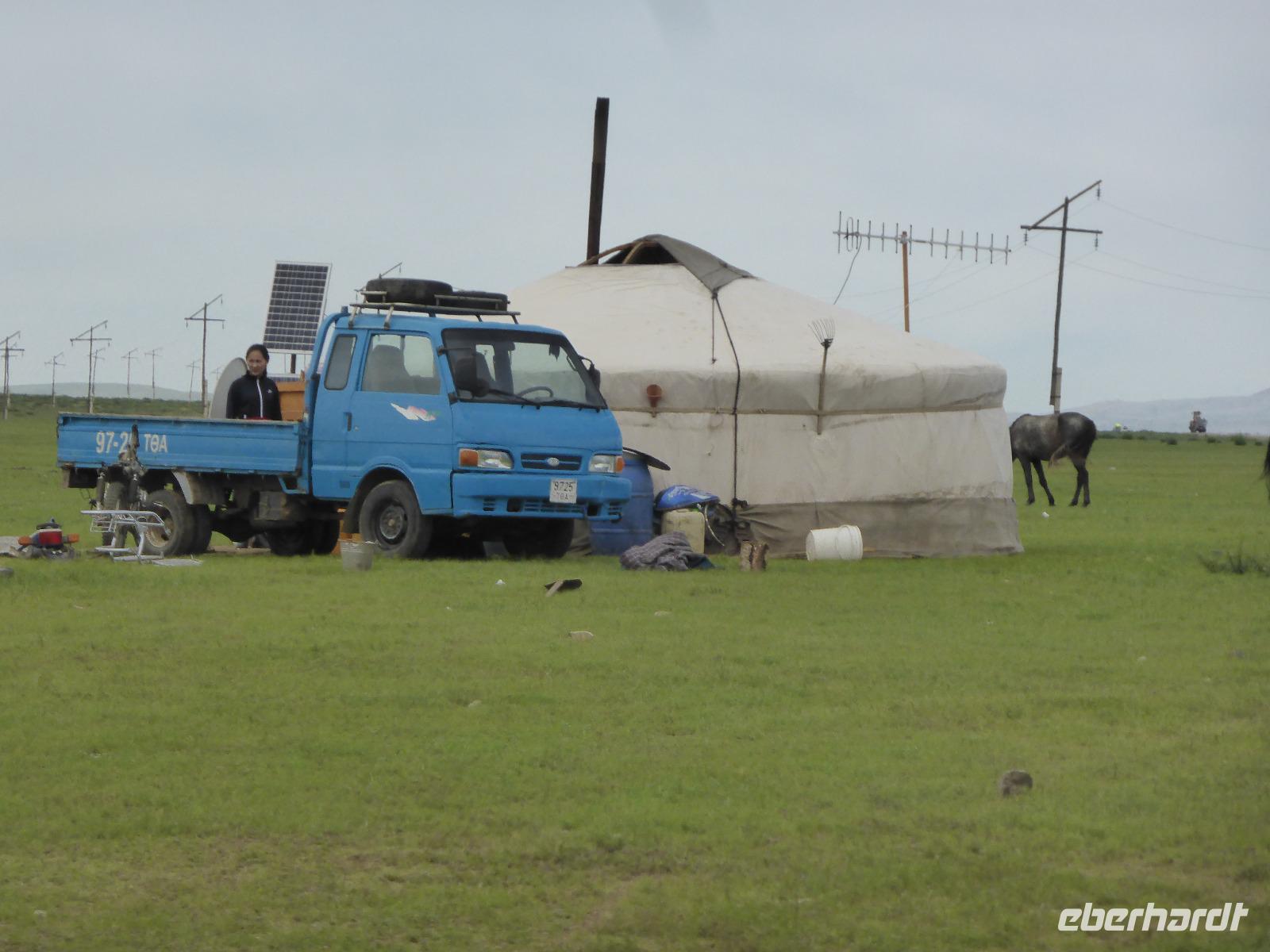 Die Weiterfahrt beginnt offroad. Den Sauxalwald lasssen wir bald hinter uns. Noch sind wir in der Südggobi, fahren in Richtung Mittelgobi. Liebgewonnene Beobachtungen da und dortherde, dort. Die Fahrspur ist teilweise versandet, aber nicht eben. Wir erreichen ein Sum-Zentrum. Mit seinen zweitausend Einwohnern eines der kleineren. Wieder das gleiche Bild. Etliche kleine Geschäfte reihen sich rum den Platz in der Mitte des Ortes herum. In einem der Geschäftchen steht auf dem Ladentisch ein Tischrechner als Kasse. Dahinter hat der alte Mongole einen Laptop auf den Knien. Eines der Geschäfte hebt sich ab: in westlichem Einrichtungsstil besteht der Fußboden aus hochglanzpolierten Fliesen. Die Mongolei ist in Wandlung. Wir fahren nun entlang einer Stromtrasse. Schnurgerade zieht sie sich durchs Land und gibt uns die Richtung vor. Nach mehr als zwei Stunden Fahrt kommen uns zwei Jeeps und ein Motorrad entgegen, die ersten ihrer Art auf den Pisten heute. Obwohl keine richtige Straße, können wir entlang der Trasse schneller fahren, siebzigachtzig Sachen. Die Ongi-Ebene hier führt zum gleichnamigen Fluss. Kaum Bewuchs, wenig Tiere und die Frage, was die wenigen denn eigentlich zum Fressen finden? Nach drei Stunden Fahrt endet die Ebene und wir durchfahren eine hügelige Landschaft. Es wird etwas grüner und schon sehen wir häufiger Tiere. Dort drei helle Jurten, ein Tiergatter, viele kleine Ziegen. Ein Junge übt das Fahren auf einem Motorrad. Wir halten an, wollen mal schauen. Ein Mädchen tritt aus der Jurte und bedeutet ihrem Bruder, die Ziegen ins Gatter zu tun. Sie scheinen allein zuhaus und sollen Obacht geben. Wir halten respektvoll Abstand, haben unseren Spaß bei den Zicklein.