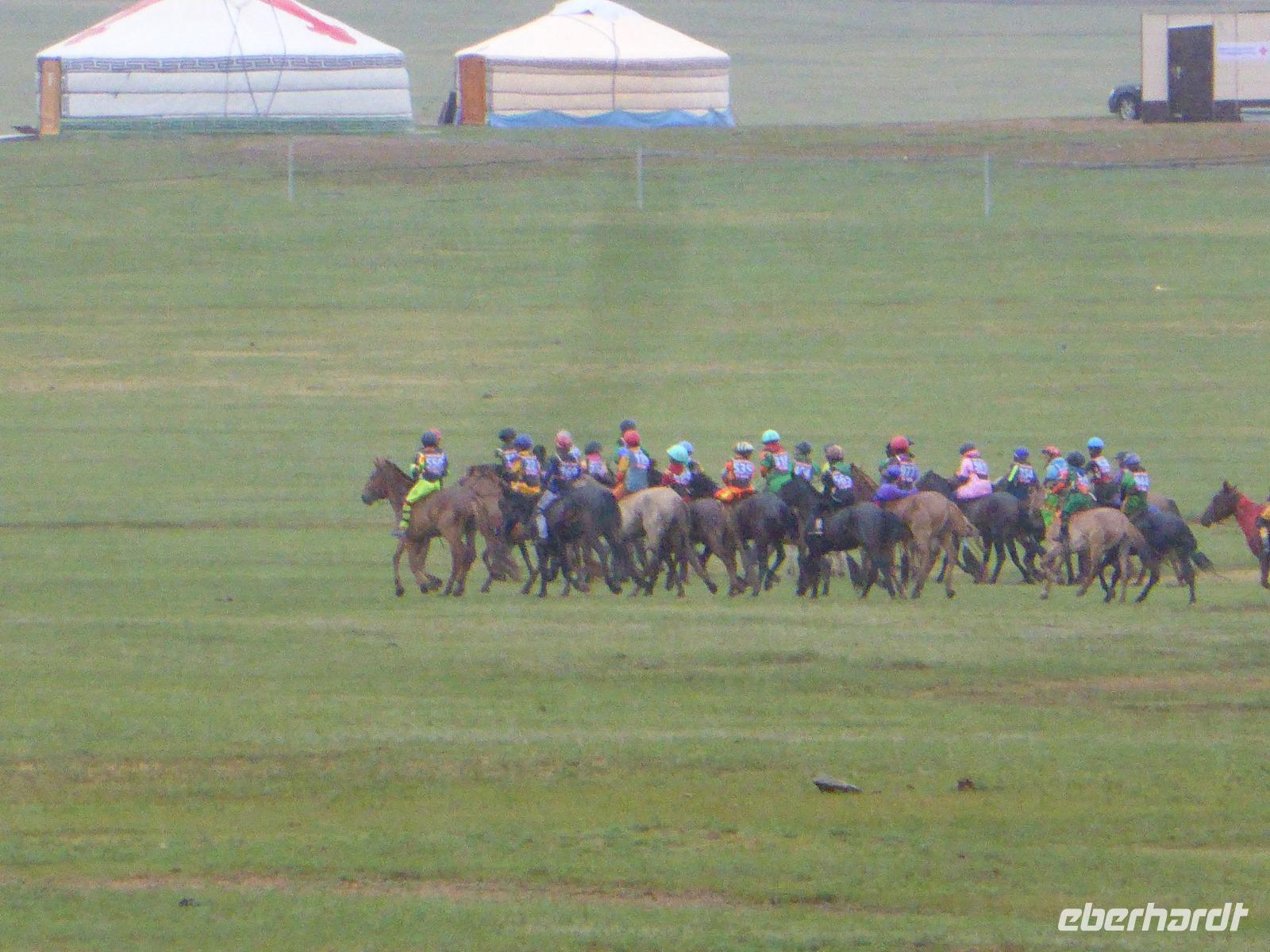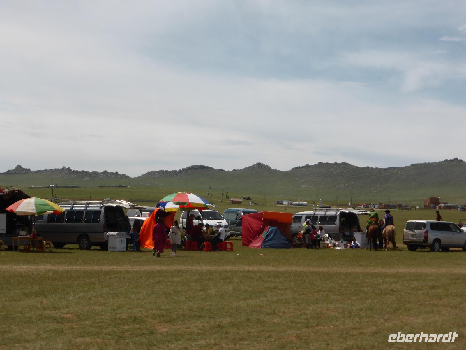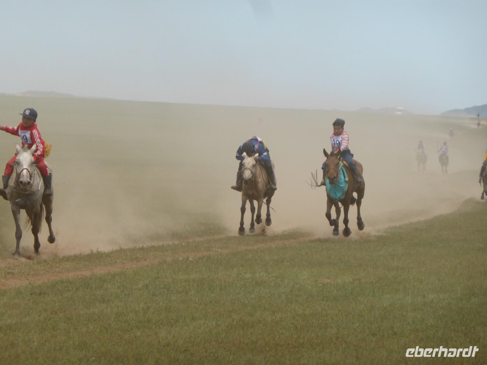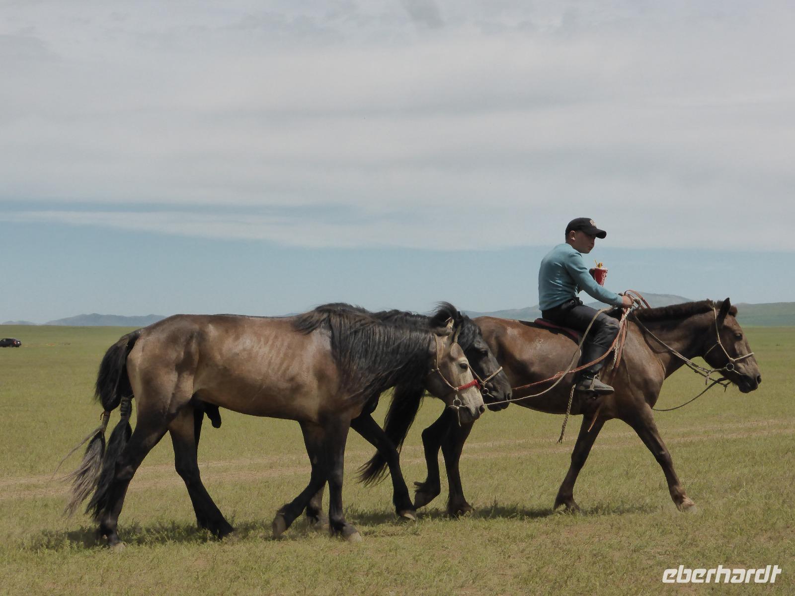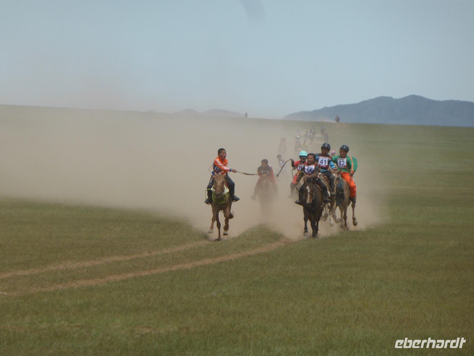 Noch fahren wir durch die Steppe,ein wenig gedankenversunken. Das Ziel heißt heute Ulan Bator. Gedankenversunken beginnen wir die Fahrt. Unsere Aufmerksamkeit wird geweckt durch Aktivitäten jenseits der Straße. Unsere Fahrer erkennen mit geübtem Blick, dass es da drüben wahrscheinlich ein Pferderennen gibt. Gut möglich, zwei Tage vor dem großen Naadam-Fest in der Hauptstadt. Das sollten wir uns nicht entgehen lassen. Wenn auch heute nicht fester Programmpunkt, biegen wir kurzentschlossen ein auf das Gelände. Mischen uns unter das Volk. Was gibt es da alles zu beobachten!? Volksfestcharakter. Die Menschen haben ihre Trachten oder die Sonntagskleider angezogen. Man hat sich fein gemacht. Die Damen immer mit Handtasche. Nicht selten hochhackige Schuhe. Rituale, von denen die mongolische Reiseleiterin erzählt hatte, fallen uns nun auf. Die Männer reichen sich gegenseitig ihre Tabakdose zum Beschnuppern und Testen bei der Begrüßung. Eine Wertschätzung des Anderen. Gefüllte Teigtaschen werden gebacken. Diese zu essen bei solch einem Fest, ist auch Tradition. Plötzlich kommt Bewegung in die Menge. Immer mehr Autos, mit Fähnchen geschmückt, fahren auf den Festplatz und mehr und mehr füllt er sich mit Menschen. Alle halten Ausschau, ob sich die Pferde nähern, eine staubwolke sie ankündigt. Dann ist es soweit. Die Euphorie der Zuschauer steigt. Jetzt der Zieleinlauf. Die Jungen kämpfen bis zuletzt. Weit ist das Feld auseinandergezogen. Meist holen die Väter ihre Sprösslinge ab, sind stolz auf sie.