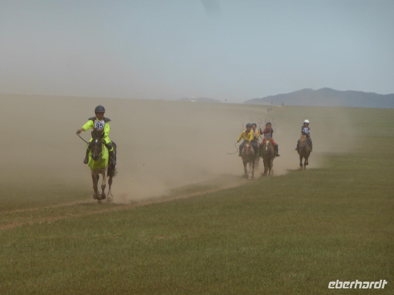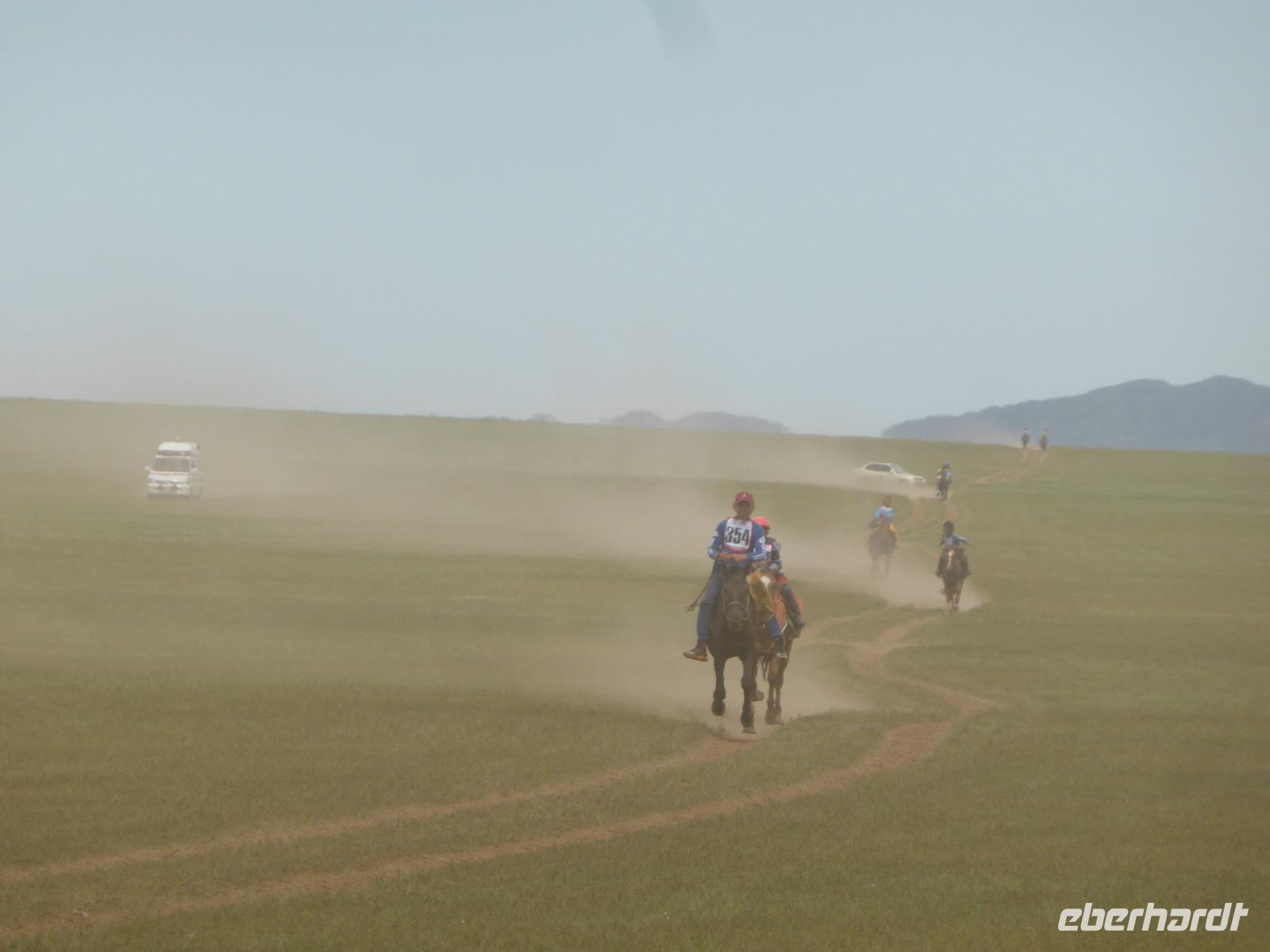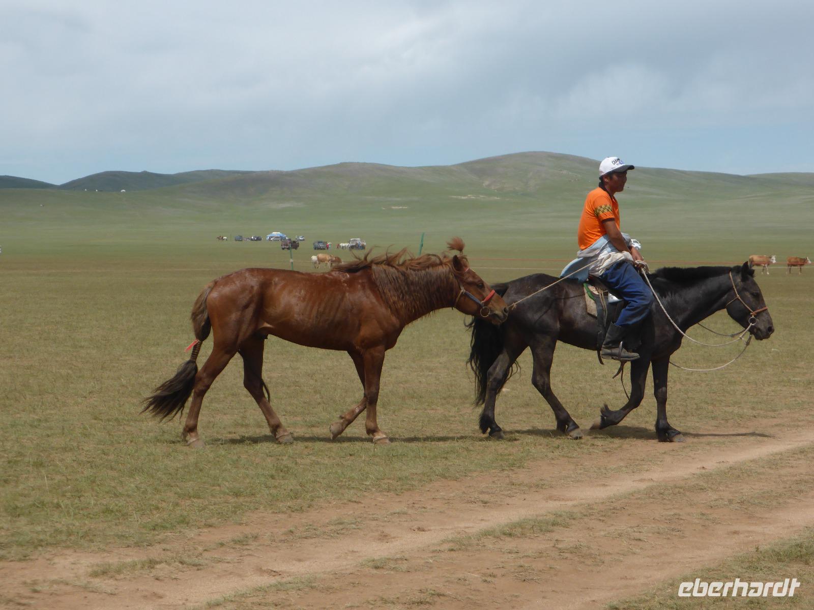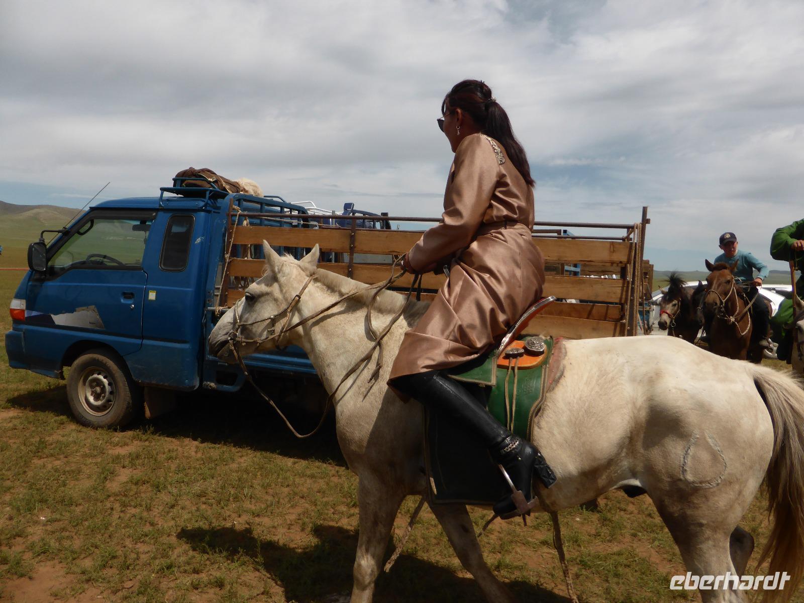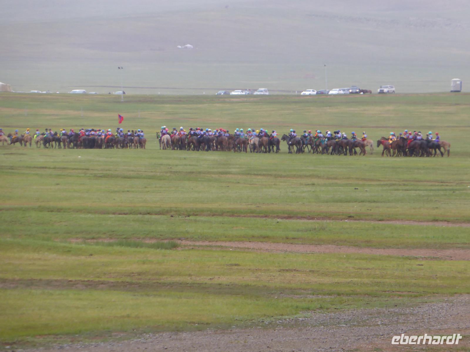 Noch fahren wir durch die Steppe,ein wenig gedankenversunken. Das Ziel heißt heute Ulan Bator. Gedankenversunken beginnen wir die Fahrt. Unsere Aufmerksamkeit wird geweckt durch Aktivitäten jenseits der Straße. Unsere Fahrer erkennen mit geübtem Blick, dass es da drüben wahrscheinlich ein Pferderennen gibt. Gut möglich, zwei Tage vor dem großen Naadam-Fest in der Hauptstadt. Das sollten wir uns nicht entgehen lassen. Wenn auch heute nicht fester Programmpunkt, biegen wir kurzentschlossen ein auf das Gelände. Mischen uns unter das Volk. Was gibt es da alles zu beobachten!? Volksfestcharakter. Die Menschen haben ihre Trachten oder die Sonntagskleider angezogen. Man hat sich fein gemacht. Die Damen immer mit Handtasche. Nicht selten hochhackige Schuhe. Rituale, von denen die mongolische Reiseleiterin erzählt hatte, fallen uns nun auf. Die Männer reichen sich gegenseitig ihre Tabakdose zum Beschnuppern und Testen bei der Begrüßung. Eine Wertschätzung des Anderen. Gefüllte Teigtaschen werden gebacken. Diese zu essen bei solch einem Fest, ist auch Tradition. Plötzlich kommt Bewegung in die Menge. Immer mehr Autos, mit Fähnchen geschmückt, fahren auf den Festplatz und mehr und mehr füllt er sich mit Menschen. Alle halten Ausschau, ob sich die Pferde nähern, eine staubwolke sie ankündigt. Dann ist es soweit. Die Euphorie der Zuschauer steigt. Jetzt der Zieleinlauf. Die Jungen kämpfen bis zuletzt. Weit ist das Feld auseinandergezogen. Meist holen die Väter ihre Sprösslinge ab, sind stolz auf sie.