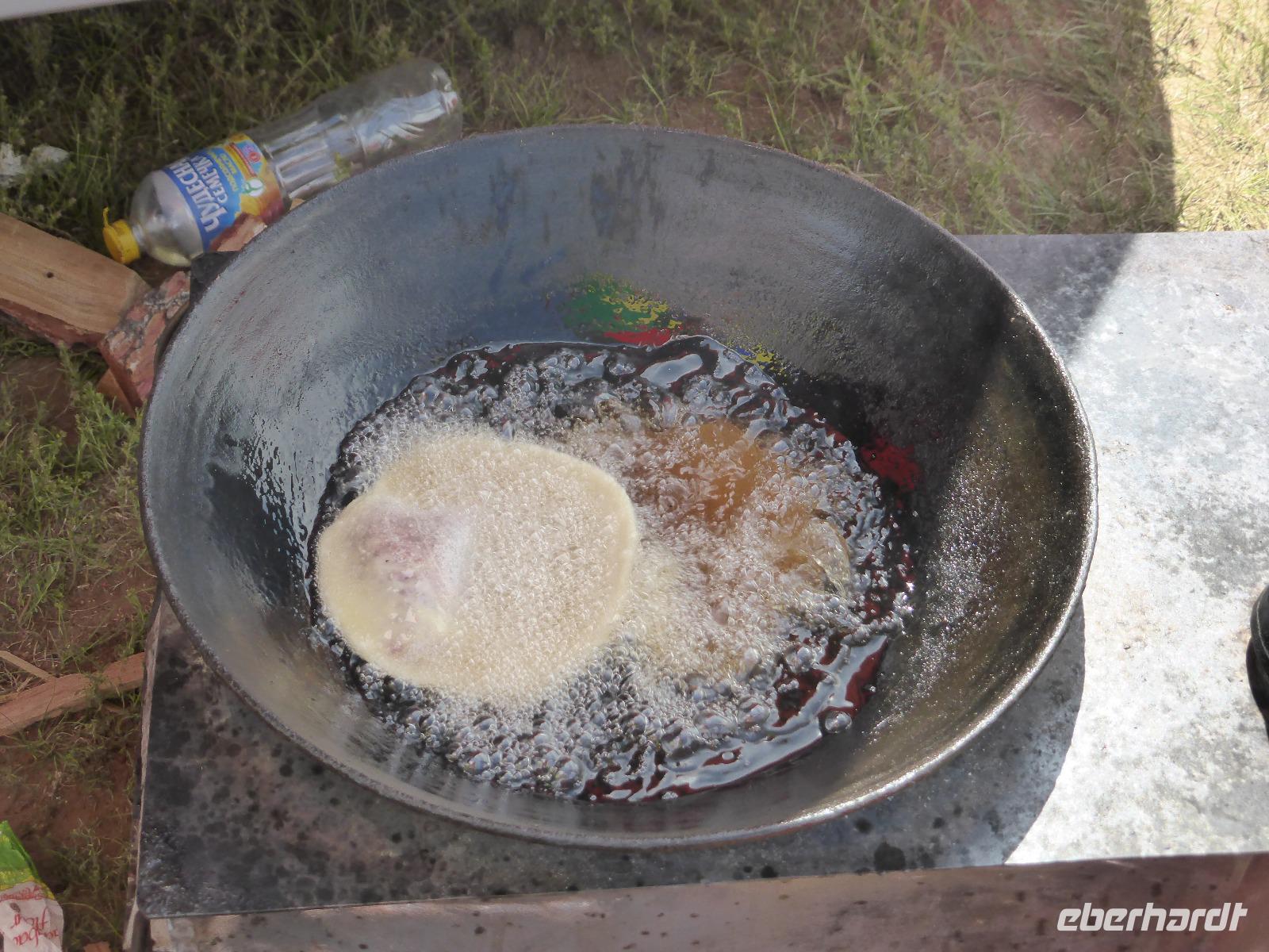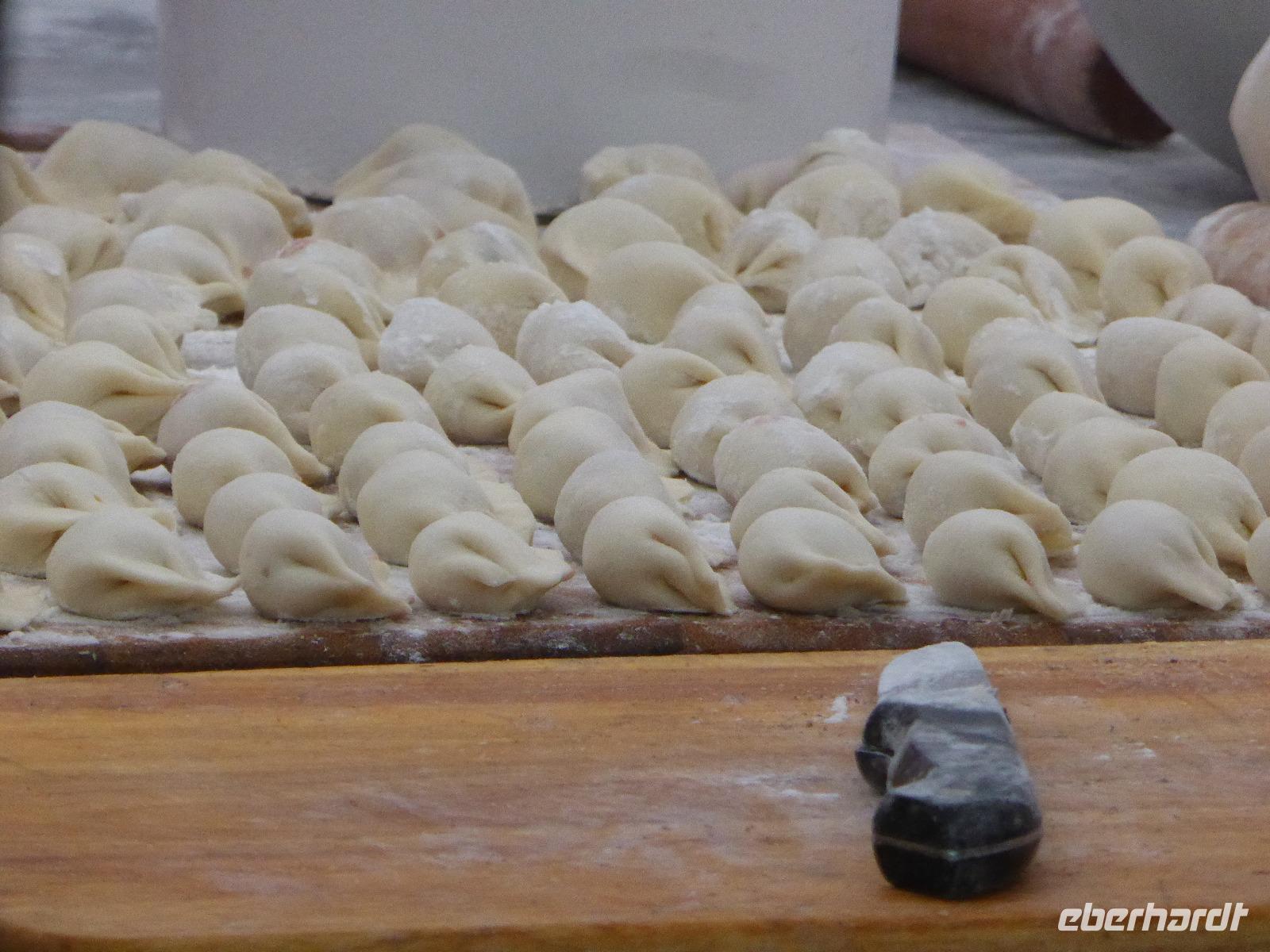 Zum Abendessen gibt es heute gedünstete und gebratene mongolische Teigtaschen. Sambaga erklärt wie man sie isst: in die Hand nehmen, hineinbeißen und den Fleischsaft aussschlürfen. Alle schlürfen und schlürfen. Wie die Kamele heute vormittag. Gelächter.