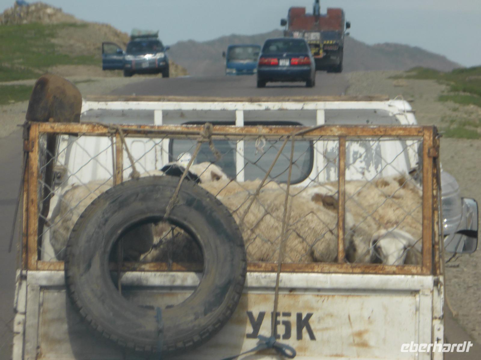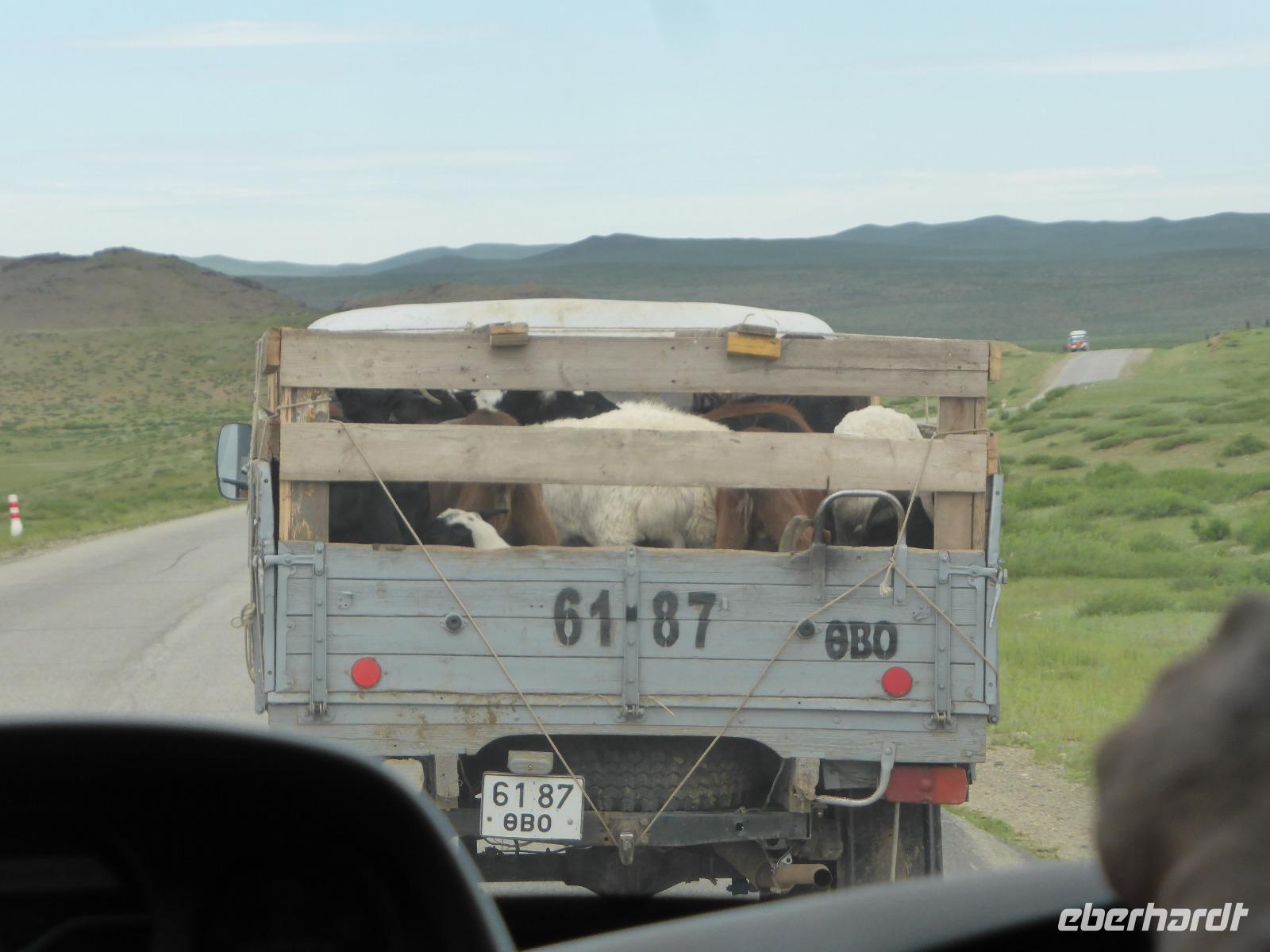 Was aber ist da vorne? Nicht zu glauben: eine große Kamelherde geht, eines hinter dem anderen, über die Straße. Links aus dem Graben heraus - über die zweispurige Straße hinweg - rechts in den Graben hinein. Selbstverständlich halten wir an und warten ab. Gerne. Die Fotoapparate klicken. Zunehmender Verkehr auf den Straßen der Mongolei bringt leider mit sich, dass auch etliche Kadaver an den Straßenrändern liegen.