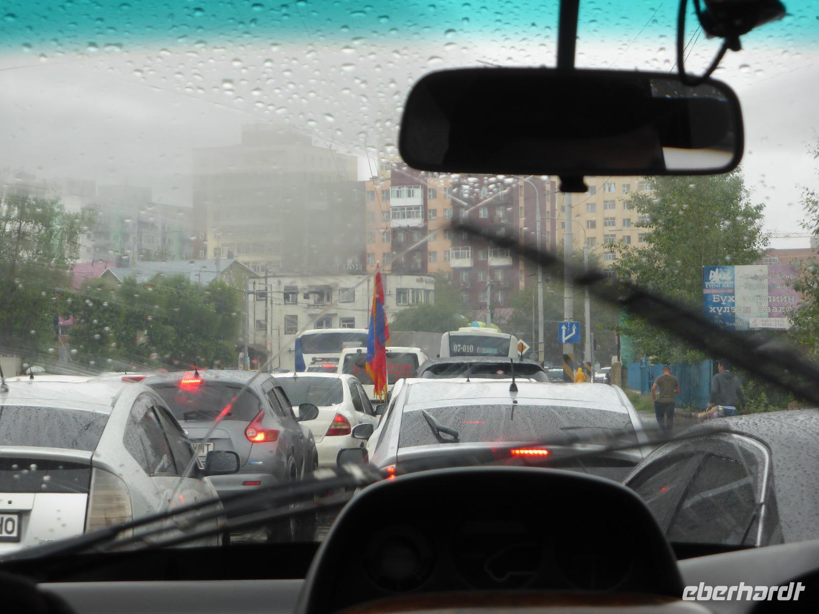 Regen und Wind auch beim Start des Pferderennens, welchen wir verfolgen. Wir schlüpfen in ein Zelt, sind wenigstens vor dem Regen und dem Wind geschützt. Im kleinen Zelt, eng beieinander sitzend, feiern wir das Naadam-Fest. Man bewirtet uns mit Ziegentopf und Wodka. Naadam-Fest feiern ist schön. Jetzt kann uns auch das schlechte kälte Wetter nichts mehr anhaben. Nach Ulan Bator hineinzukommen ist die eigentliche Schwierigkeit. Überschwemmte Straßen nach den starken Regenfällen und ein Riesenstau. Es dauert gefühlt ewig, bis wir im Kashmir-Outlett angekommen sind. Kashmir nicht zu kaufen in der Mongolei ist fast undenkbar.