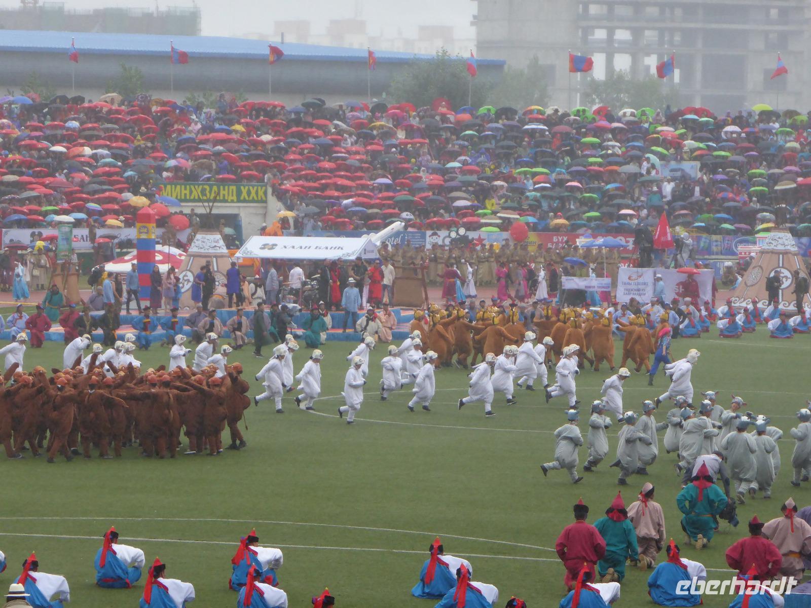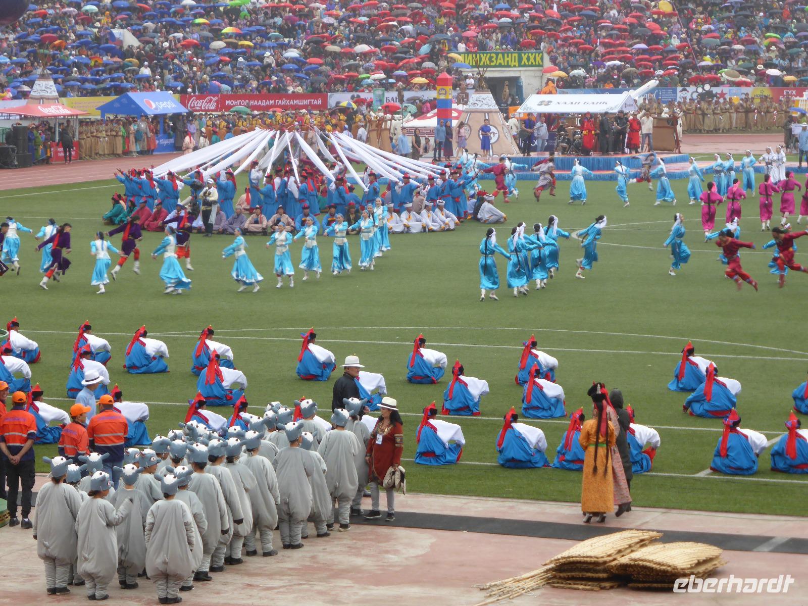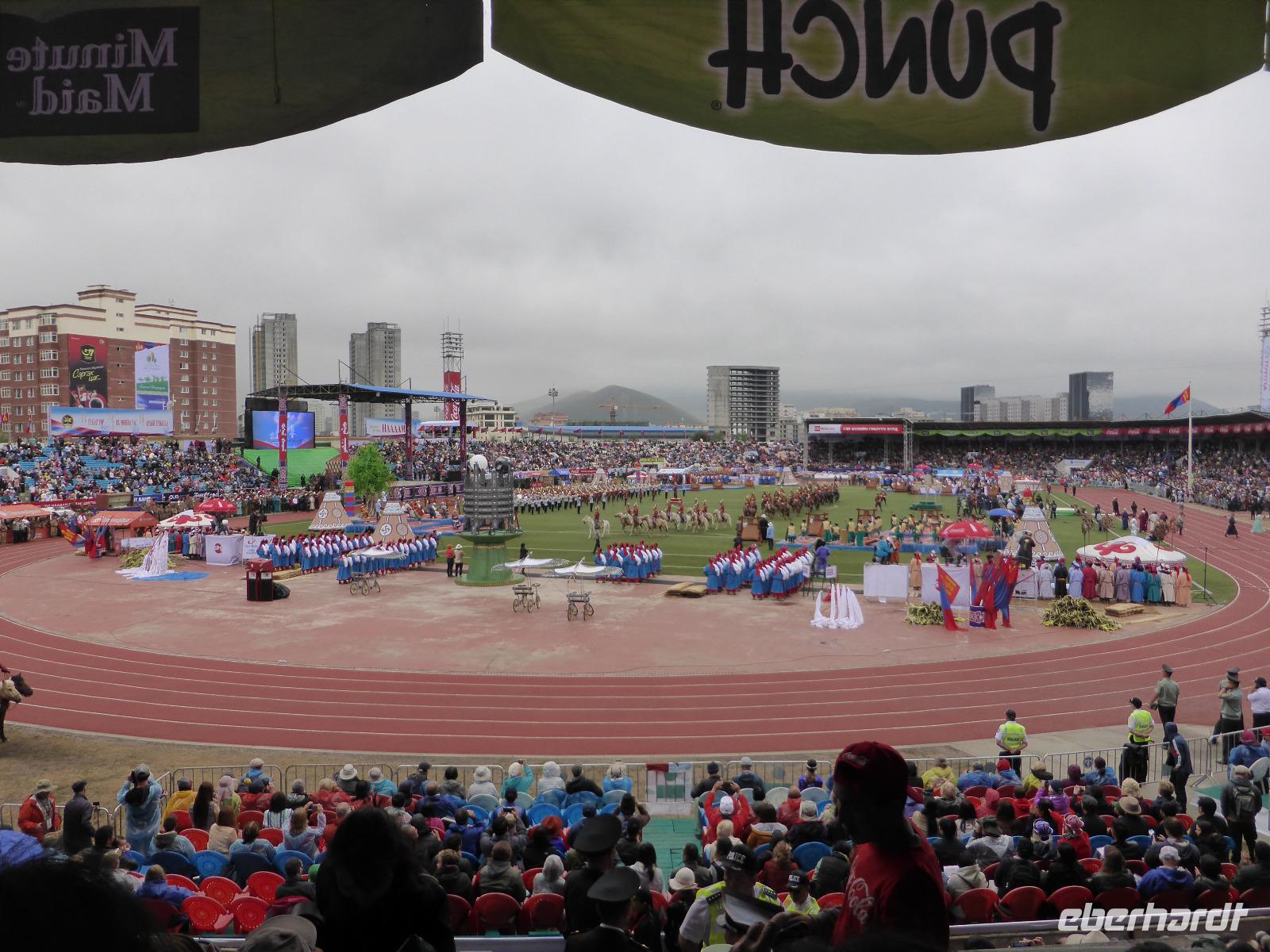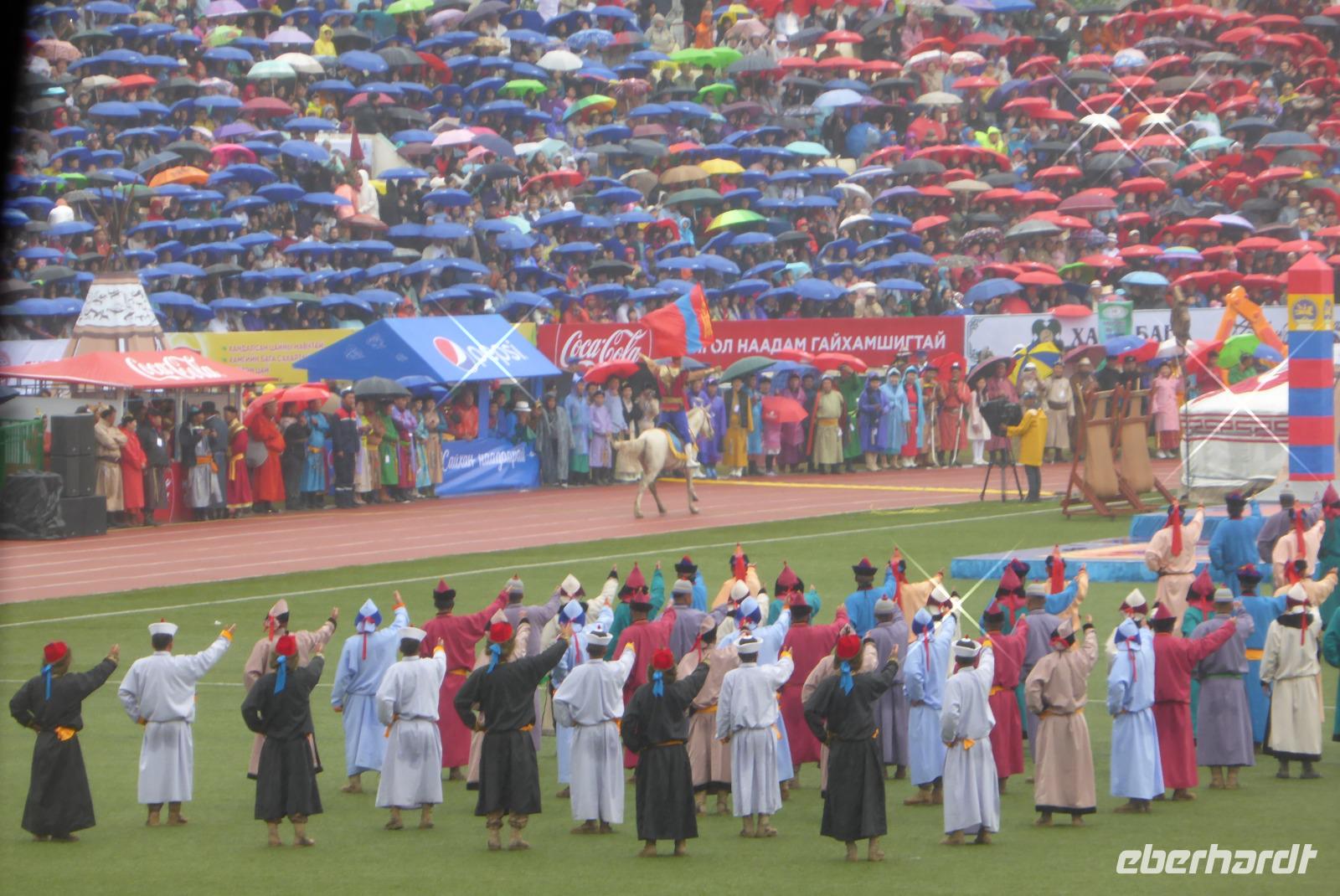 straten wir ausreichend früh, um nicht zu spät bei der Eröffnungsfeier des Naadam-Festes einzutreffen. Es regnet immernoch. Vor dem Stadion ist schon allerhand los. Wir nehmen unsere Plätze ein, unter einem Dach, bestens. Und dann sind wir länger als zwei Stunden fasziniert von einer Eröffnungsfeier, die man sich schöner und bunter nicht vorstellen kann. Grandios. Den ganzen Nachmittag über haben wir Zeit, das vielfältige Treiben und die Wettkämpfe zu beobachten. Hoch über dem Süchebator-Platz in der Sky-Bar gibt Eberhardt-Travel einen Abschiedsdrink aus. Wir sehen, wie die Lichter in der Stadt angehen. Wir nehmen Abschied.