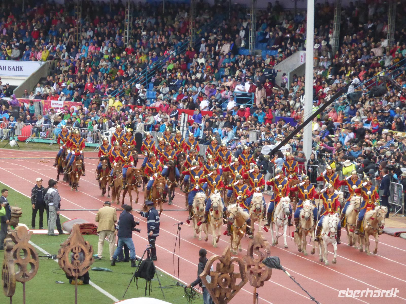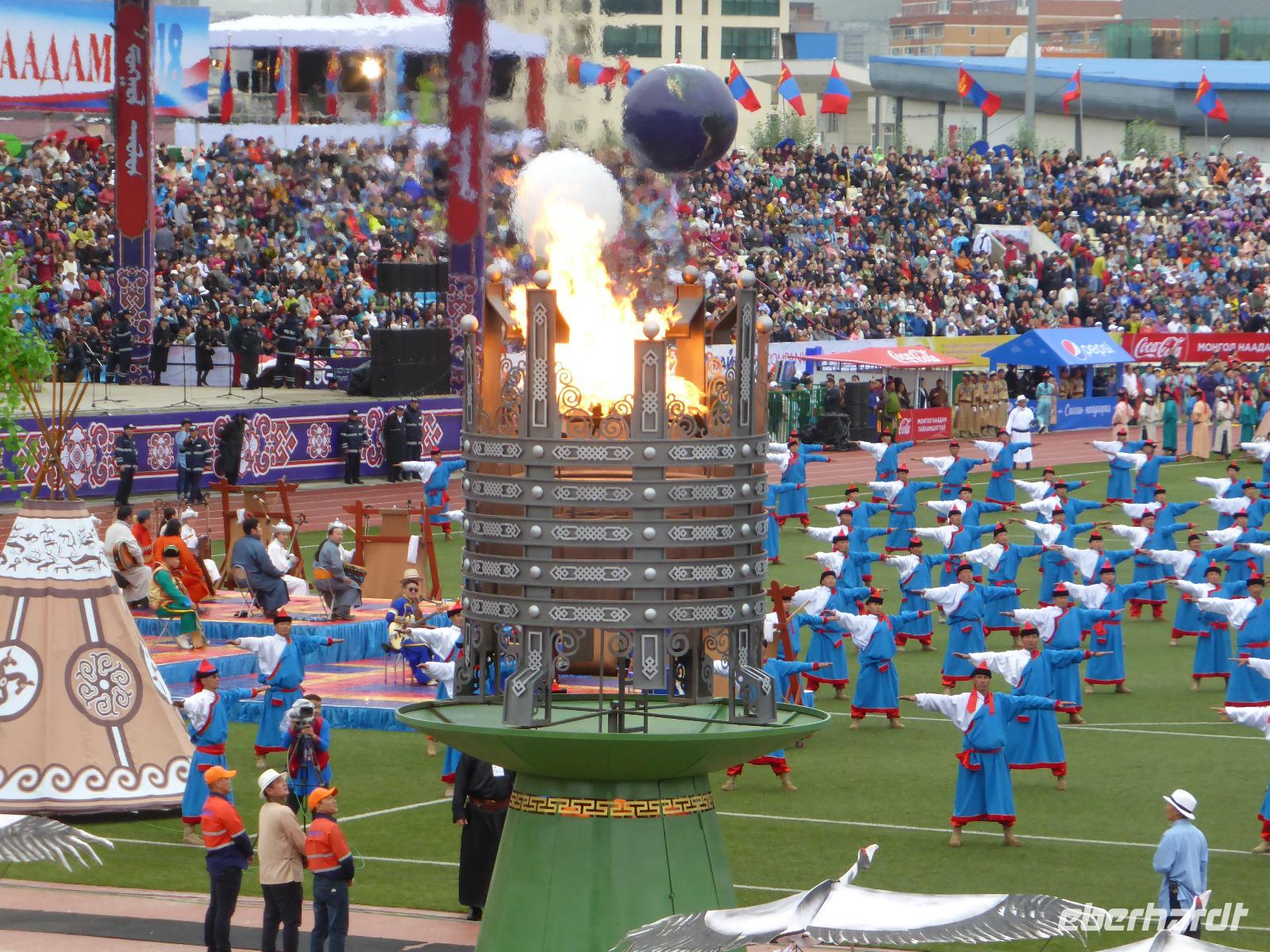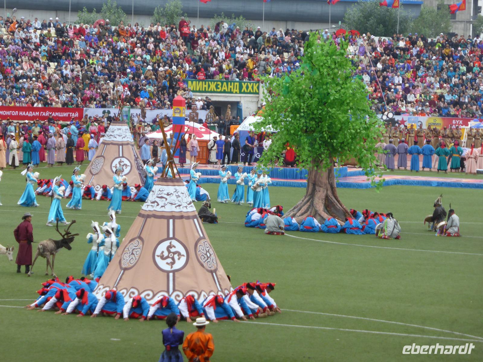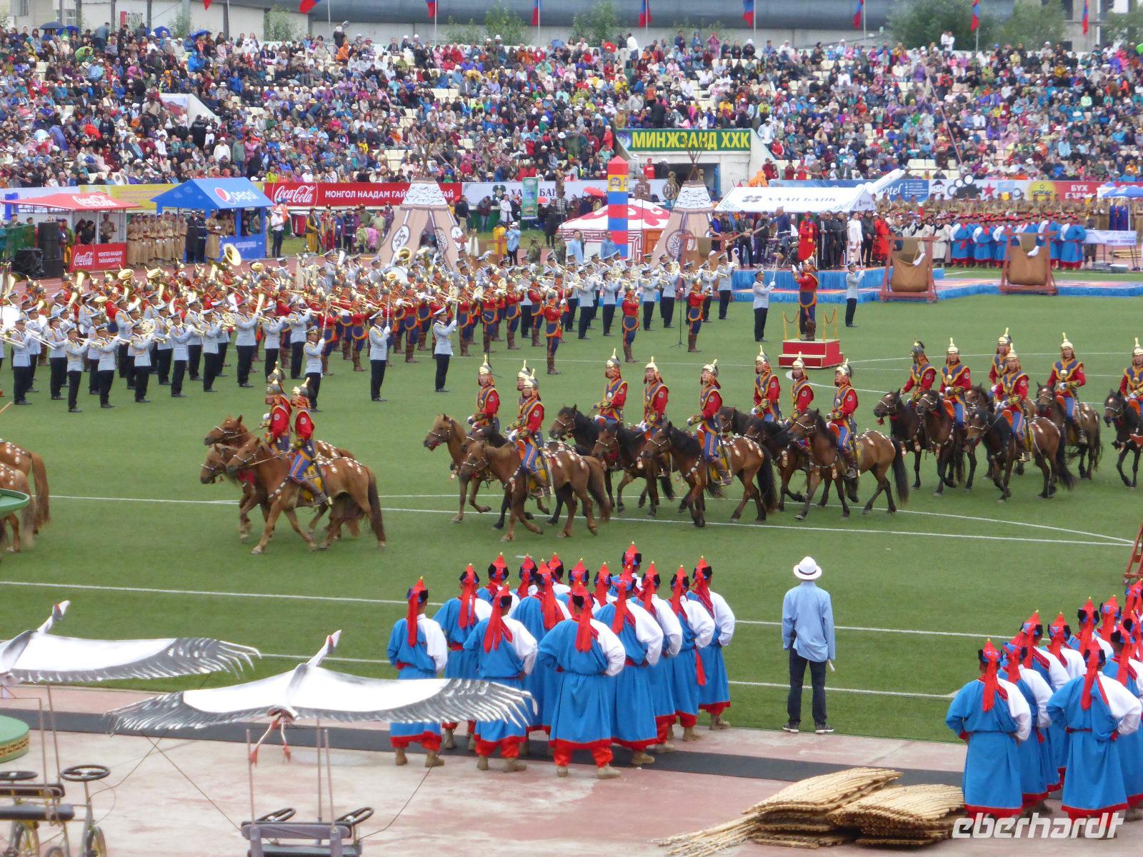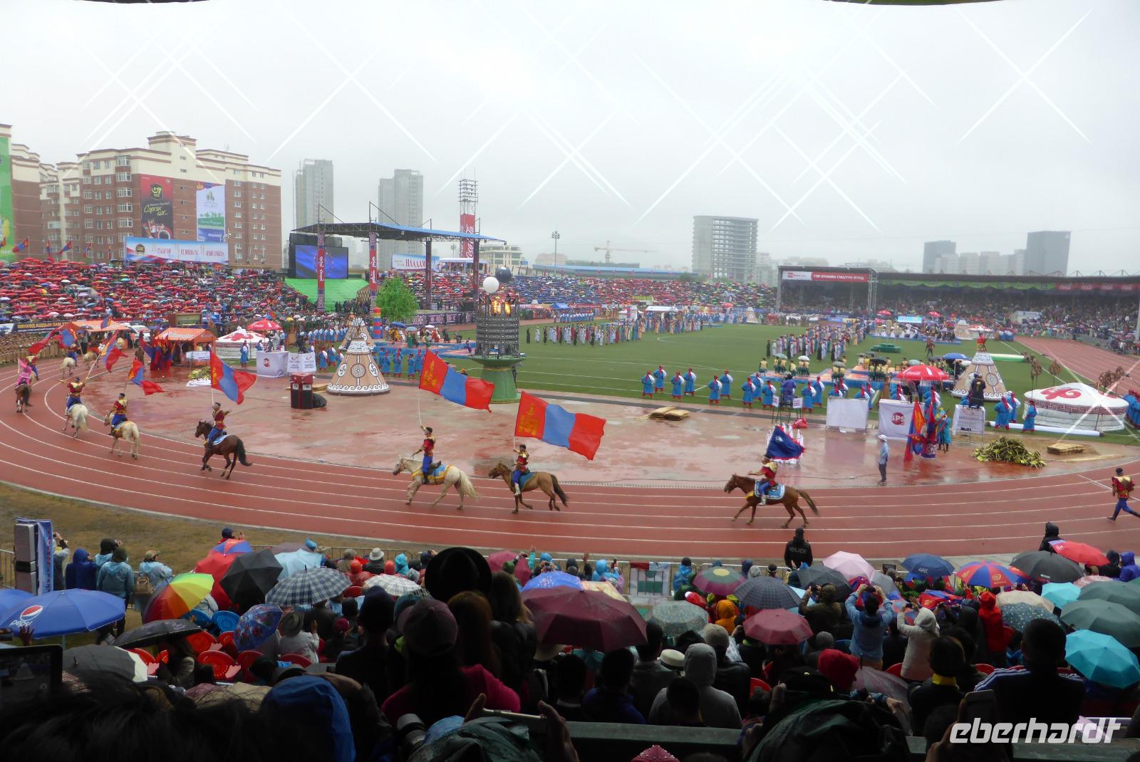 straten wir ausreichend früh, um nicht zu spät bei der Eröffnungsfeier des Naadam-Festes einzutreffen. Es regnet immernoch. Vor dem Stadion ist schon allerhand los. Wir nehmen unsere Plätze ein, unter einem Dach, bestens. Und dann sind wir länger als zwei Stunden fasziniert von einer Eröffnungsfeier, die man sich schöner und bunter nicht vorstellen kann. Grandios. Den ganzen Nachmittag über haben wir Zeit, das vielfältige Treiben und die Wettkämpfe zu beobachten. Hoch über dem Süchebator-Platz in der Sky-Bar gibt Eberhardt-Travel einen Abschiedsdrink aus. Wir sehen, wie die Lichter in der Stadt angehen. Wir nehmen Abschied.
