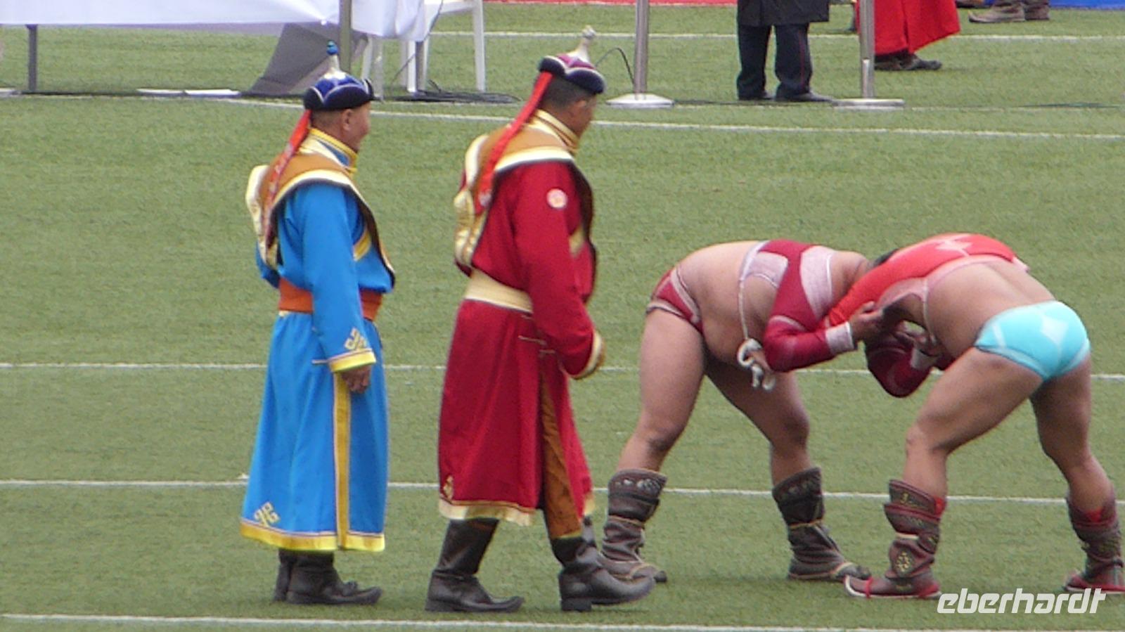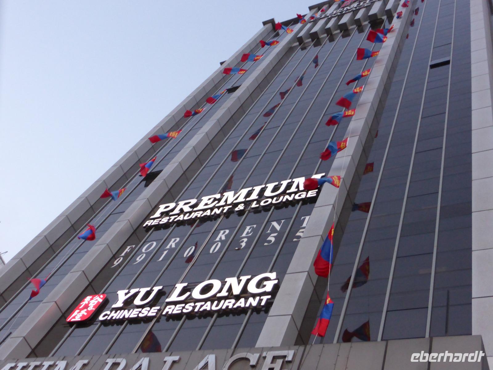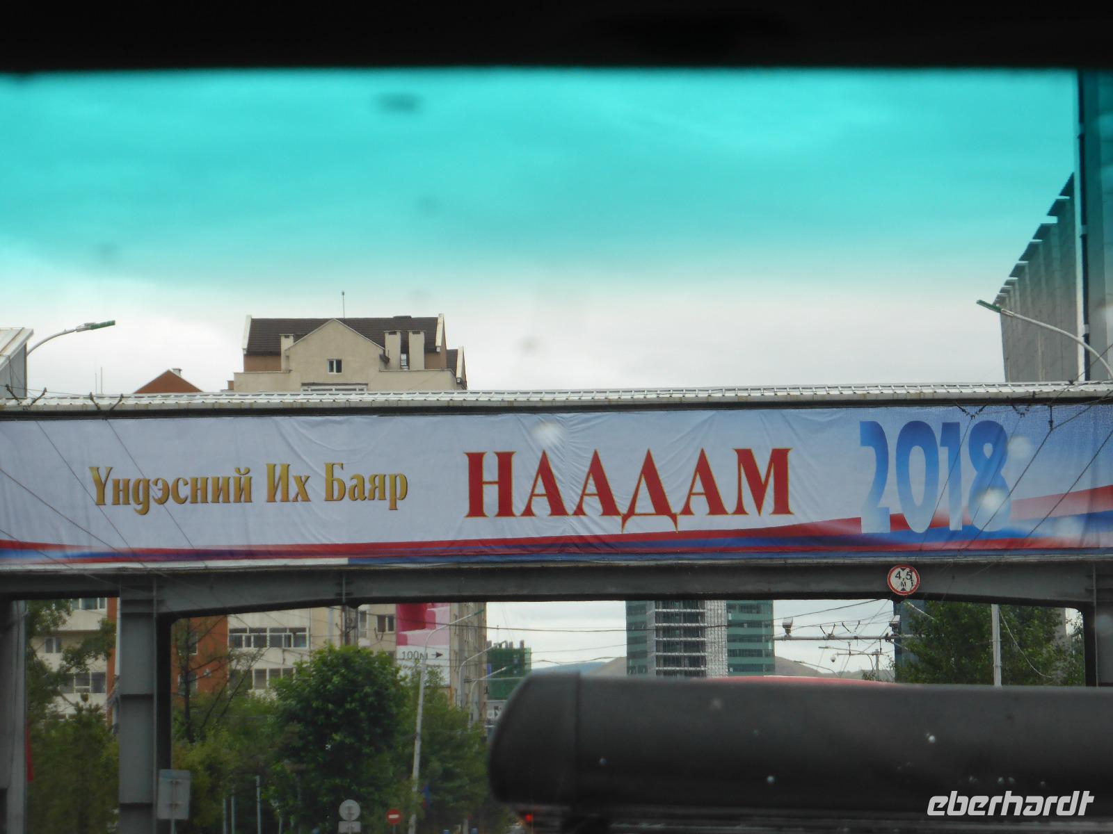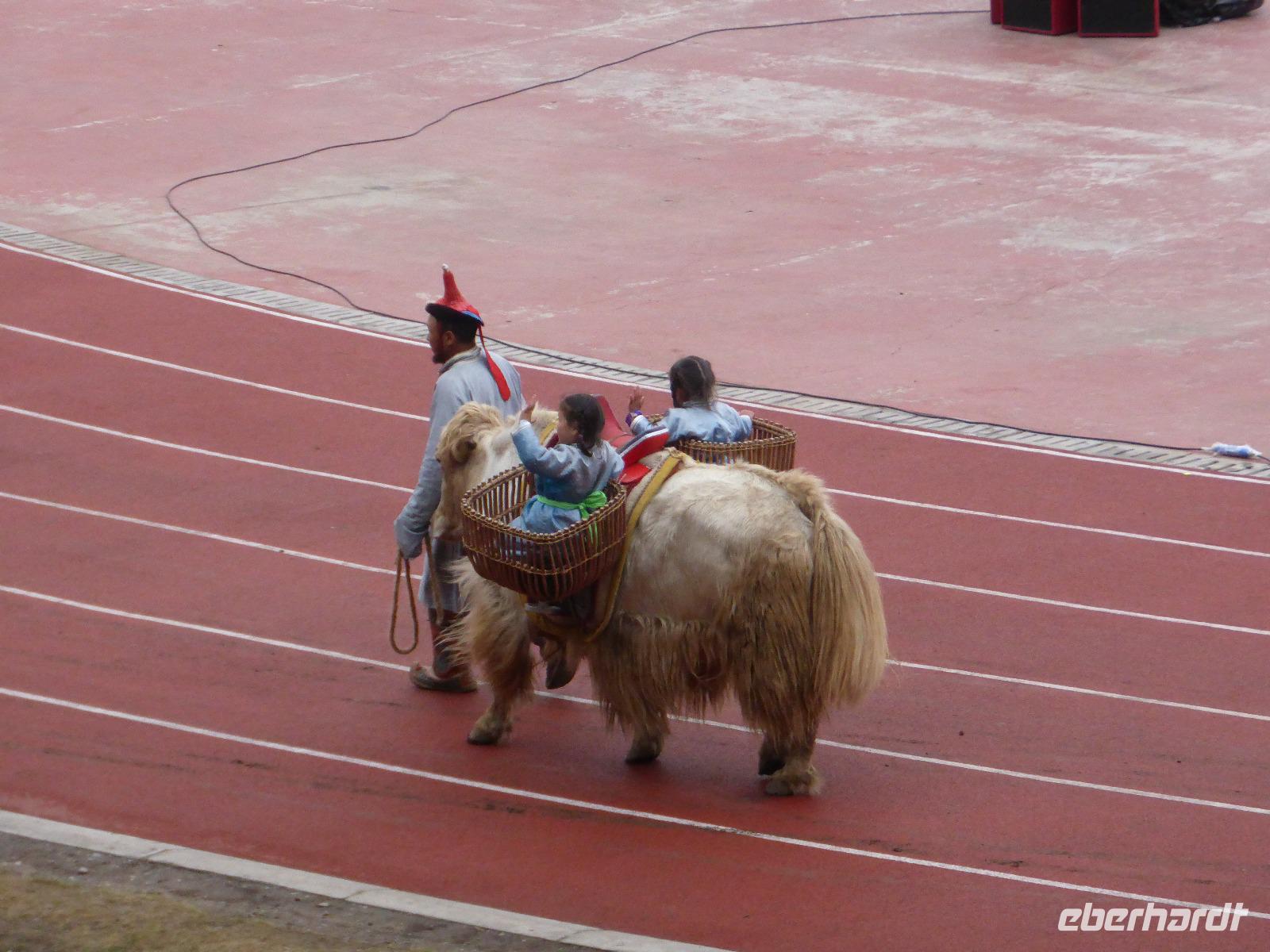 straten wir ausreichend früh, um nicht zu spät bei der Eröffnungsfeier des Naadam-Festes einzutreffen. Es regnet immernoch. Vor dem Stadion ist schon allerhand los. Wir nehmen unsere Plätze ein, unter einem Dach, bestens. Und dann sind wir länger als zwei Stunden fasziniert von einer Eröffnungsfeier, die man sich schöner und bunter nicht vorstellen kann. Grandios. Den ganzen Nachmittag über haben wir Zeit, das vielfältige Treiben und die Wettkämpfe zu beobachten. Hoch über dem Süchebator-Platz in der Sky-Bar gibt Eberhardt-Travel einen Abschiedsdrink aus. Wir sehen, wie die Lichter in der Stadt angehen. Wir nehmen Abschied.