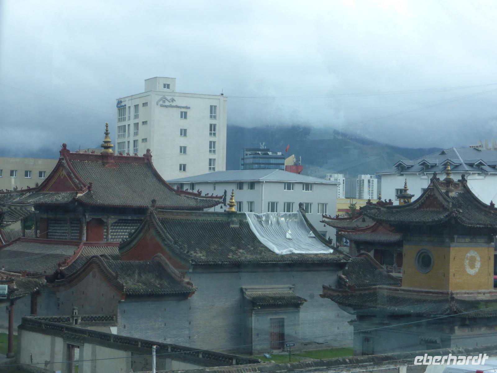 Der örtliche Reiseführer für diesen ersten Tag, Onon, holt uns nach dem Ankommen früh am Morgen ab. Als wir das Flughafengelände verlassen, empfängt uns in die mongolische Hauptstadt mit Verkehr und Straßenlärm. Auf der Fahrt zum Hotel halten wir an bei einer Bank, um Geld zu tauschen. Euro in Mongolische Tugrik . Weil ein Euro etwa zweitausendachthundertfünfzig Tugrik sind, gibt es diese bündelweise, mit einem Schnippgummi zusammengehalten. Endlich Millionär/in. Wir kommen an im 4*-Premium-Hotel in der Stadt. Frühstück. Erfrischung. Eine erste Atempause. Und schon geht es los mit der Erkundung von Ulan Bator. Zuerst das Gandan-Kloster. Wir besichtigen die Anlage; in den Morgenstunden beginnen die Gebetszeremonien, für uns interessant zu beobachten.