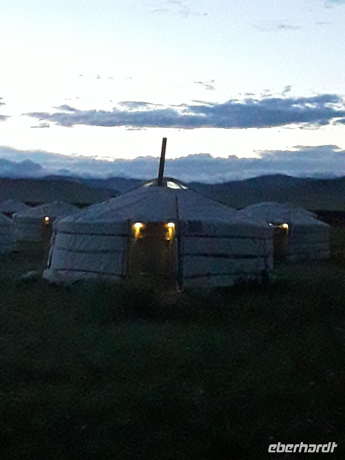 Überraschung. Eine Wagenburg. Unsere Fahrer haben eine Wagenburg aus den drei Fahrzeugen gebaut. Inmitten die Stühle und Tische geschützt. Abendessen draußen. Herrlich, diese Unkompliziertheit. Bier und Wein spendiert Eberhardt-Travel. Wir harren des angekündigten Sonnenuntergangs. Nein, es wird nichts. Der Himmel bleibt bedeckt. Dafür naht ein Sandsturm. Sieht man auch nicht alle Tage. Die Fahrzeuge werden umgruppiert zu unserem Schutze. Einsteigen wollen wir noch nicht. Erst als die Dämmerung einsetzt und es kühler wird. In den Jurten knipsen wir das Licht an. Der Schein dringt durch die Öffnungen nach draußen. Romantisch.