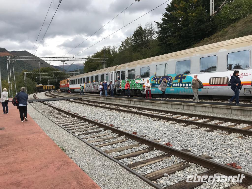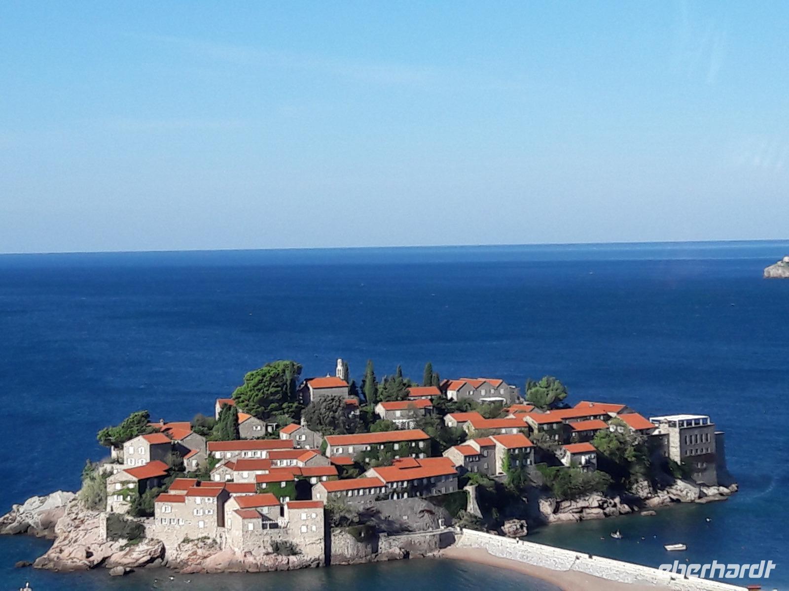 Nach einem ungewöhnlich zeitigen Frühstück gehen wir in die Spur, heute nicht begleitet von Ema (sie ist als Trauzeugin auf der Hochzeit ihrer besten Freundin gefragt), sondern von der ebenso jungen und aufgeschlossenen Jelena (mit deutschen Wurzeln). Zunächst fahren wir wieder entlang der Berge, oberhalb der Küste, bis nach Bar. Unterwegs legen wir noch einen Fotostopp ein. Es ist ein „Muss", denn wir haben einen Superblick auf die kleine „Hotelinsel" St. Stefan, die vom Meer umspült und nur durch einen engen Steg mit dem Festland verbunden ist. Aus der Vogelperspektive sieht es gerade so aus, als wäre sie soeben aus dem blauen Meer aufgetaucht. Nach dem Klick-Klick-Klick der Handys und Fotoapparate setzen wir die Fahrt fort, weiter Richtung Bar/Hauptbahnhof. Und schon kurze Zeit später sitzen wir im sogenannten Titozug (die Strecke führt von Bar nach Belgrad und ist 473 km lang, der Zug passiert dabei 243 Tunnel und fährt über 237 Brücken). 25 Jahre hat man an der Strecke gebaut - und der Bau erfolgte auf freiwilliger Basis (freiwilliger Zwang?)! Heute arbeitet man wieder an einem so großen Objekt - an der ersten Autobahn Montenegros. Dieses Mal aber nicht auf freiwilliger Basis - gebaut wird die Autobahn auch nicht von den Montenegrinern, sondern von den Chinesen...
