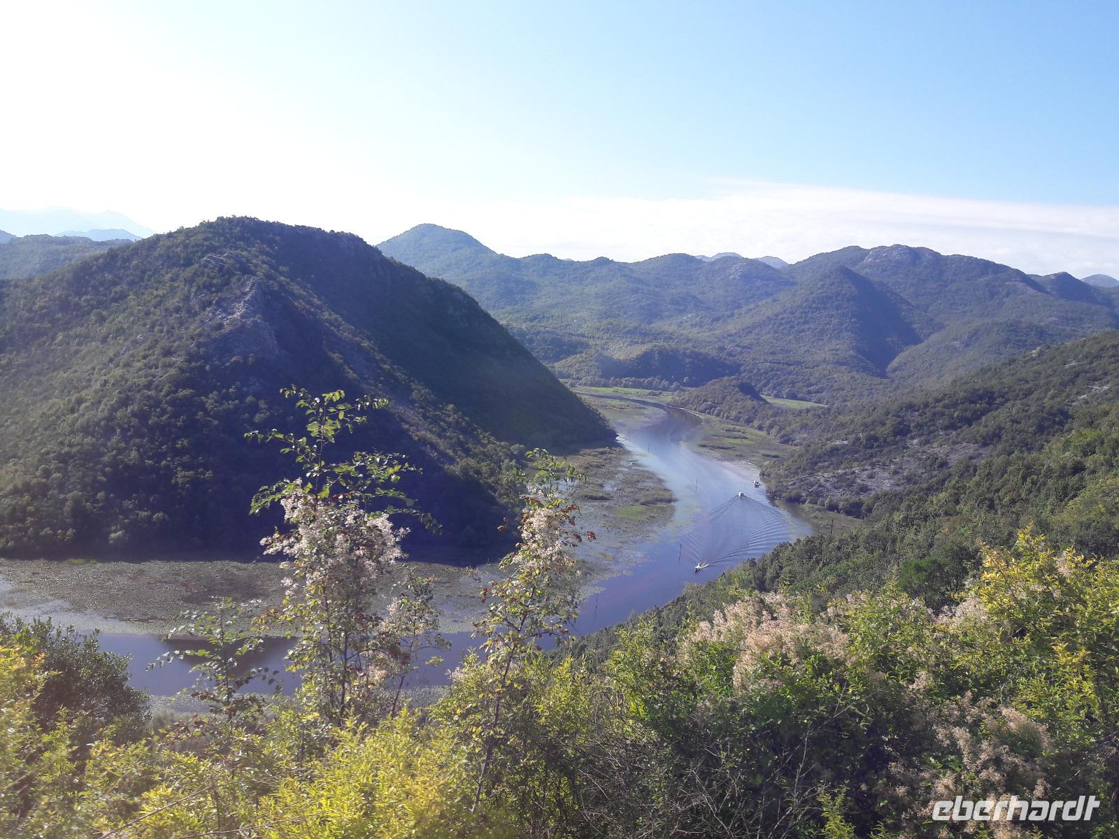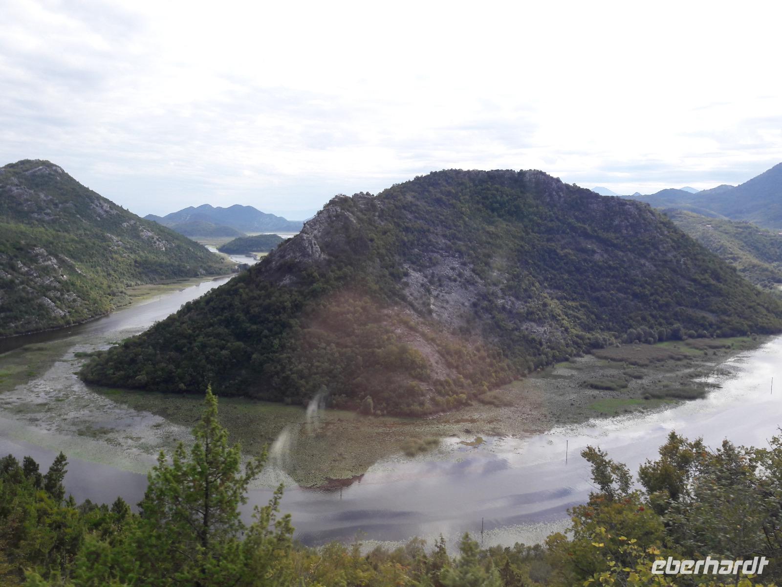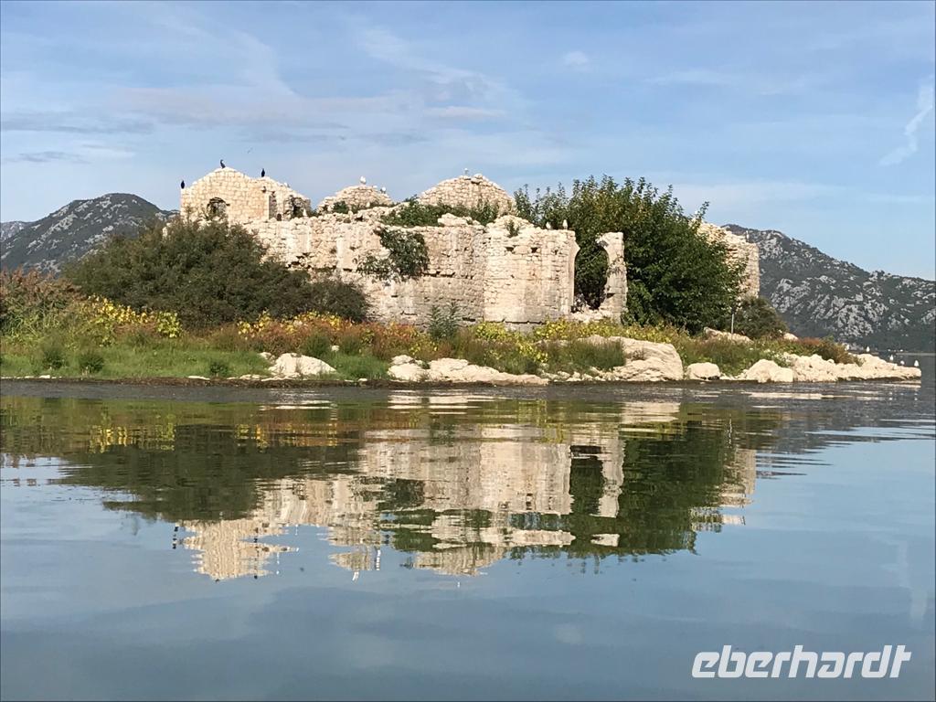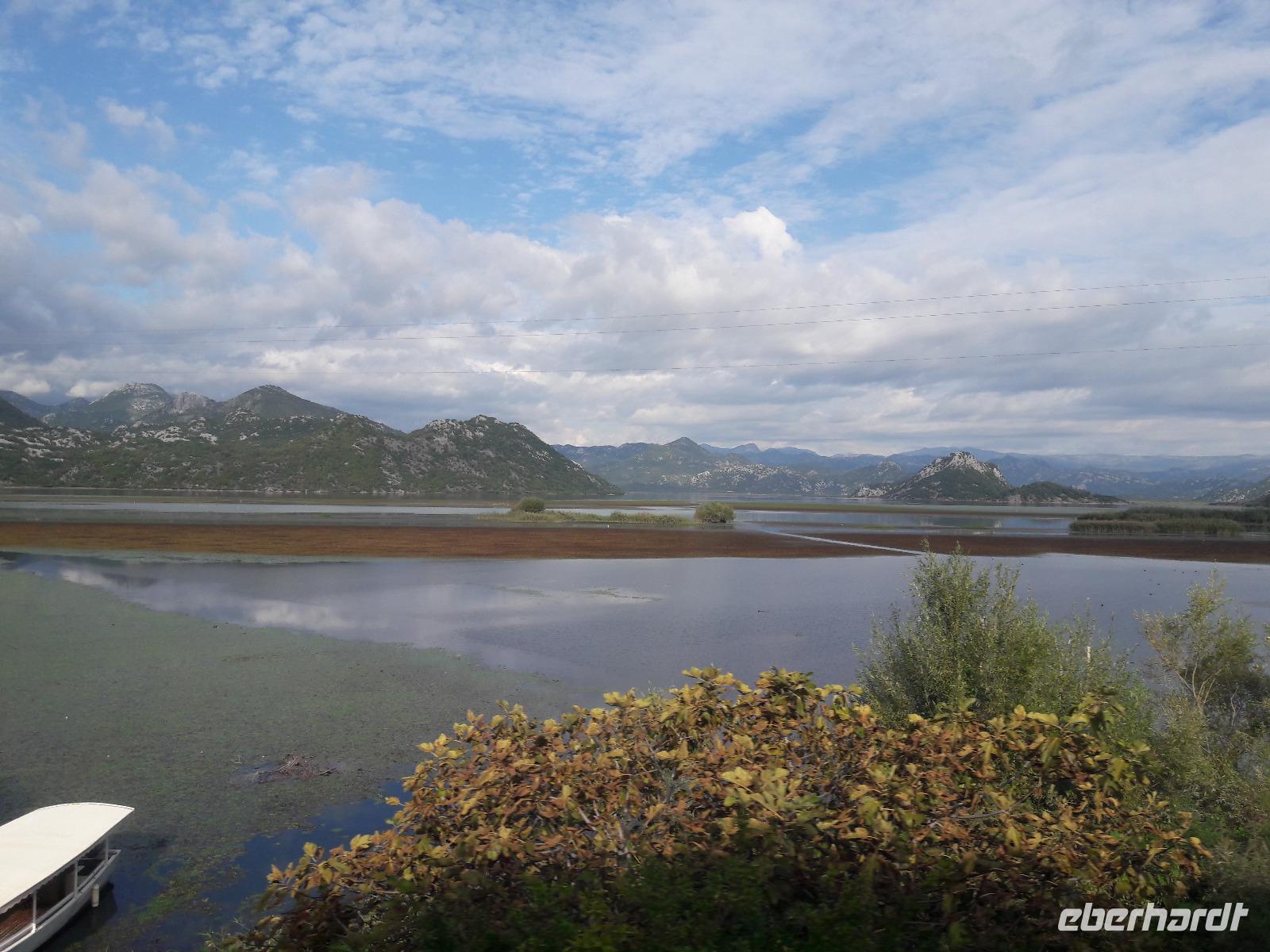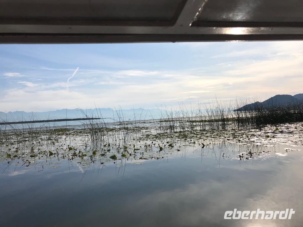 Nachdem wir uns wieder gut gestärkt haben, beginnen wir unsere Reise, die uns zuerst an den Skutarisee, den größten See des Balkans, führt. Die Fläche des Skutarisees hängt sowohl von den Niederschlägen als auch von der Jahreszeit ab. Sie bewegt sich zwischen 391 und 540 km², davon gehören nahezu zwei Drittel zu Montenegro, der Rest zu Albanien. Der See hat 40 Inseln (eine davon, das „montenegrinische Alcatraz" werden wir umrunden) und ebenso viele „Inselaugen" (Quellen). Für die Ornithologen ist der See mit seiner Umgebung eine wahre Oase, denn von den 666 Vogelarten, die in ganz Europa leben,