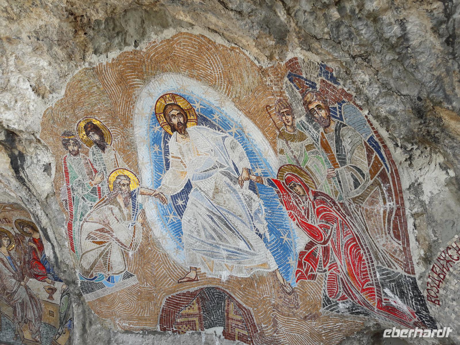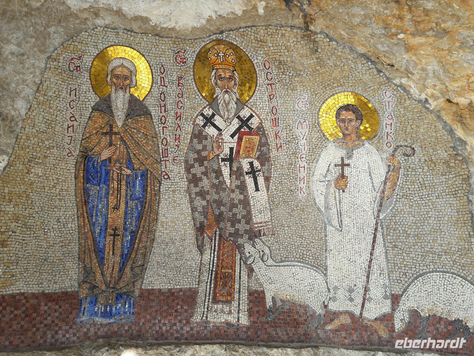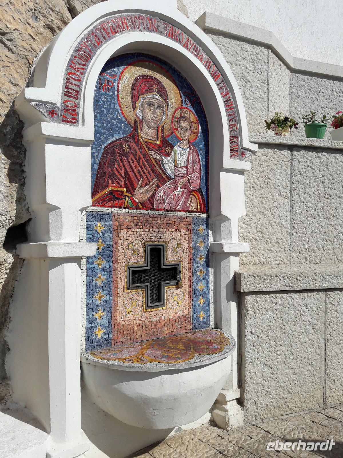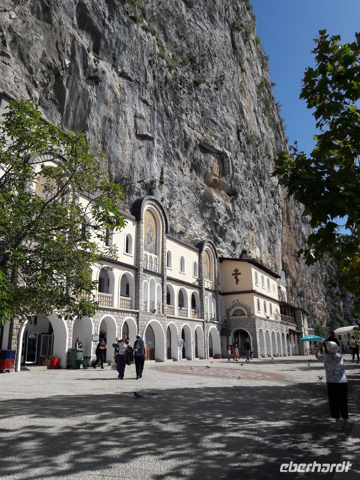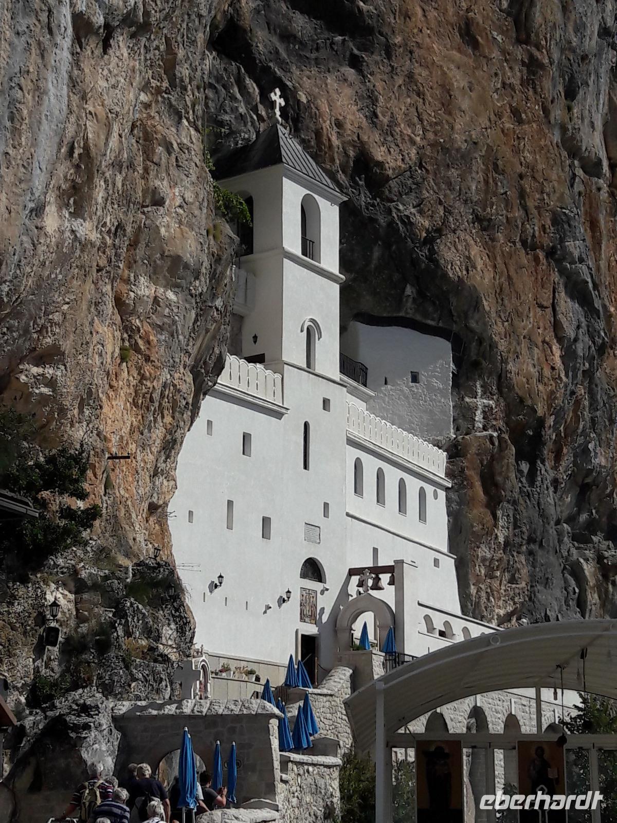 Bestens gelaunt verlassen wir wieder das Boot und den Ort und begeben uns in Richtung Ostrog, wo wir das gleichnamige Kloster aufsuchen wollen. Als wir durch die Ebene fahren, sehen wir den Sakralbau in schwindelerregender Höhe, einem Vogelnest gleich - an einem Fels „klebend". Wie hat man so einen Bau fertigstellen können? Und vor allem wie sollen wir jemals da hinaufkommen? Letztere Frage ist schnell beantwortet ... wir steigen in Bogetici einfach in einen kleineren Bus um. Die Beantwortung der ersten Frage dagegen wird wohl für immer ein Rätsel bleiben. Gegründet hat das Kloster 1656 der Metropolit von Zahumlje und Herzogowina, Stojan Jovanovic, der auch bis zu seinem Tod 1671 dort gelebt haben soll. Da er viele Wunder vollbracht haben soll, wurde er unter dem Namen „Der Heilige Wassili von Ostrog" heiliggesprochen (seine Reliquien befinden sich im Oberen Kloster). Das Kloster ist heute ein Wallfahrtsort für alle Gläubigen, gleich welcher Konfession sie angehören.