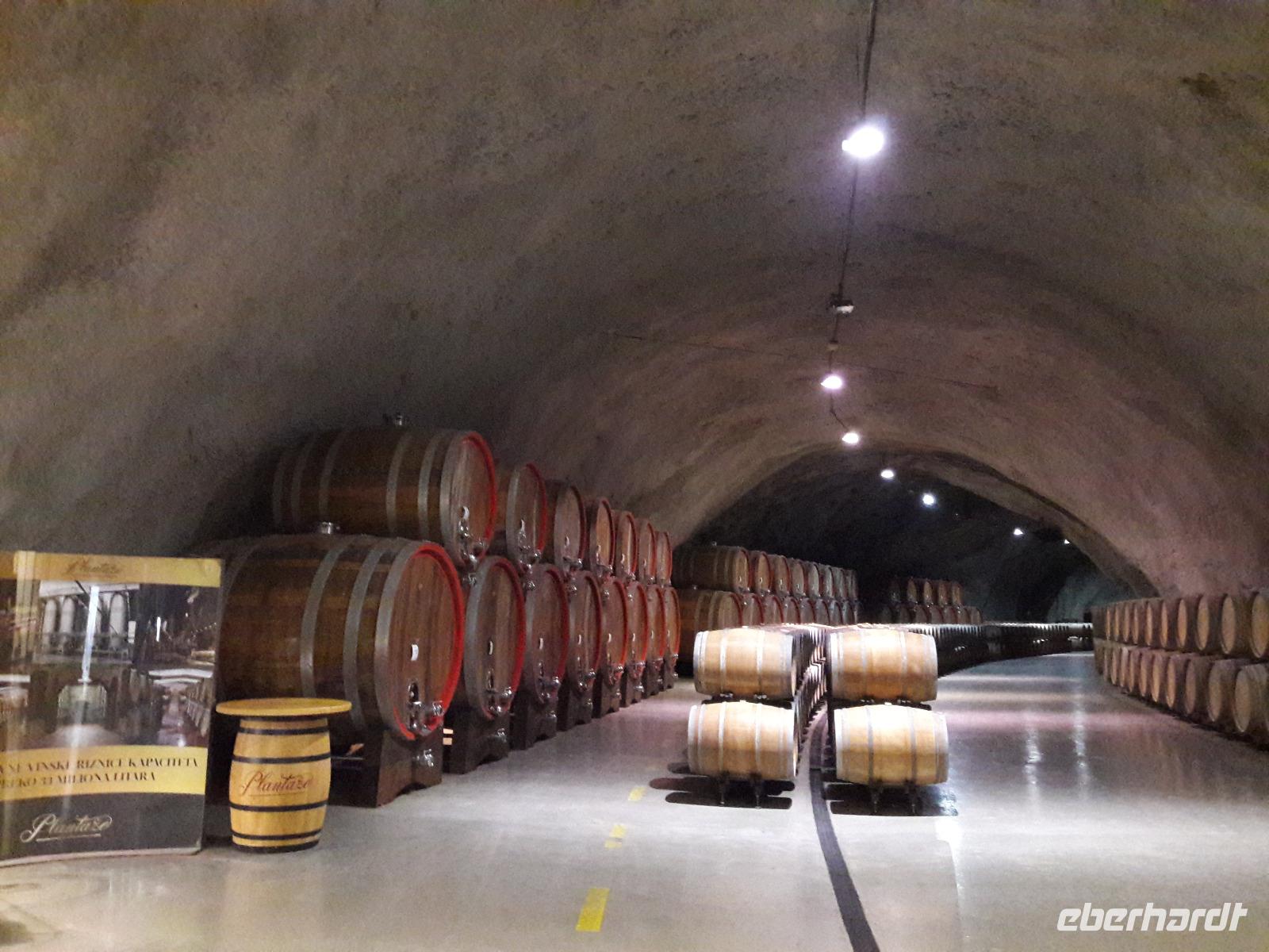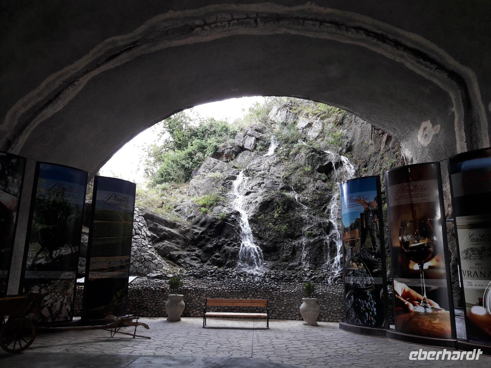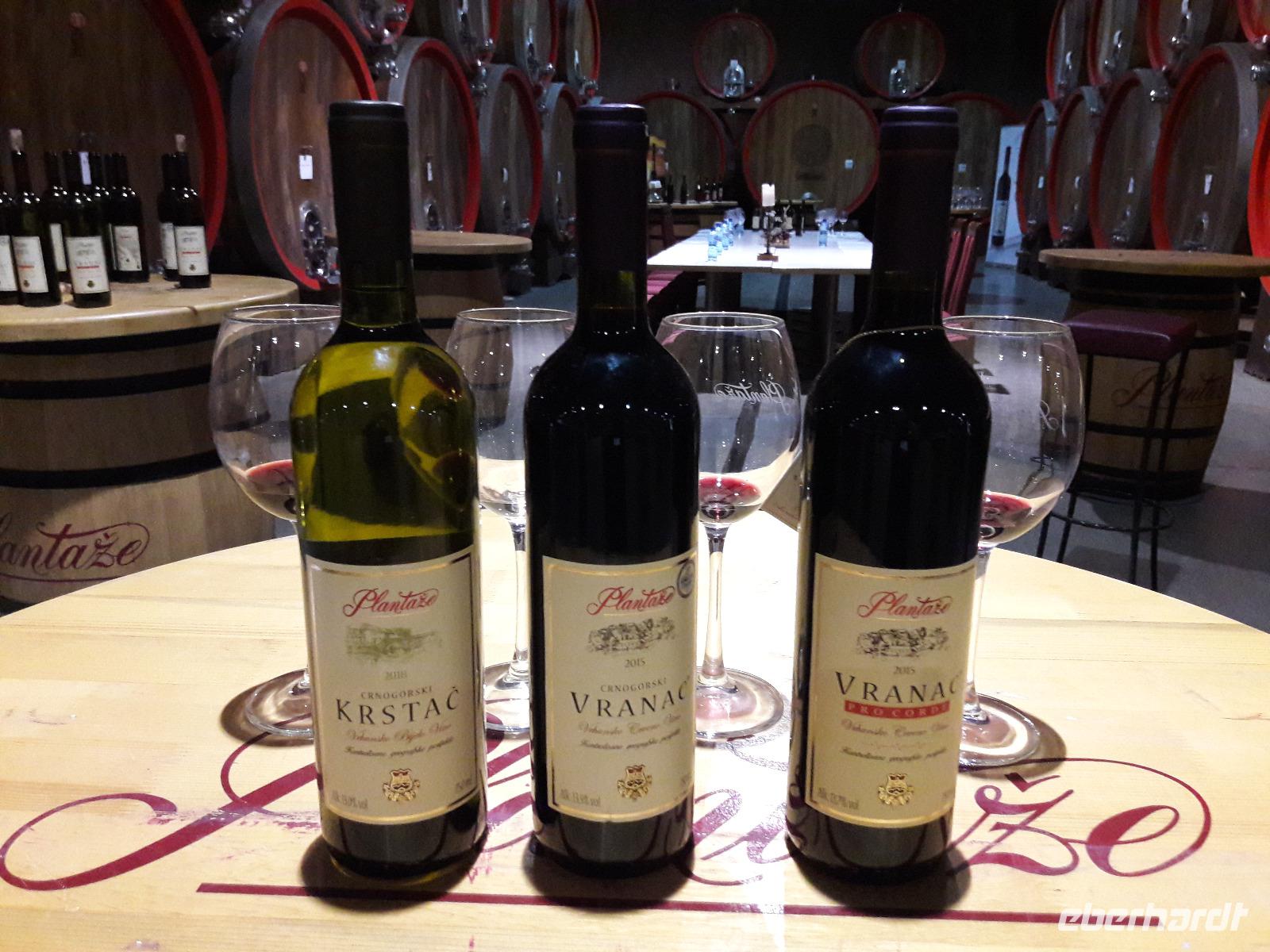 Nach diesem Abstecher brauchen wir unbedingt eine „Abkühlung" und so starten wir zu einem Besuch des Weingutes „13. Juli" in Sipcanik (der Name steht für die Unabhängigkeit Montenegros im Jahr 2006). Das Unternehmen, 1963 gegründet, ist heute eine Aktiengesellschaft (dem Staat gehören über 50%) und hat die beiden Weinkeller, die früher militärisch genutzt wurden (hier wurden Flugzeuge „gebunkert"), 2007 eröffnet. Von der jährlichen Produktion, die sich zwischen 14 und 17 Millionen Liter bewegt, werden wir ein paar Schlückchen probieren. Insgesamt drei Weinsorten dürfen wir verkosten, darunter befindet sich auch der schon relativ bekannte „Vranac" (2x) und der „Krstac". Dass uns die Weine munden, zeigt der anschließende Andrang im Verkaufsraum. Damit hätten wir dann auch die Frage der „Mitbringsel" geklärt.