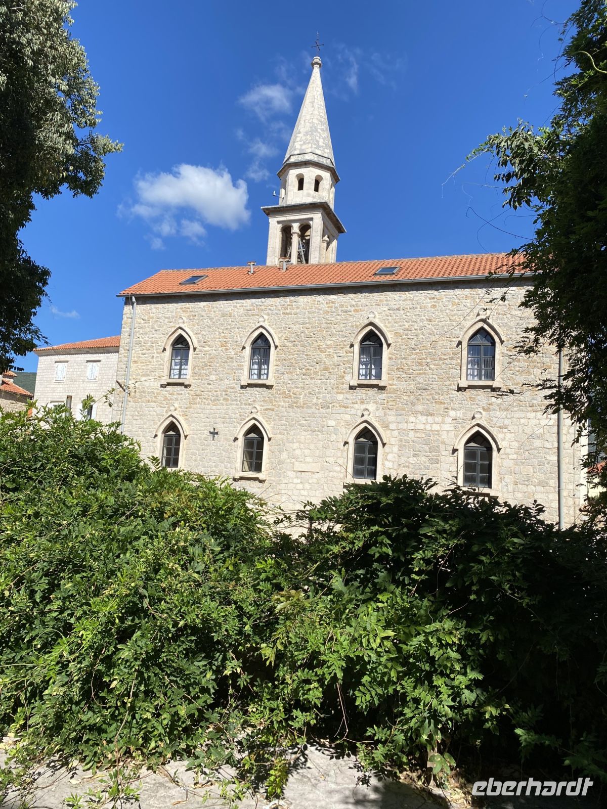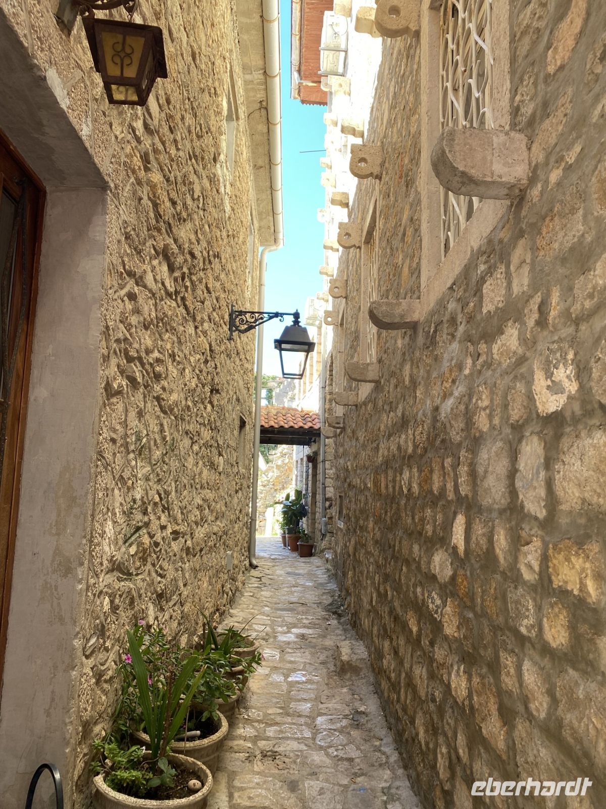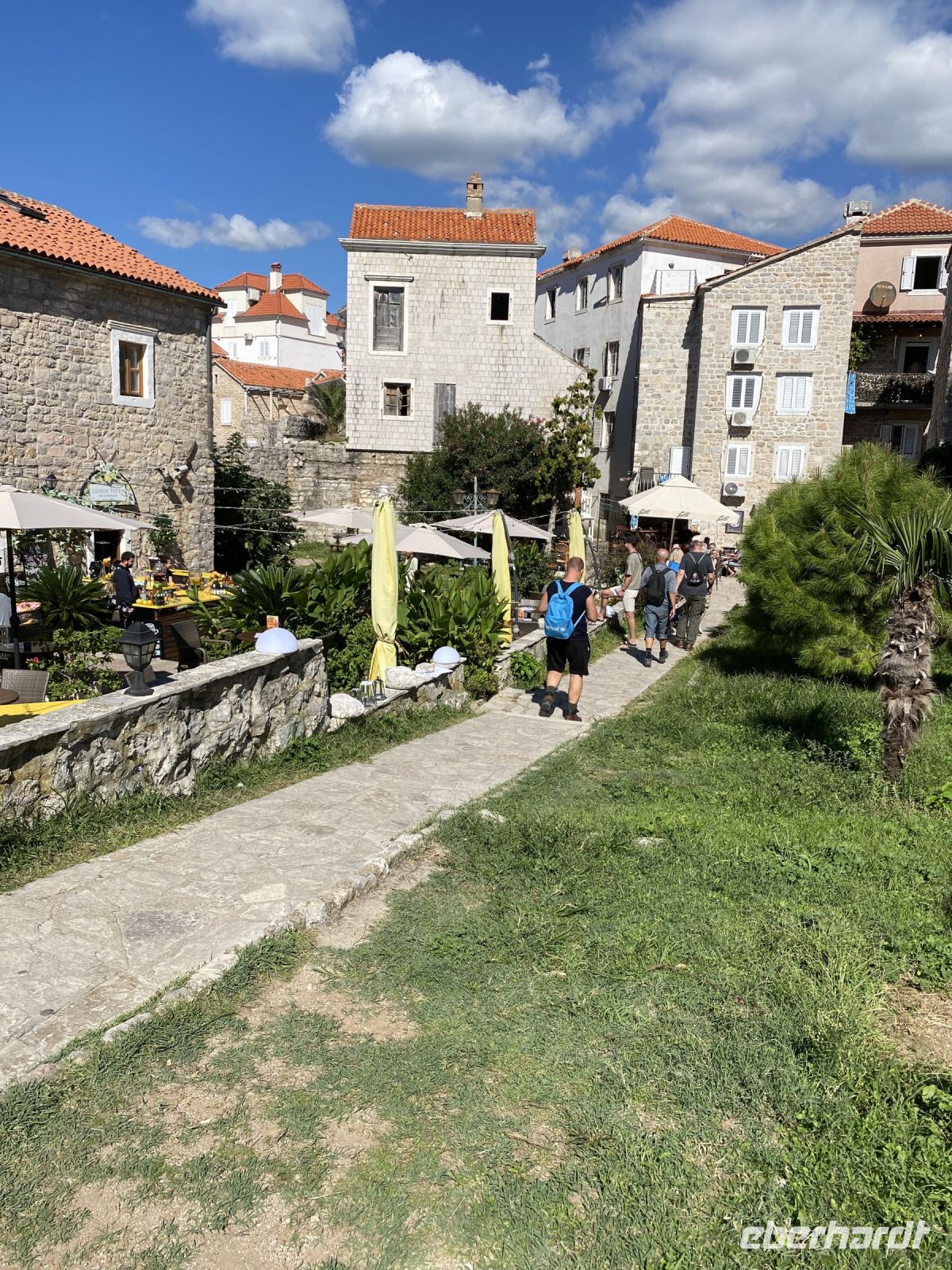 An der Insel Sveti Nikola, auch Hawai genannt vorüber kehren wir zur Anlegestelle in Budva zurück und besuchen nun die kleine Altstadt. Diese war früher eine Insel, erst durch Ablagerungen von Sanddünen entstand die Landverbindung. Eine Mauer umgibt die Altstadt, die man durch zwei Tore betreten kann. Budva hat eine lange Geschichte, die heutige Altstadt errichtete man Ende des 15. Jahrhunderts auf Resten aus dem 9. Jahrhundert. 1979 wurde die Stadt beim Erdbeben stark zerstört und danach mit großer Unterstützung des ganzen Jugoslawien nach Plänen aus den Archiven wieder aufgebaut. Die größte Kirche mit einem hohen Turm ist die Kirche Johannes des Täufers zum Teil aus dem 9. Jahrhundert stammend, der Glockenturm wurde 1867 errichtet. In der orthodoxen Kirche der Heiligen Dreifaltigkeit kann man wertvolle Wandmalereien bewundern.