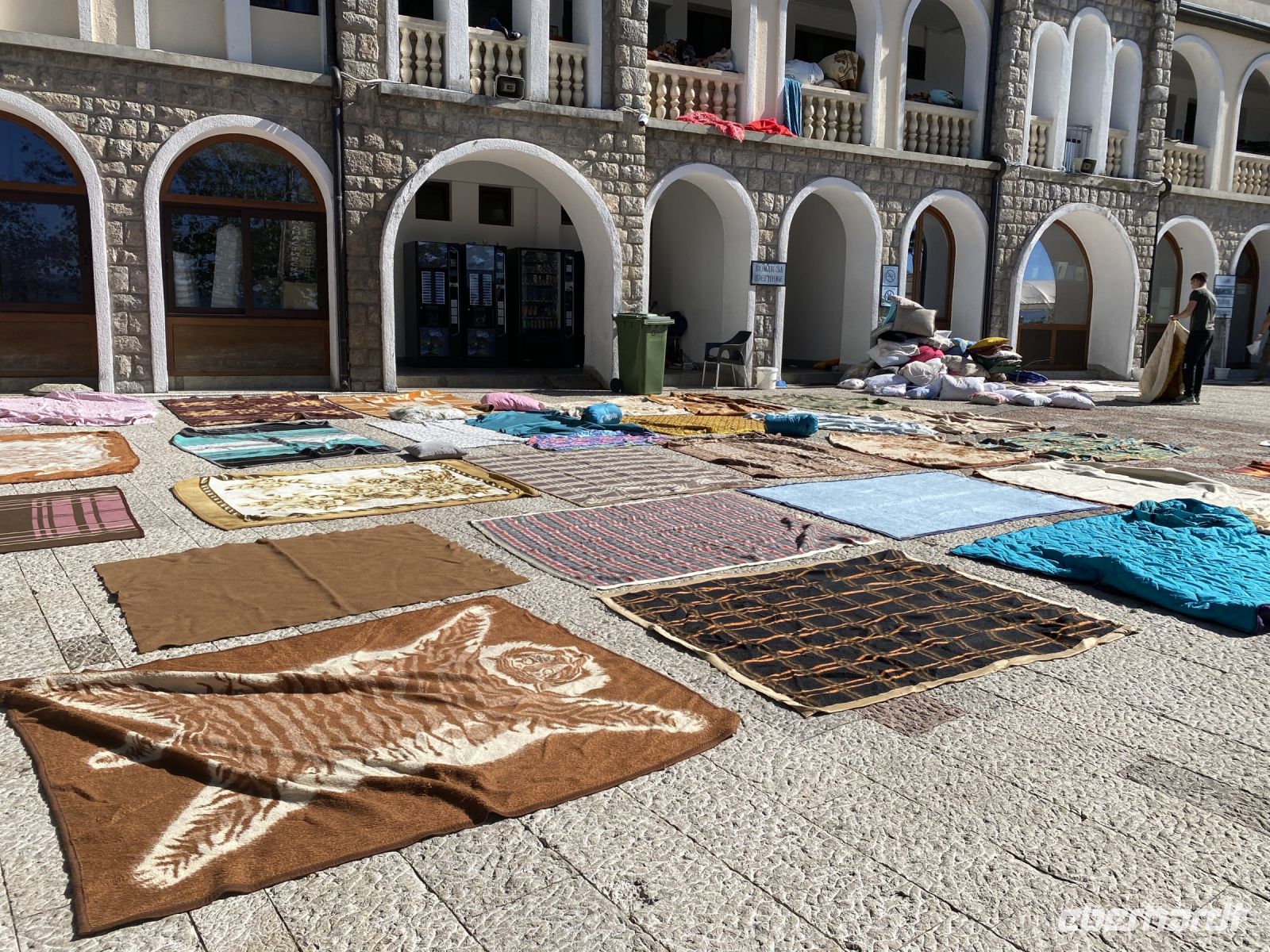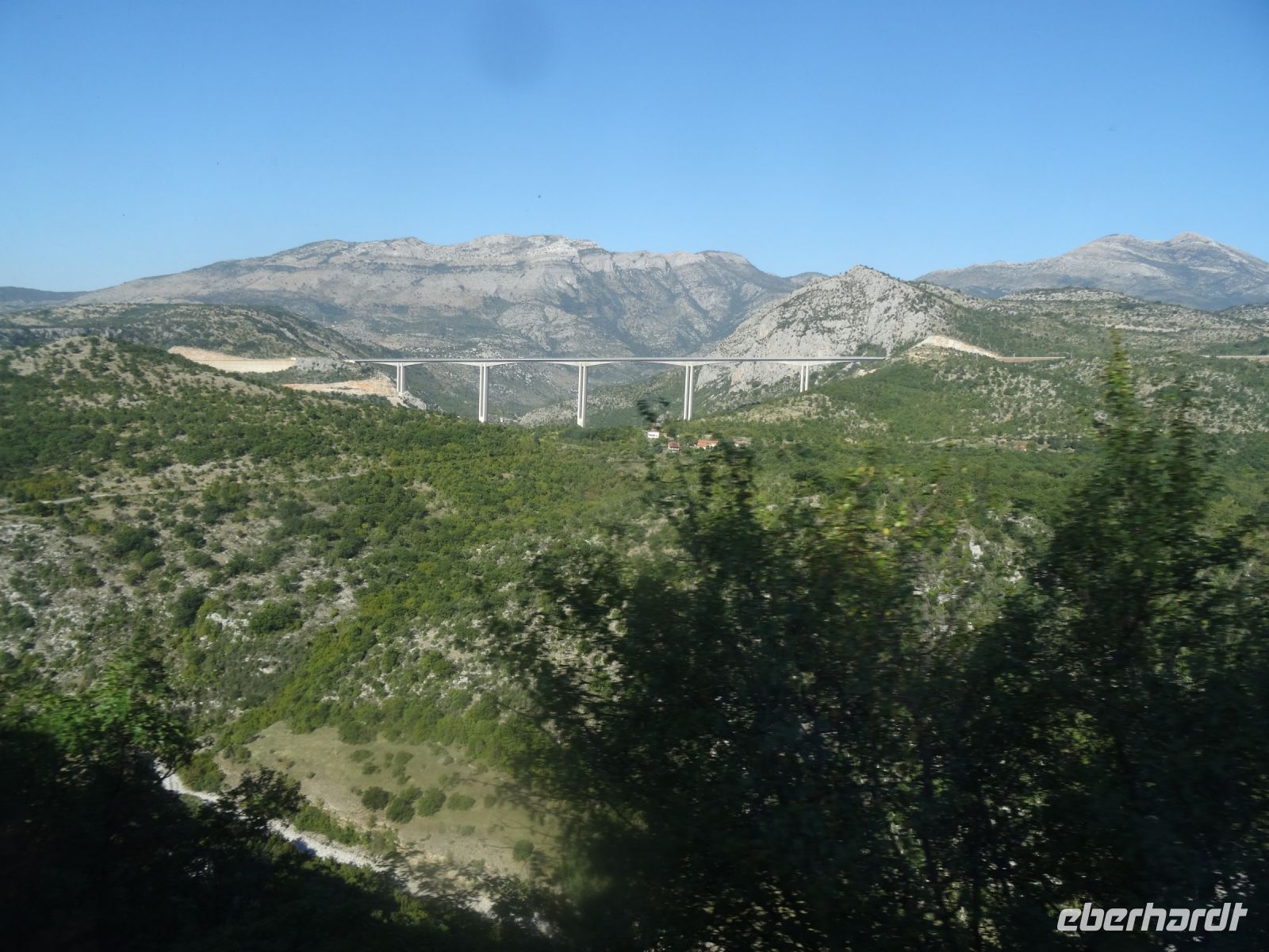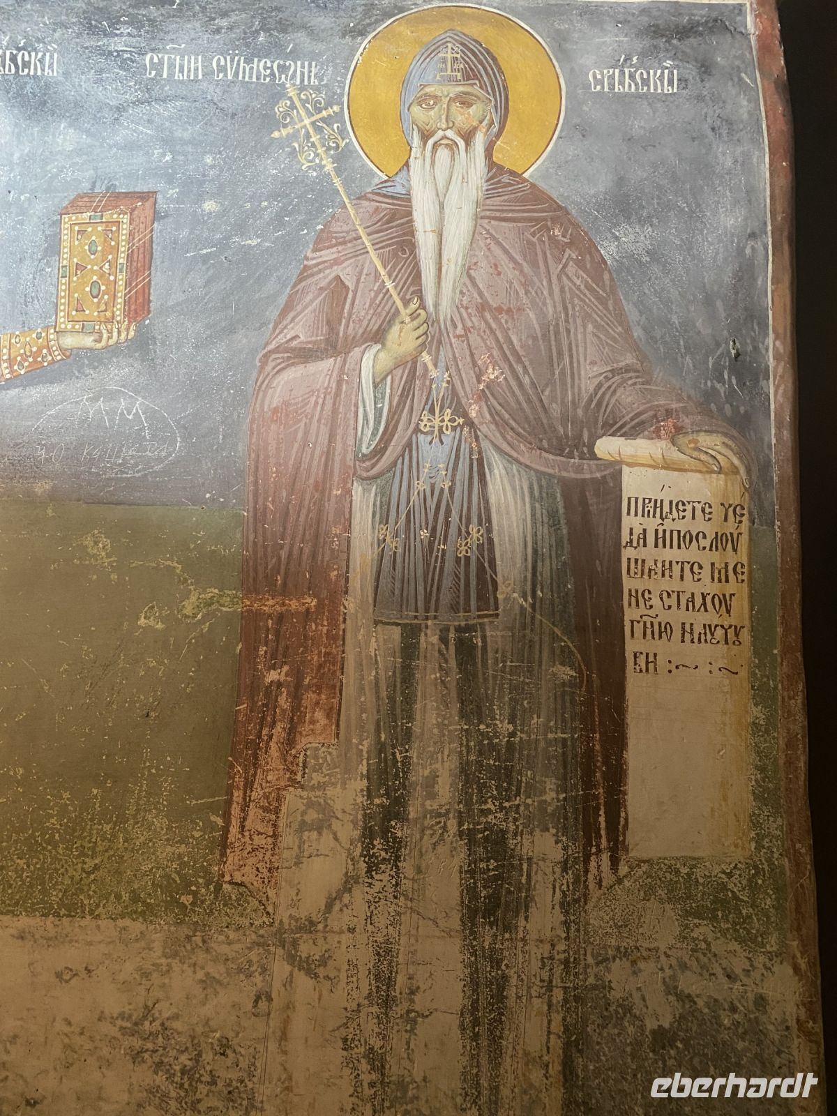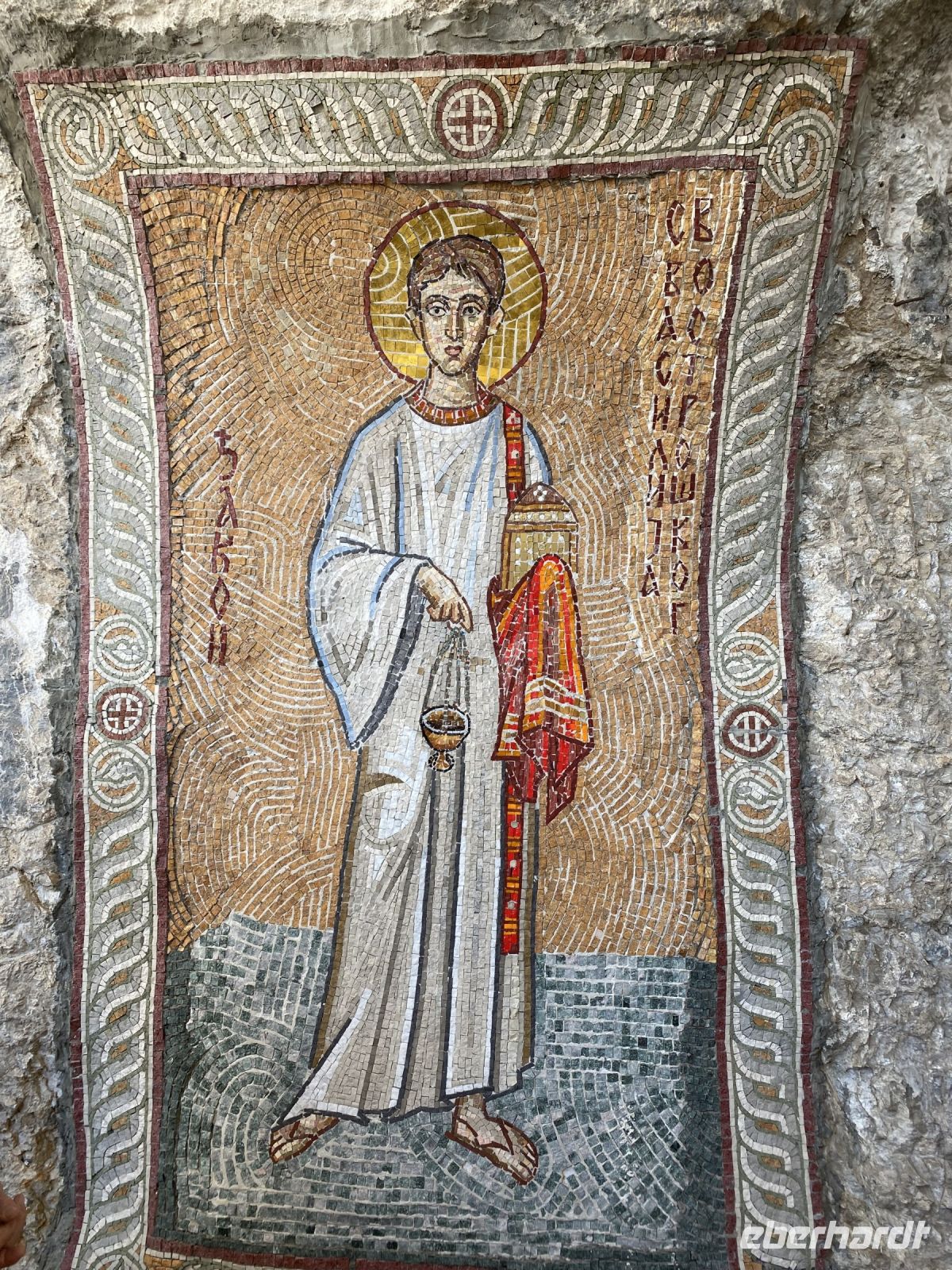 Bei bestem Sonnenschein machen wir uns auf den Weg zum Kloster Ostrog, welches die Gebeine des Heiligen Vasilije beherbergt. Auf zahlriechen Serpentinenschraubt sich unser Bus nach oben. Die Straße ist so schmal, das zwei Fahrzeuge nur an Ausweichstellen passieren können. Das bedeutet, Rückwärtsfahren muss man unbedingt beherrschen auf dieser Zufahrt zum Kloster. Auf dem unteren Parkplatz ist für unseren großen Bus Endstation und wir steigen in Kleinbusse um, auf ca. 900 m Höhe erreichen wir das Kloster, imposant ist das Gebäude in den Felsen hineingebaut. Der heilige Vasilije wird von vielen Menschen verehrt, es kommen nicht nur Orthodoxe, auch Muslime und Katholiken verehren den Heiligen. Er hatte sich 1665 vor den Türken in die Berge zurückgezogen und ließ das Kloster erbauen, in dem er 1671 starb. Bemerkenswert sind die Wandbilder von Heiligen, direkt auf den Stein gemalt. In einer Nische der Gruftkirche sieht man eine Bombe, die im II. Weltkrieg auf das Kloster abgeworfen wurde, aber nicht explodierte. Diese Rettung des Klosters wird dem Wirken des heiligen Vasilije zugeschrieben.