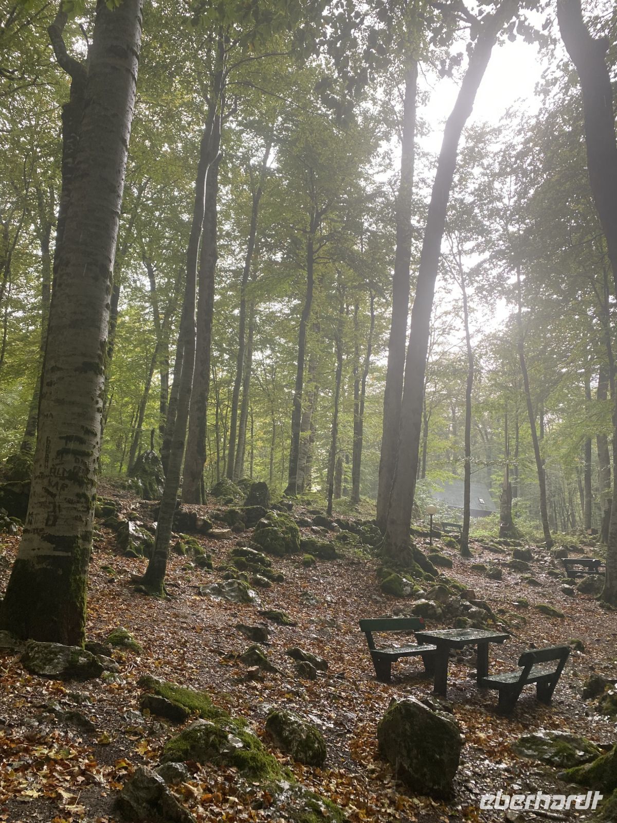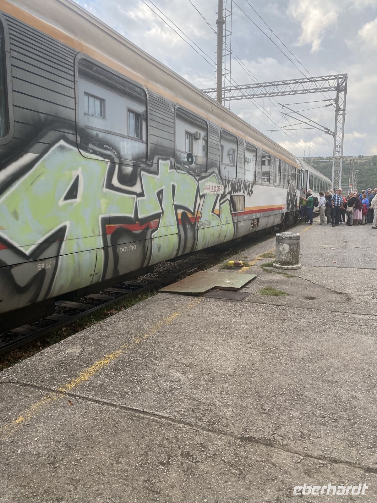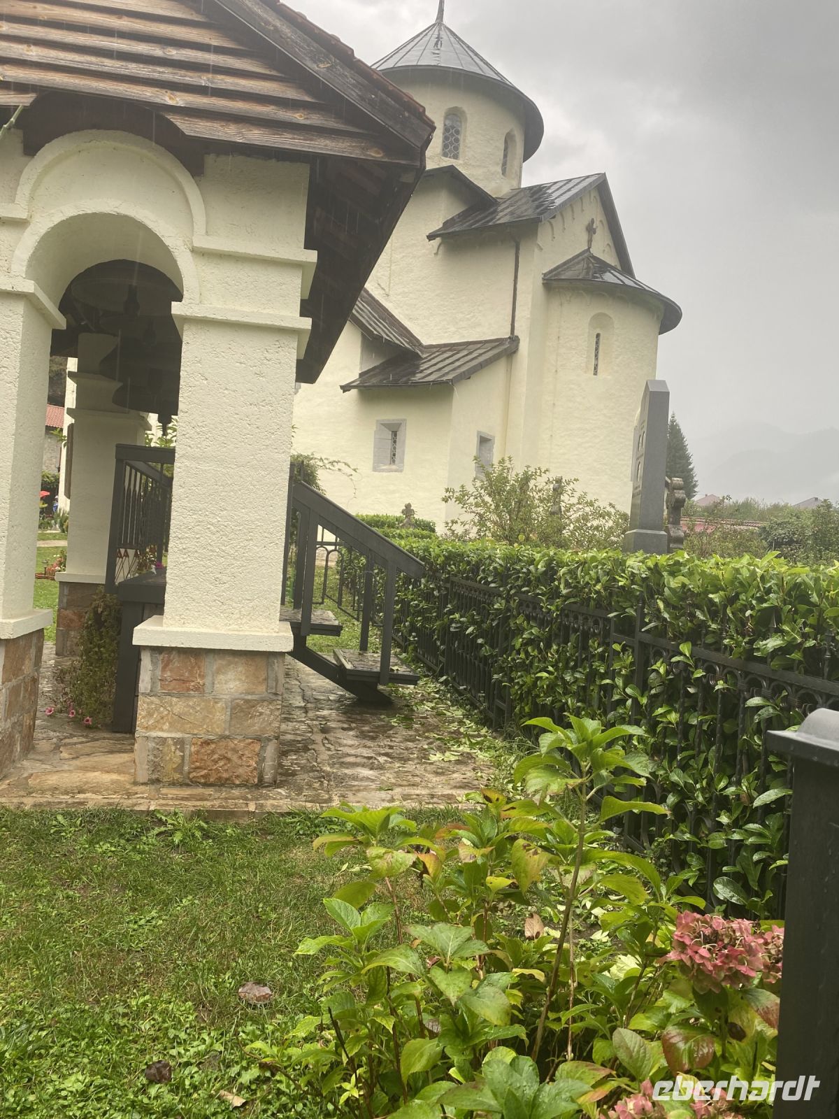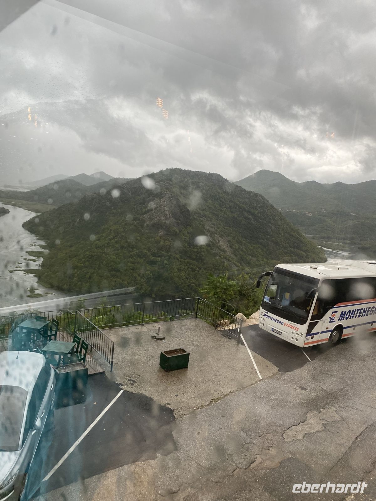 6:30 starten wir heute, da wir um 8:00 Uhr den Zug in Bar erreichen wollen. Bewaffnet mit einem Lunchpaket machen wir uns auf den Weg. Aber zum ersten Mal während unserer Reise ist uns der Wettergott nicht hold - es regnet. In Bar besteigen wir den Zug und pünktlich fährt er los in Richtung Kolasin in den Bergen. Eigentlich ist das eine spektakuläre Fahrt mit tollen Blicken in die zerklüftete Karstlandschaft Montenegros, aber leider rinnt das Wasser an den zugfenstern herab und zerstört uns die Aussicht. Wir trösten uns mit dem Lunch vom Hotel und eingekauften Spezialitäten und stoßen mit "Loza" auf den Tag der Einheit an. In Kolasin regnet es noch immer, also kein Stadtspaziergang. Stattdessen gehen wir in das hübsche Hotel Bianca und wärmen uns mit einer Tasse Kaffee auf. Danach steht der Nationalpark Biogradska Gora auf dem Programm. Wir fahren hin, aber eine größere Wanderung können wir regenbedingt nicht unternehmen. Alle bewundern die Baumriesen, die geheimnisvoll den See einrahmen, es wird fotografiert, ein wenig die Beine vertreten und dann sind wir feucht genug - auf zum letzten Programmpunkt: durch die Moraca -Schlucht zum gleichnamigen Kloster. Durch den Regen sehen wir nur wenig von der Schlucht, aber das Kloster beeindruckt durch seine harmonischen Gebäude und die gepflegten Außenanlagen. Einige erstehen Klosterhonig oder Tee, dann heißt es zrück zum Hotel.
