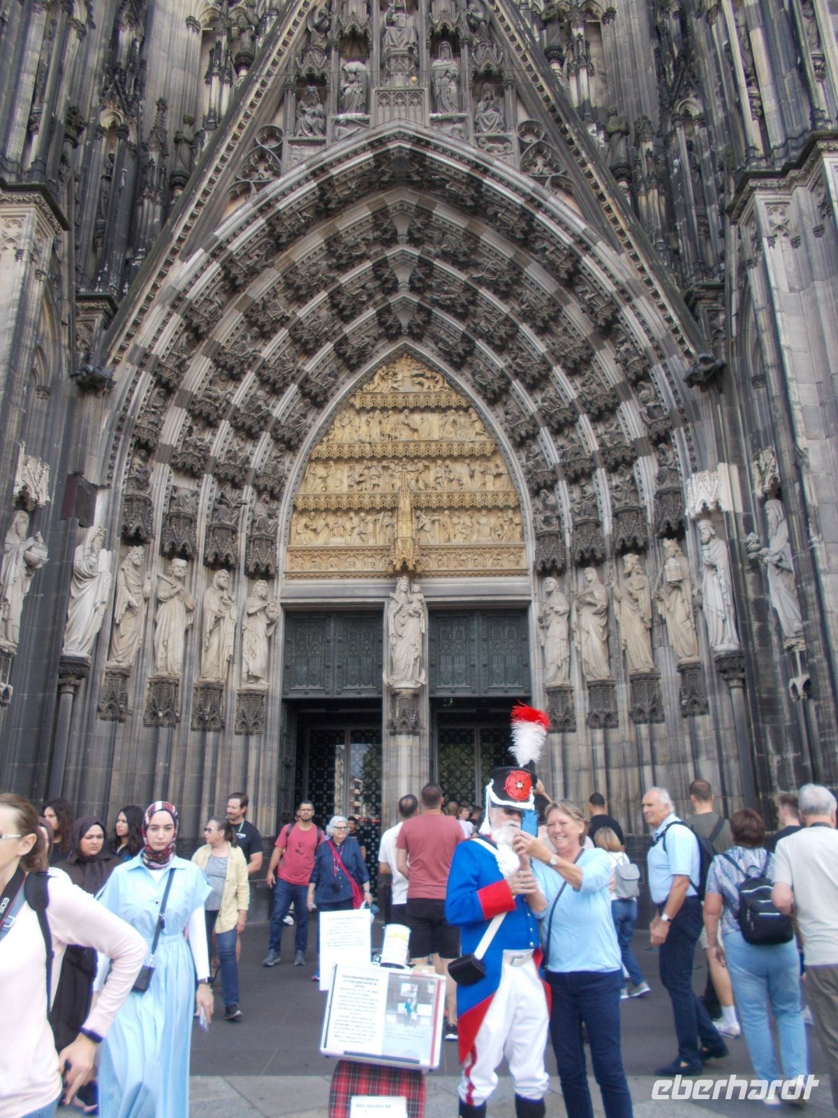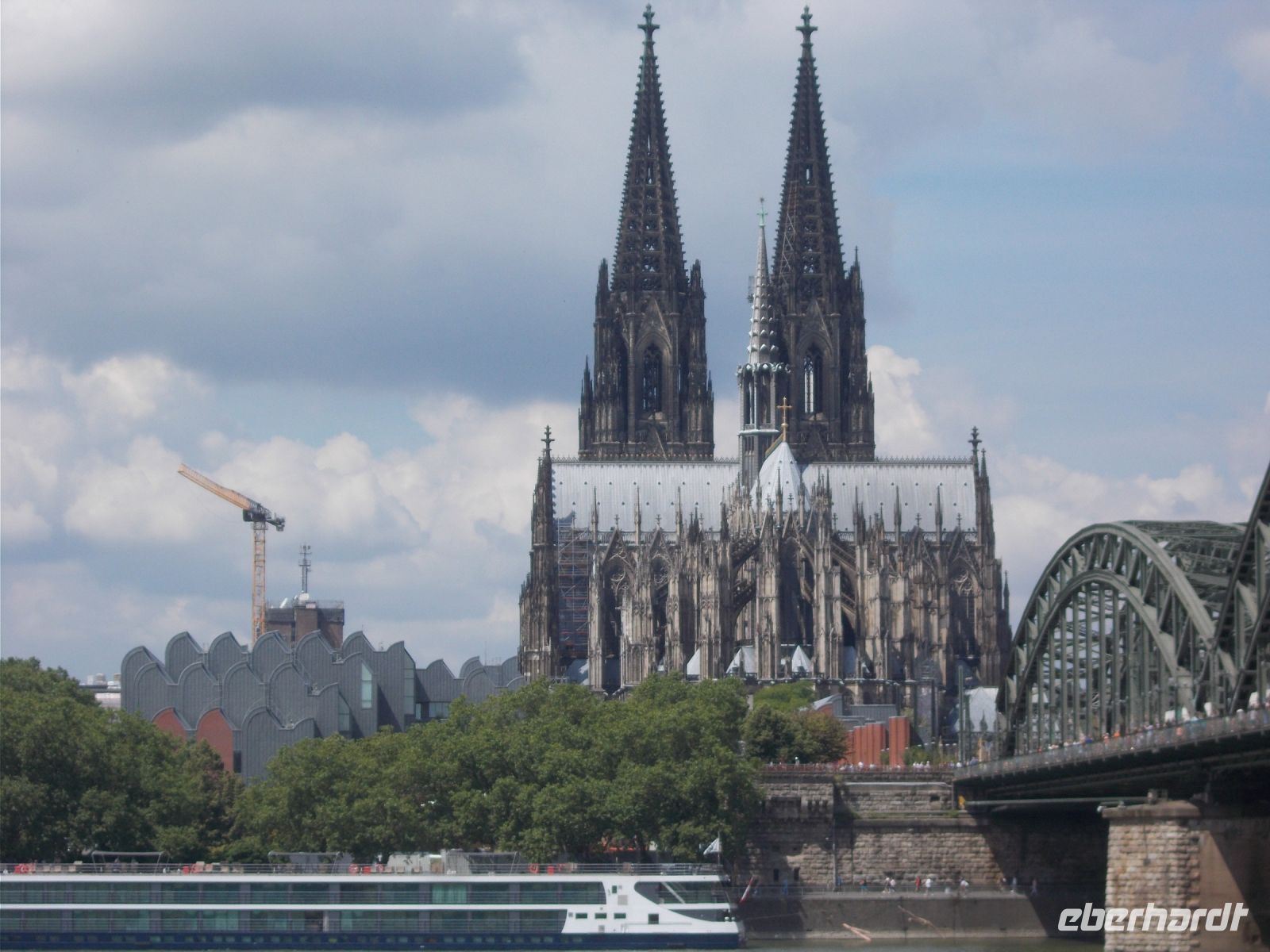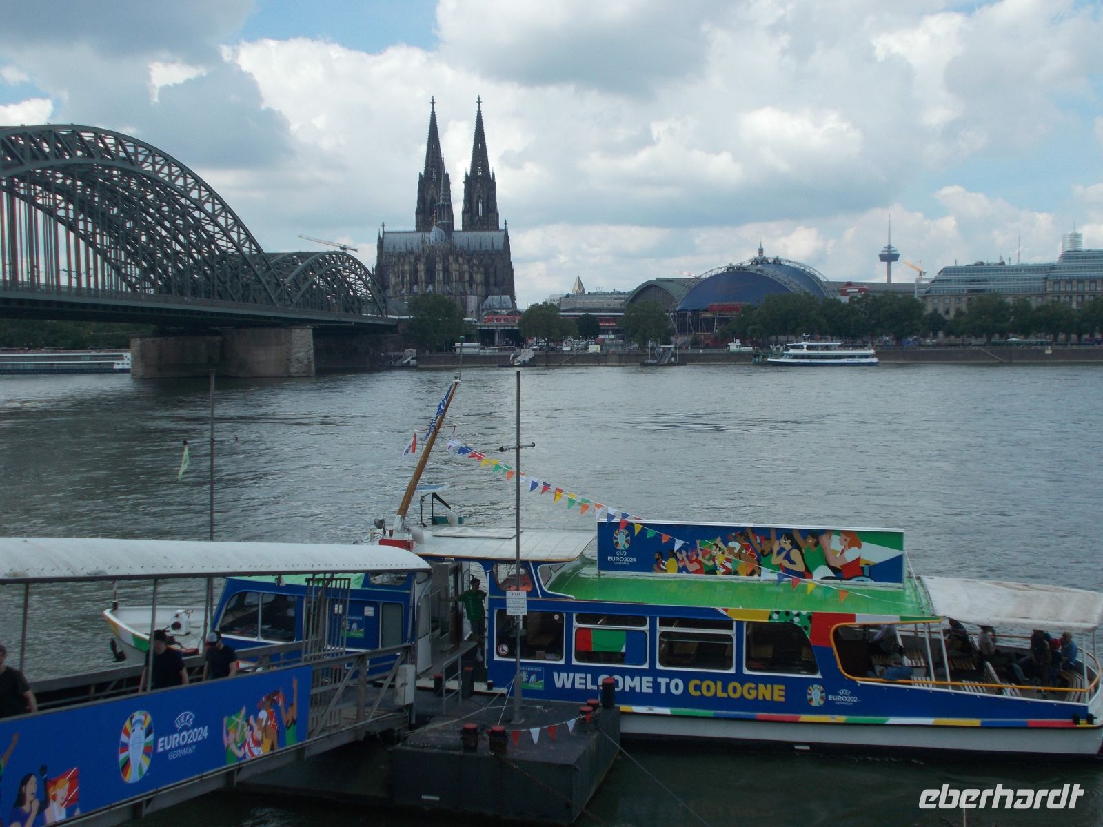 Nach dem Frühstück und dem Anbringen unserer Kofferbänder ,starteten wir Richtung Köln. In der Nähe des Doms trafen wir unseren Stadtführer, Michael,der uns begleiten wird. Wer schon in Köln ist muß, unbedingt versuchen das gigantische Wahrzeichen - den Dom, auch von innen zu besichtigen.Sonntags wird zwar die Messe dort zelebriert, aber wir schafften es einen Blick ins Innere zu werfen.Danach ging es zur Stadtrundfahrt. Die Straßen und Plätze waren immer noch gut belebt von den vielen Fußballfans ,die zum Spiel -Belgien / Rumänien- nach Köln angereist waren.Wir legten einen Fotostop am Rheinufer ein .An der gegenüberliegenden Seite sahen wir auf ein wunderschönes Panorama von Köln.Die Stadt hat sich zur viertgrößten Metropole von Deutschland entwickelt. Für die Einheimischen gibt es nur 3Ks, die wirklich für die Stadt interessant sind : 1. Kölsch - Bier und Sprache .