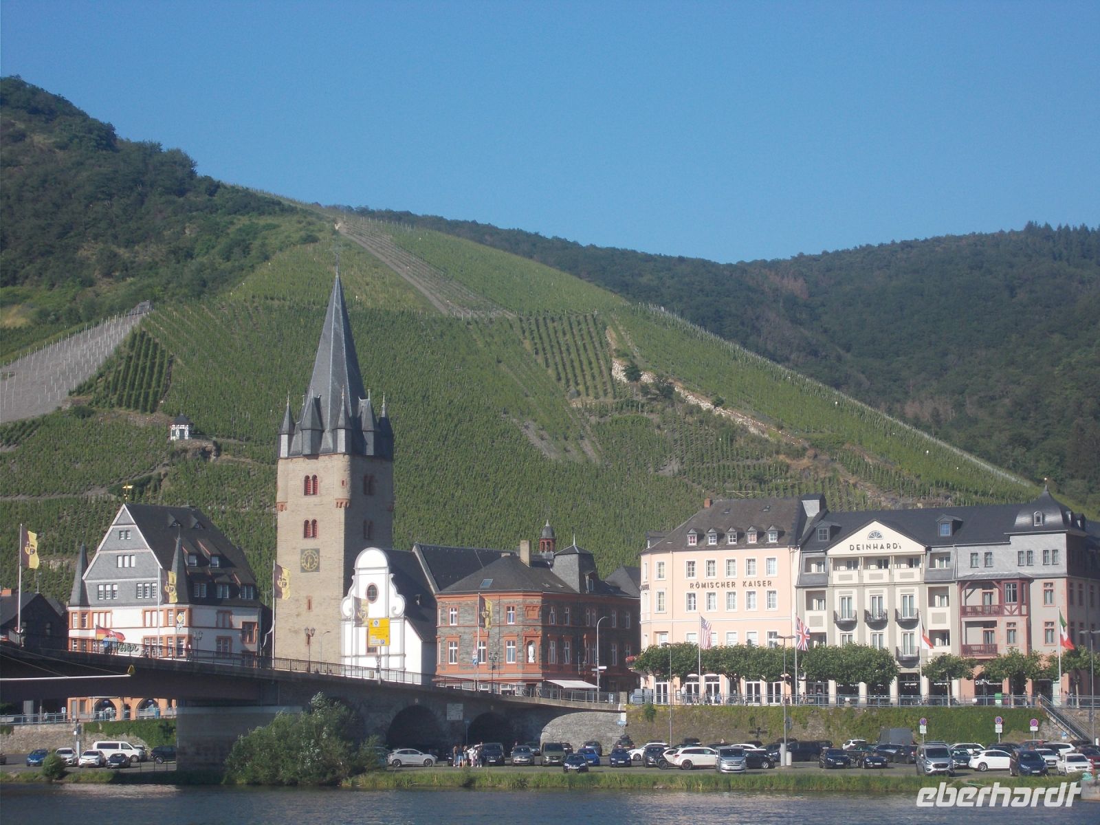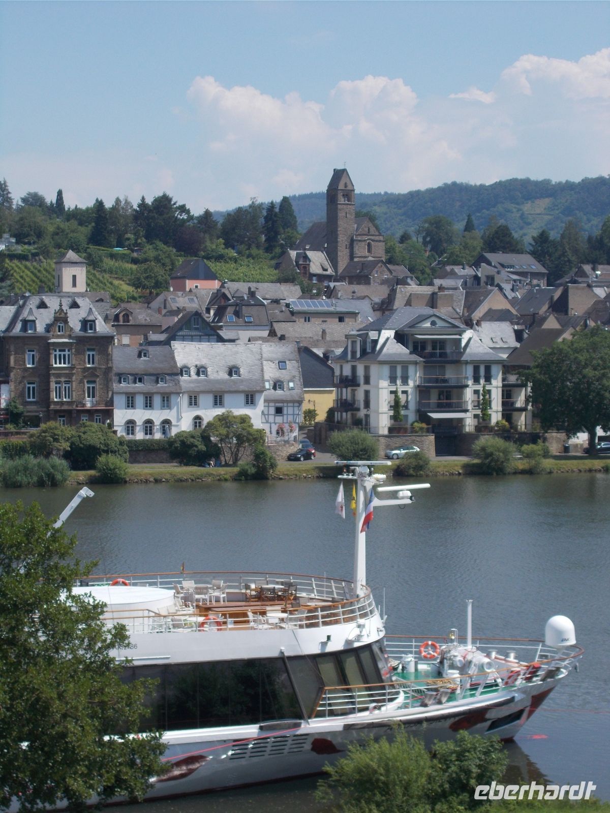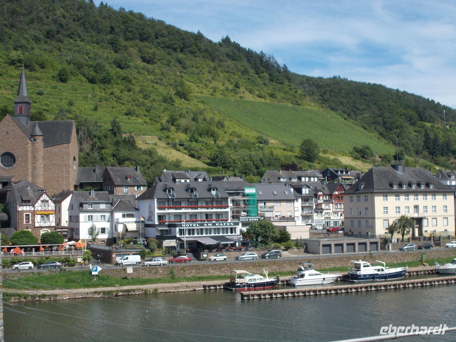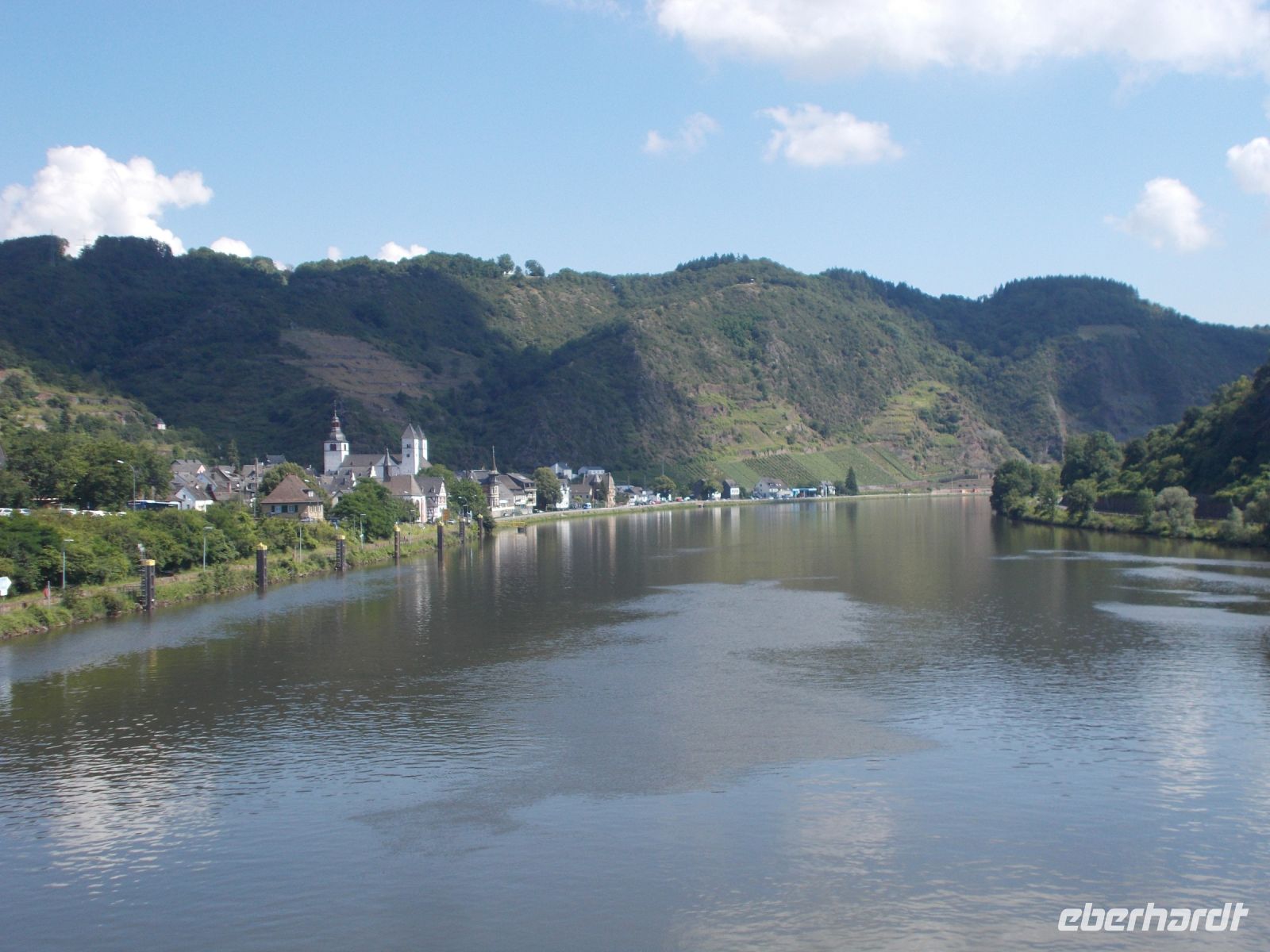 Das Frühstück nahmen wir also auf der Mosel ein und schon bald erreichten wir unseren Anleger in Treis - Karden. Das Städtchen erstreckt sich auf beiden Seiten des Rheins und verbindet sie durch eine Brücke. Ein beschaulicher kleiner Ort, mit vielen alten Fachwerkbauten. Die Anwohner müssen nur gute Nerven haben ! Die Zugstrecke führt direkt an einigen Balkons vorbei- man muß dies schon wollen und aushalten können. Als die Kelten hier vor über 2000 Jahren ihre Kultstätte errichteten und danach der heilige Castor hier siedelte, war es auf alle Fälle ruhiger. Castor war der erste Missionar im Moselgebiet. Ihm zu Ehren wurde die Kirche St.Castor gebaut. Heute ist sie die älteste Kirche, an der Mosel zwischen Trier und Koblenz - auch Moseldom genannt.Am Nachmittag sollten wir unseren Landgang beendet haben, denn das Schiff legte ab und vom Sonnendeck konnten wir die vorbeiziehende, liebliche Landschaft der Mosel genießen.