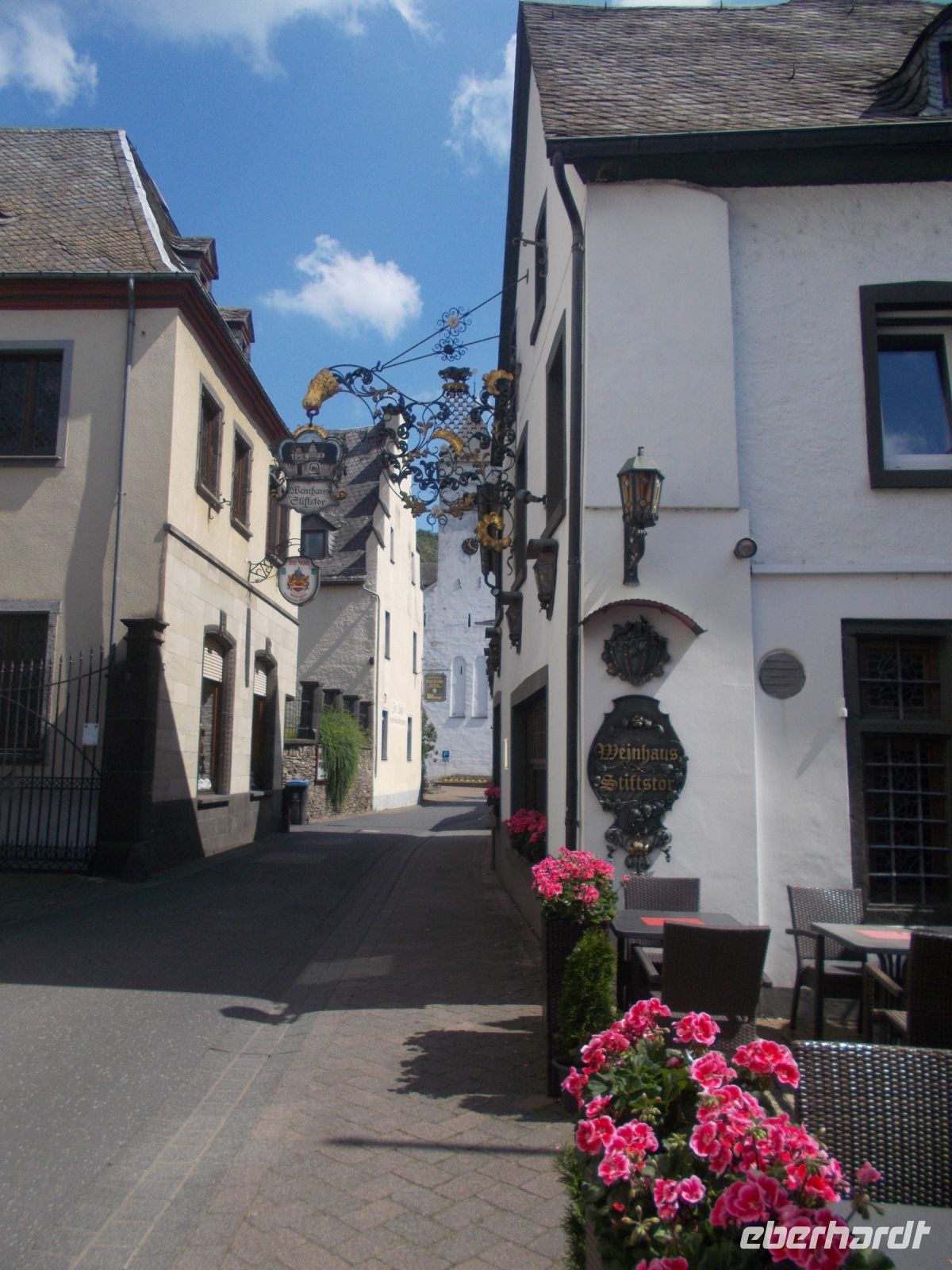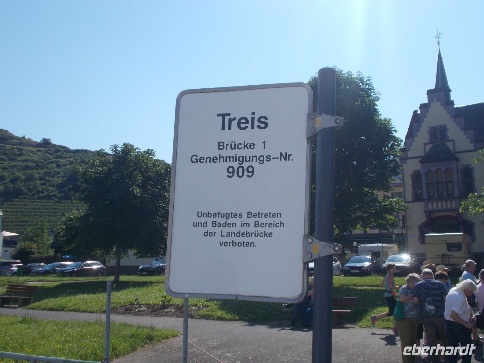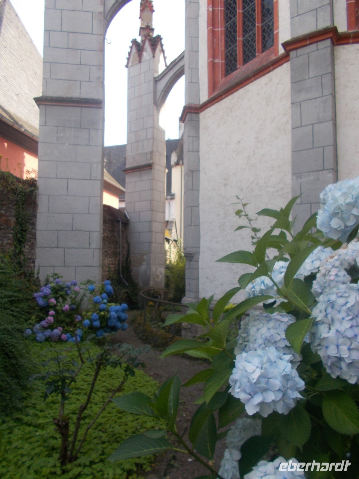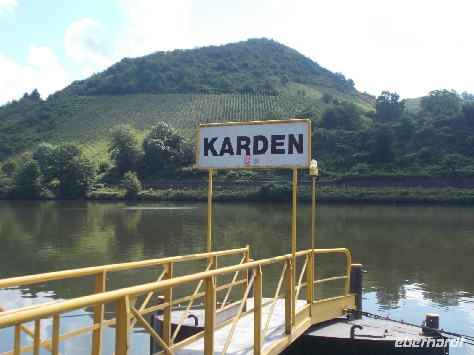 Das Frühstück nahmen wir also auf der Mosel ein und schon bald erreichten wir unseren Anleger in Treis - Karden. Das Städtchen erstreckt sich auf beiden Seiten des Rheins und verbindet sie durch eine Brücke. Ein beschaulicher kleiner Ort, mit vielen alten Fachwerkbauten. Die Anwohner müssen nur gute Nerven haben ! Die Zugstrecke führt direkt an einigen Balkons vorbei- man muß dies schon wollen und aushalten können. Als die Kelten hier vor über 2000 Jahren ihre Kultstätte errichteten und danach der heilige Castor hier siedelte, war es auf alle Fälle ruhiger. Castor war der erste Missionar im Moselgebiet. Ihm zu Ehren wurde die Kirche St.Castor gebaut. Heute ist sie die älteste Kirche, an der Mosel zwischen Trier und Koblenz - auch Moseldom genannt.Am Nachmittag sollten wir unseren Landgang beendet haben, denn das Schiff legte ab und vom Sonnendeck konnten wir die vorbeiziehende, liebliche Landschaft der Mosel genießen.