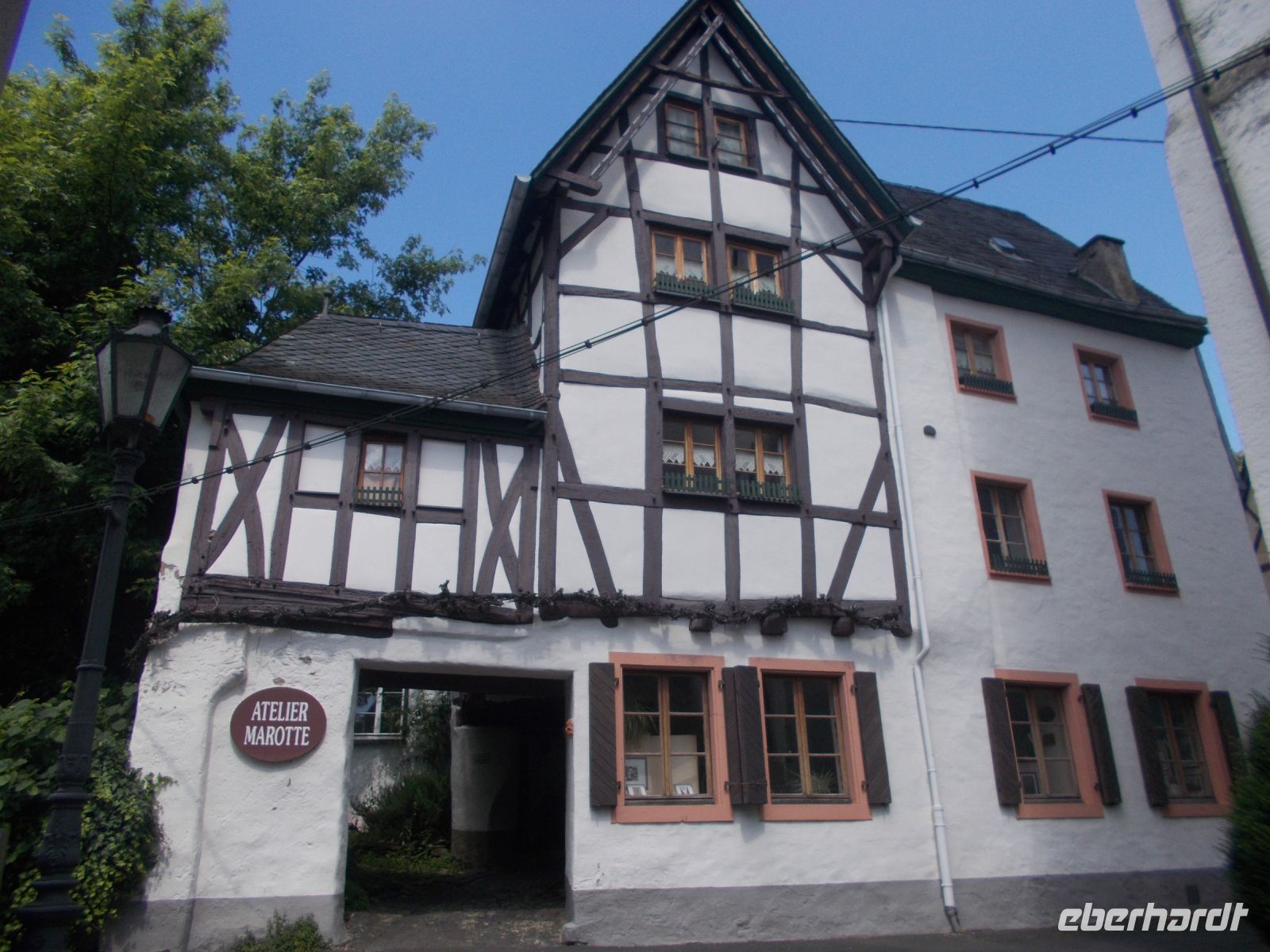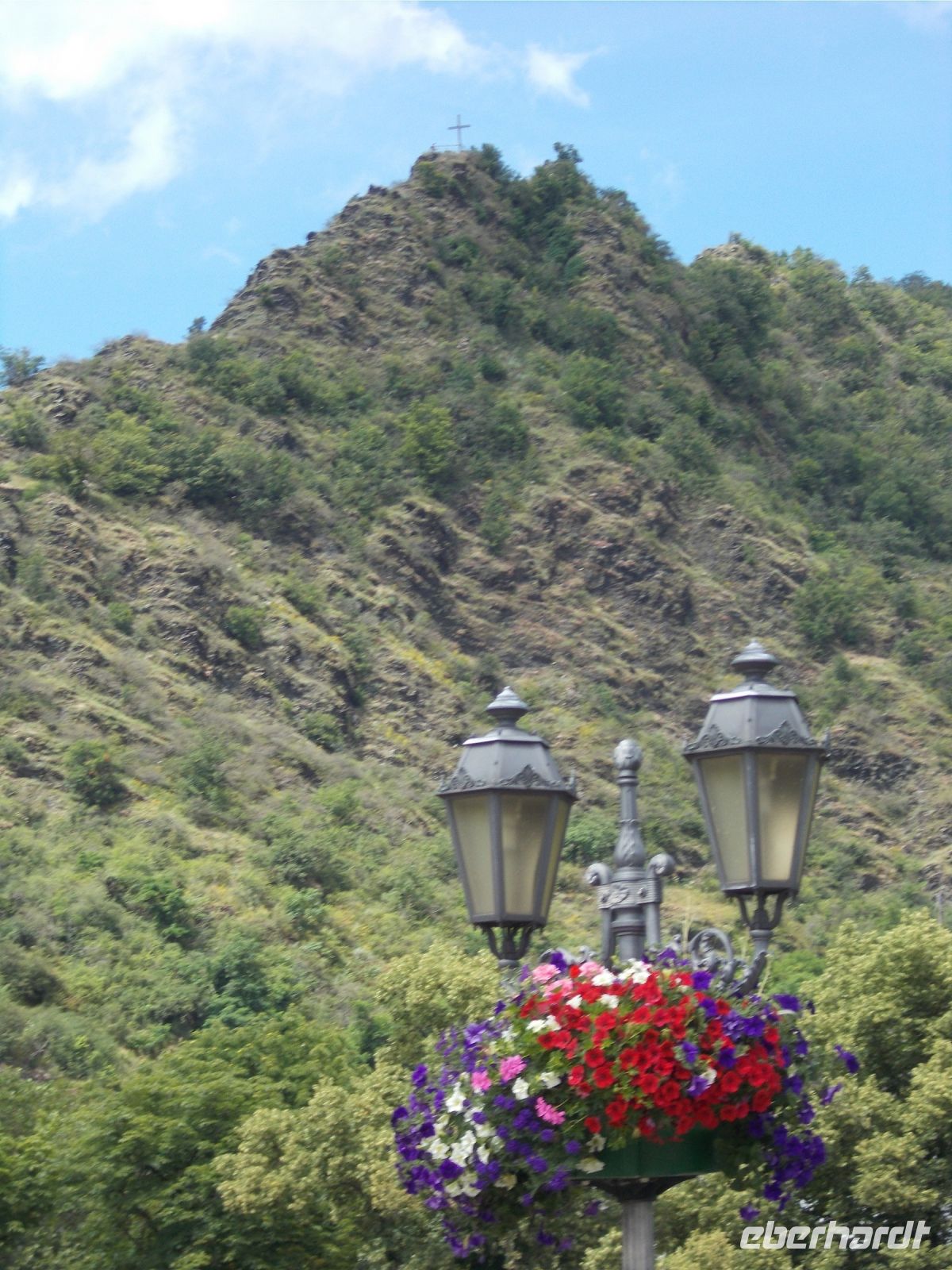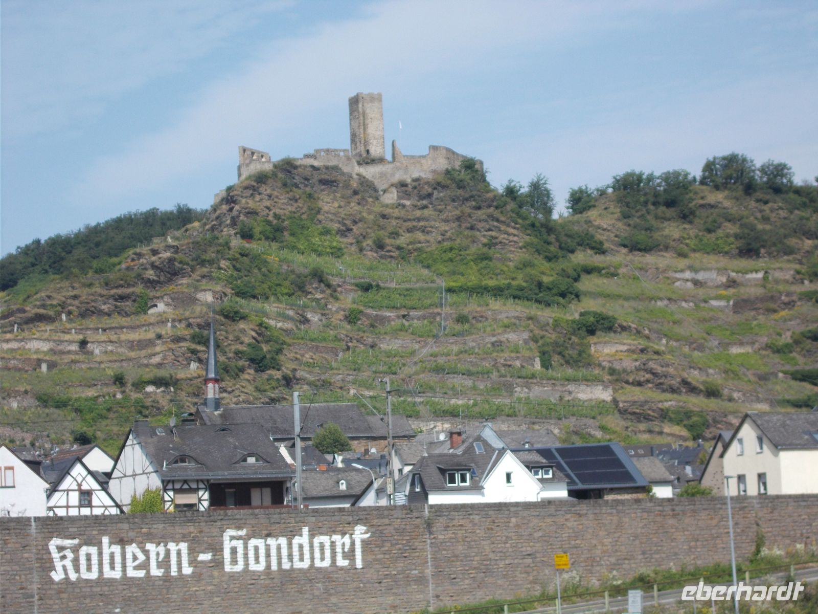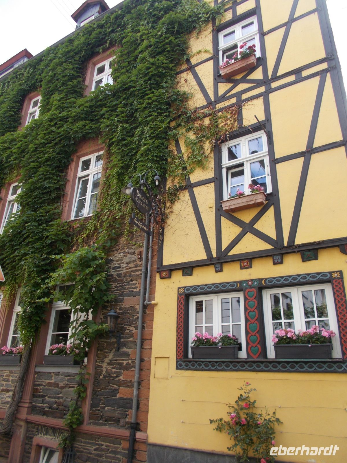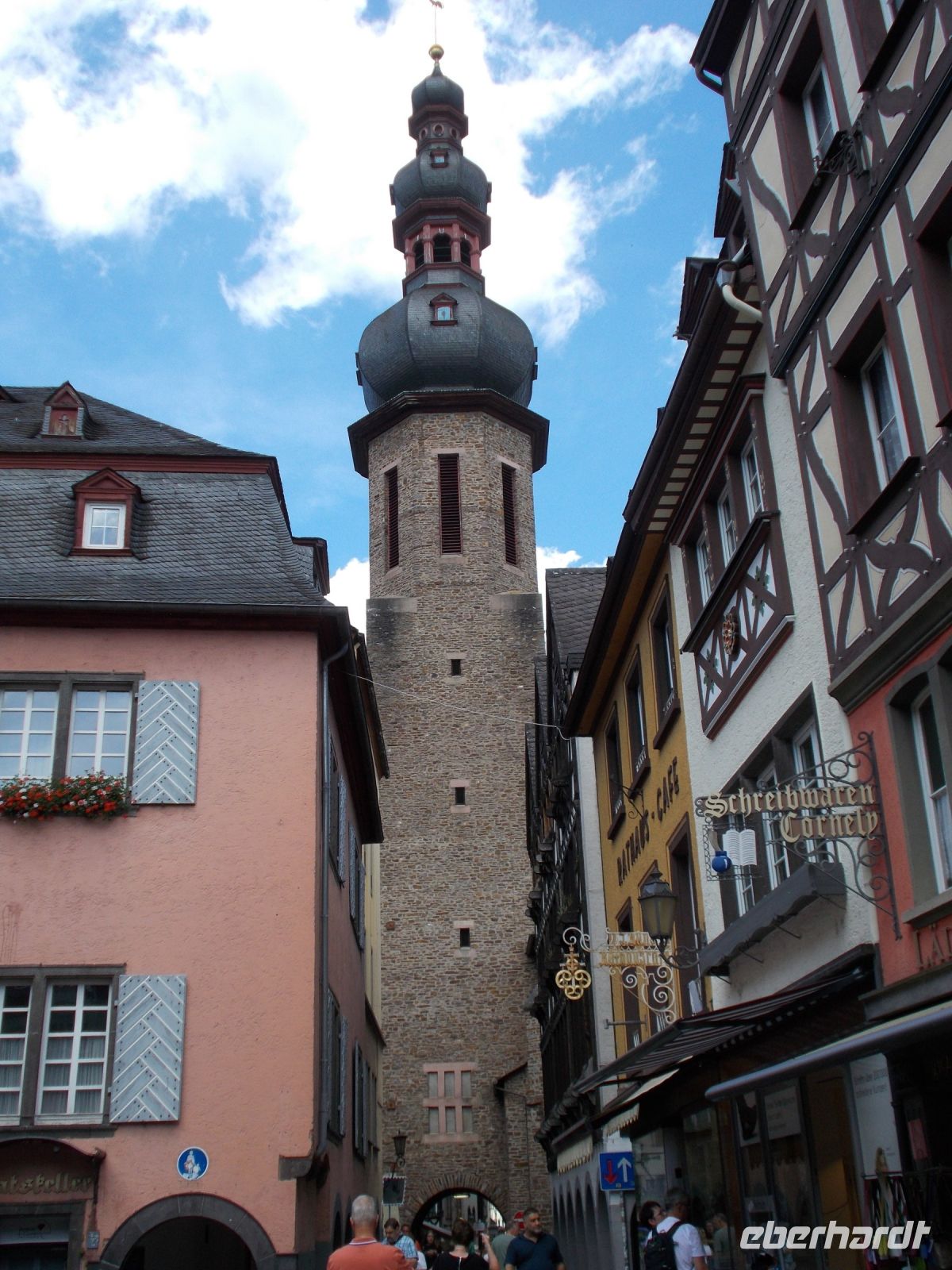 Das Frühstück nahmen wir also auf der Mosel ein und schon bald erreichten wir unseren Anleger in Treis - Karden. Das Städtchen erstreckt sich auf beiden Seiten des Rheins und verbindet sie durch eine Brücke. Ein beschaulicher kleiner Ort, mit vielen alten Fachwerkbauten. Die Anwohner müssen nur gute Nerven haben ! Die Zugstrecke führt direkt an einigen Balkons vorbei- man muß dies schon wollen und aushalten können. Als die Kelten hier vor über 2000 Jahren ihre Kultstätte errichteten und danach der heilige Castor hier siedelte, war es auf alle Fälle ruhiger. Castor war der erste Missionar im Moselgebiet. Ihm zu Ehren wurde die Kirche St.Castor gebaut. Heute ist sie die älteste Kirche, an der Mosel zwischen Trier und Koblenz - auch Moseldom genannt.Am Nachmittag sollten wir unseren Landgang beendet haben, denn das Schiff legte ab und vom Sonnendeck konnten wir die vorbeiziehende, liebliche Landschaft der Mosel genießen.