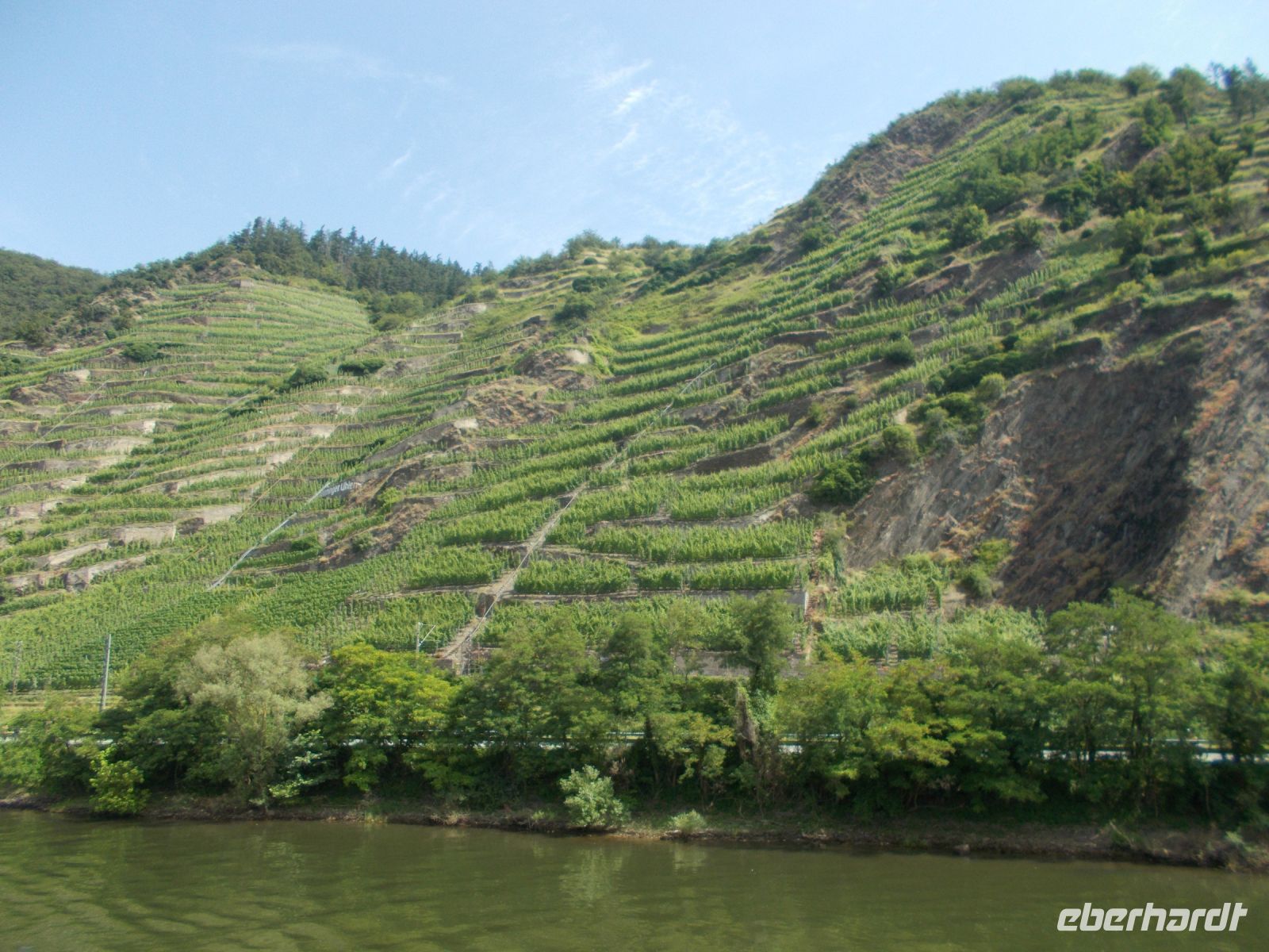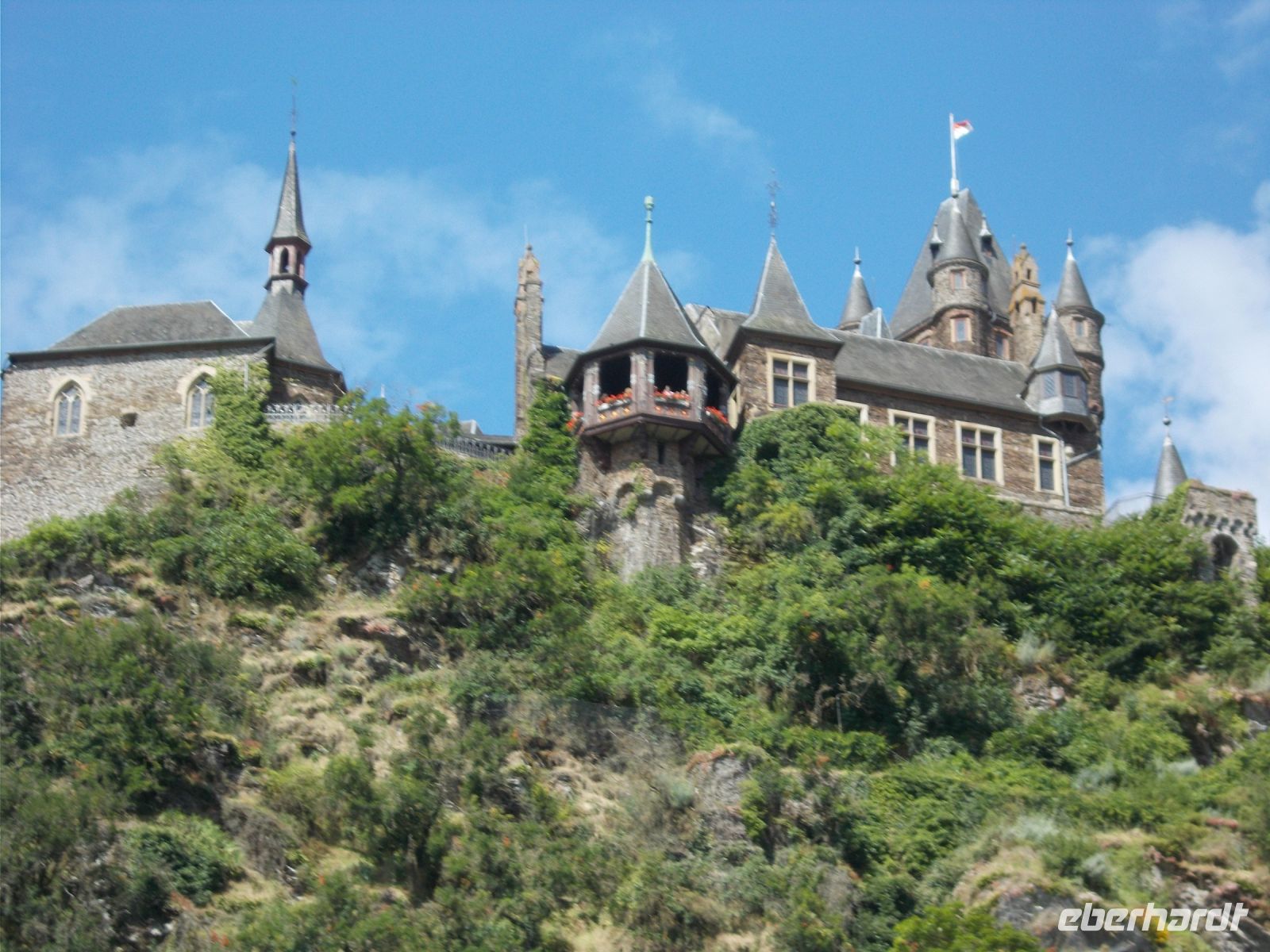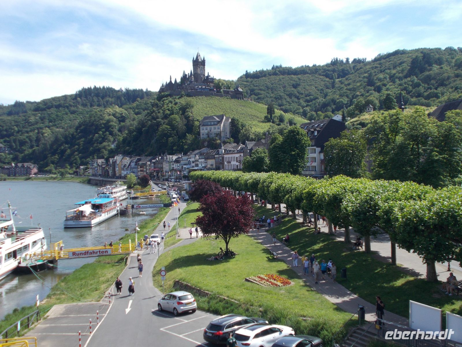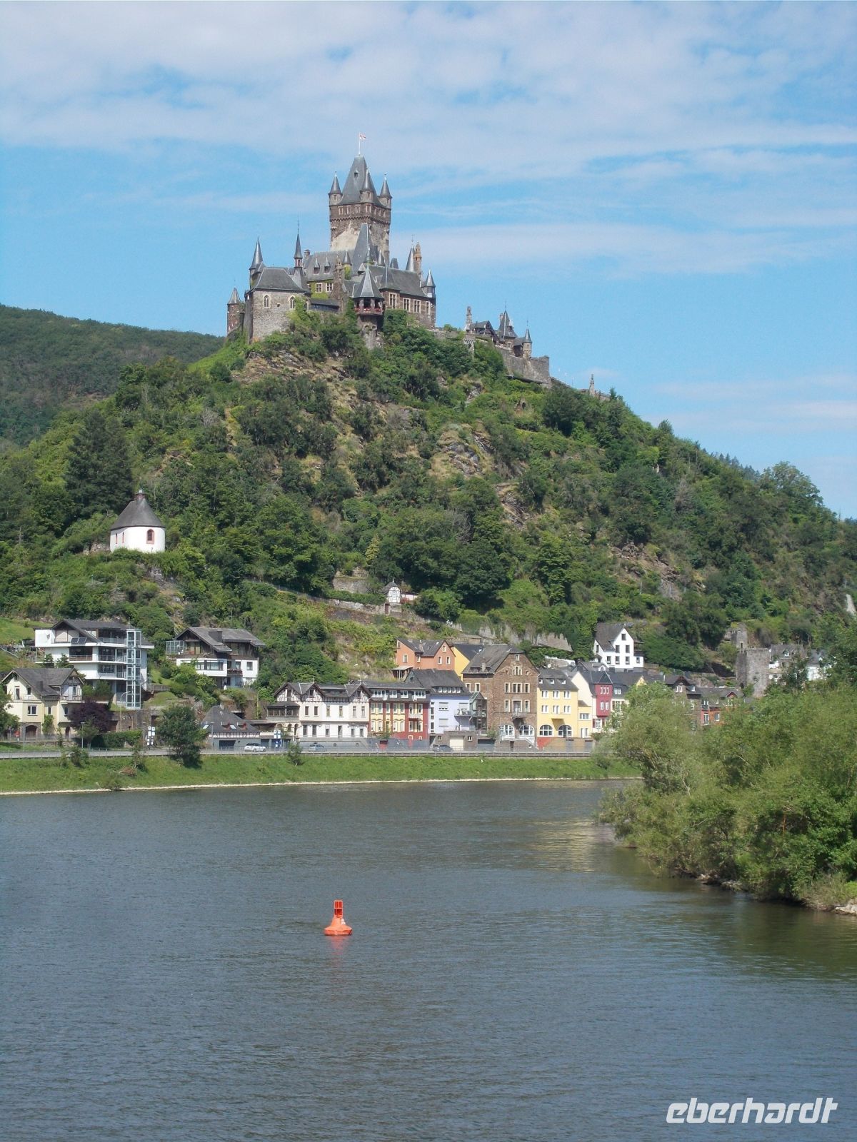 Bis Mittag Bordtag ! Wir können endlich einmal ,wieder bei angenehmen Temperaturen, die vorbeiziehende Landschaft vom Sonnendeck aus bertachten. Auf dem Abschnitt, am Moselsteig ,befindet sich der steilste Weinberg Europas, mit einer Hanglage bis 68%, - der Bremmer Calmont. Alles wird hier in Handarbeit erledigt, außer der Hubschrauber kommt (beim sprühen ) zum Einsatz. Am Mittag erreichen wir dann die Moselschleife bei Cochem.Von weitem grüßt schon die Reichsburg, mit ihrer wechselvollen Geschichte, die wir besuchen werden. Ein markannter Punkt ist auch die Aussicht vom Pinnerkreuz , welches mit einer Sesselbahn zu erreichen ist. Unser Schiff verläßt erst am Abend diesen romantischen Ort .Wir haben genügend Zeit, uns den alten Stadtkern ,mit Stadttoren, Stadtmauer, Marktplatz und die vielen schönen Fachwerkhäusern, anzusehen. Ein Bummel entlang der Moselpromenade und ein Schlückchen Wein runden diesen Ausflug ab.