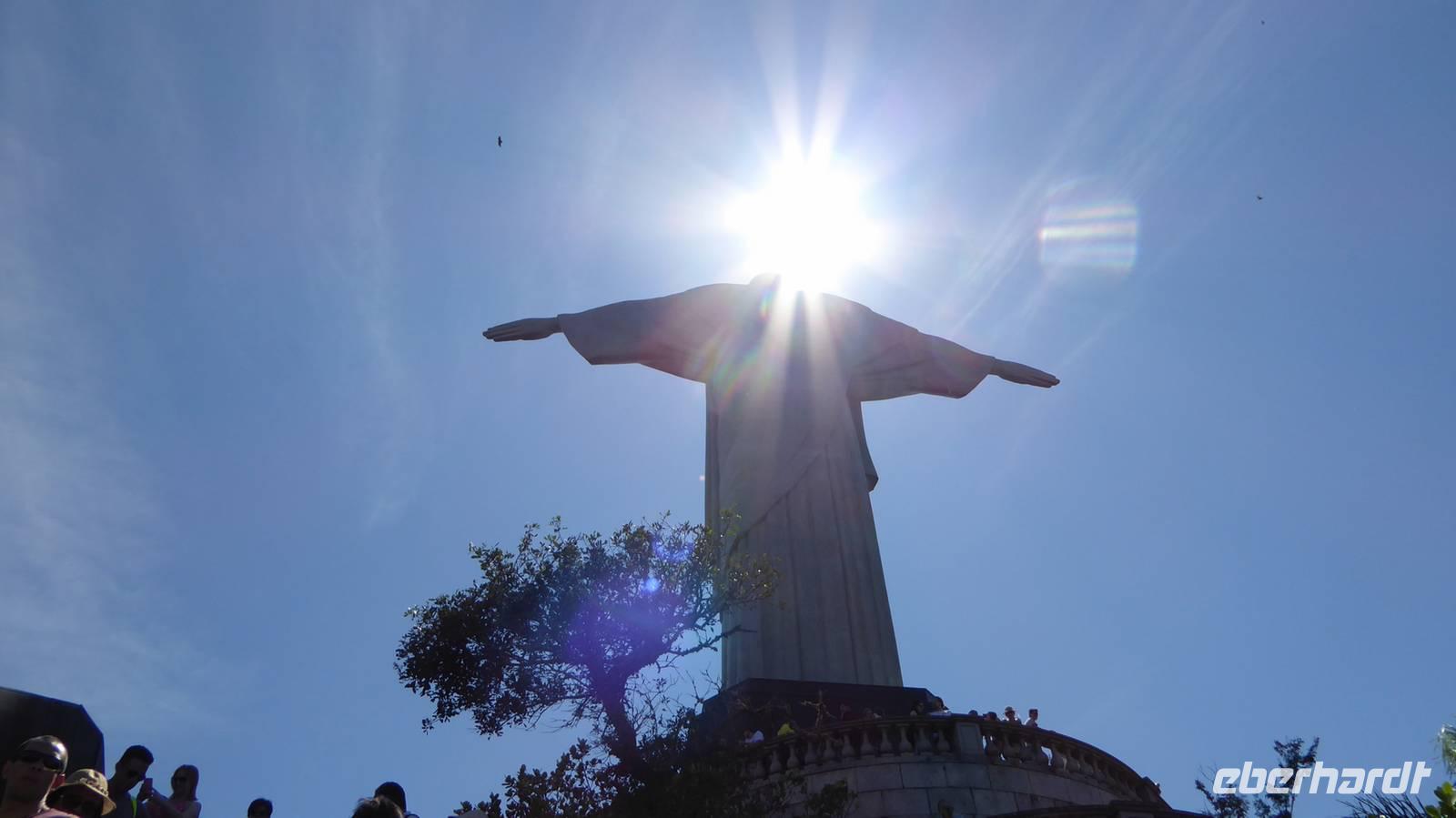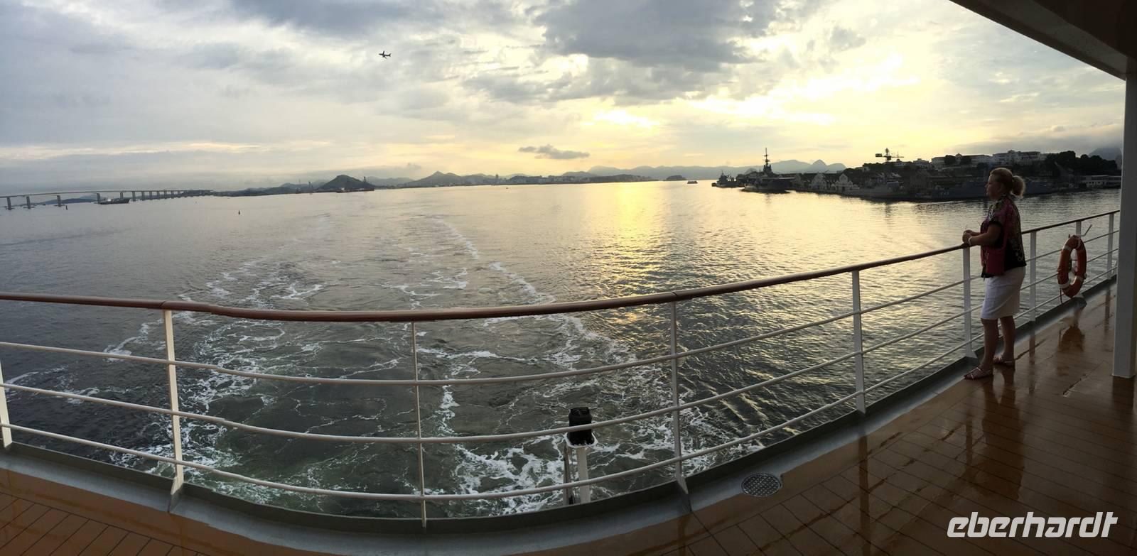 Nach ca. 12 Stunden teilweise recht turbulenten Fluges über die Kanarischen Inseln und den Südatlantik landeten wir pünktlich um 05.00 Uhr Ortszeit in Sao Paulo. Dort erwarteten uns heiße Temperaturen um die 30°C und hoher Luftfeuchtigkeit. Nachdem alle Koffer angekommen und wieder eingecheckt waren, konnte es auf den kurzen Weiterflug von Sao Paulo nach Rio de Janeiro gehen. 8.15 Uhr, nach fast 14 Stunden Flug waren wir nun froh in der Traumstadt Rio gelandet zu sein. Unser, wie sich schnell herausstellte, äußerst lustiger, lebensfroher und singender Reiseleiter Carlos erwartete uns am Flughafen zum Eberhardt-Vorprogramm. Wir hatten mit ihm einen ganzen Tag Spaß, Informationen und Unterhaltung. Der selbst fußballbegeisterte Carlos stimmte uns zunächst auf das fußballverrückte Brasilien ein. Die Deutschen genießen in Brasilien hohes Ansehen als Fußballweltmeiser 2014, insbesondere weil sie den Erzrivalen Argentinien bezwungen haben. Wir freuten uns alle auf eine der tollsten Städte diese Welt - Rio de Janeiro. Während unser Stadtrundfahrt in Rio de Janeiro sahen wird das Fußballstadion „Maracana" und erfuhren viel über die Geschichte des Fußballs. Weiter ging es zum Sambodromo, der Karnevalort in Rio, wo die Sambaschulen am Karneval durch die Stadt tanzen. Krönender Abschluss war der Ausflug zum Corcovado, den wir aufgrund des traumhaften Wetters ohne Wolken und mit einmaliger Sicht über Rio erleben durften. So erleben nur wenige die Aussicht auf Rio mit seinem Zuckerhut und die traumhafte Lage dieser Stadt zwischen Bergen, Hügeln , Meer und Inseln. Deshalb haben wir die Gunst der Stunde genutzt und ihn gleich am ersten Tag besucht. Mit der Zahnradbahn ging es auf den höchsten Berg Rios, dem Corcovado. Wir besichtigten die 38 m hohe Christusstatue und genossen den einzigartigen Blick auf Rio von oben. Es ist unvergleichlich schön. Anschließend gab es einen kleinen Nachmittagsimbiss an der Copacabana, einen der größten und schönsten Traumstrände der Welt. Rio hat uns begeistert. So gegen 13.30 Uhr brachte uns Carlos pünktlich zum Hafen, wo uns die MSC Lirica bereits zur Einschiffung erwartete. Der Abschied von Carlos fiel uns allen schwer, auch weil wir ihn bereits nach nur einem halben Tag ins Herz geschlossen hatten. Nachdem wir die Koffer mit den MSC-Kofferanhängern bestückt und alle Unterlagen ausgefüllt hatten, bekamen wir von MSC eine separate Einschiffung für unsere acht Gäste.