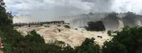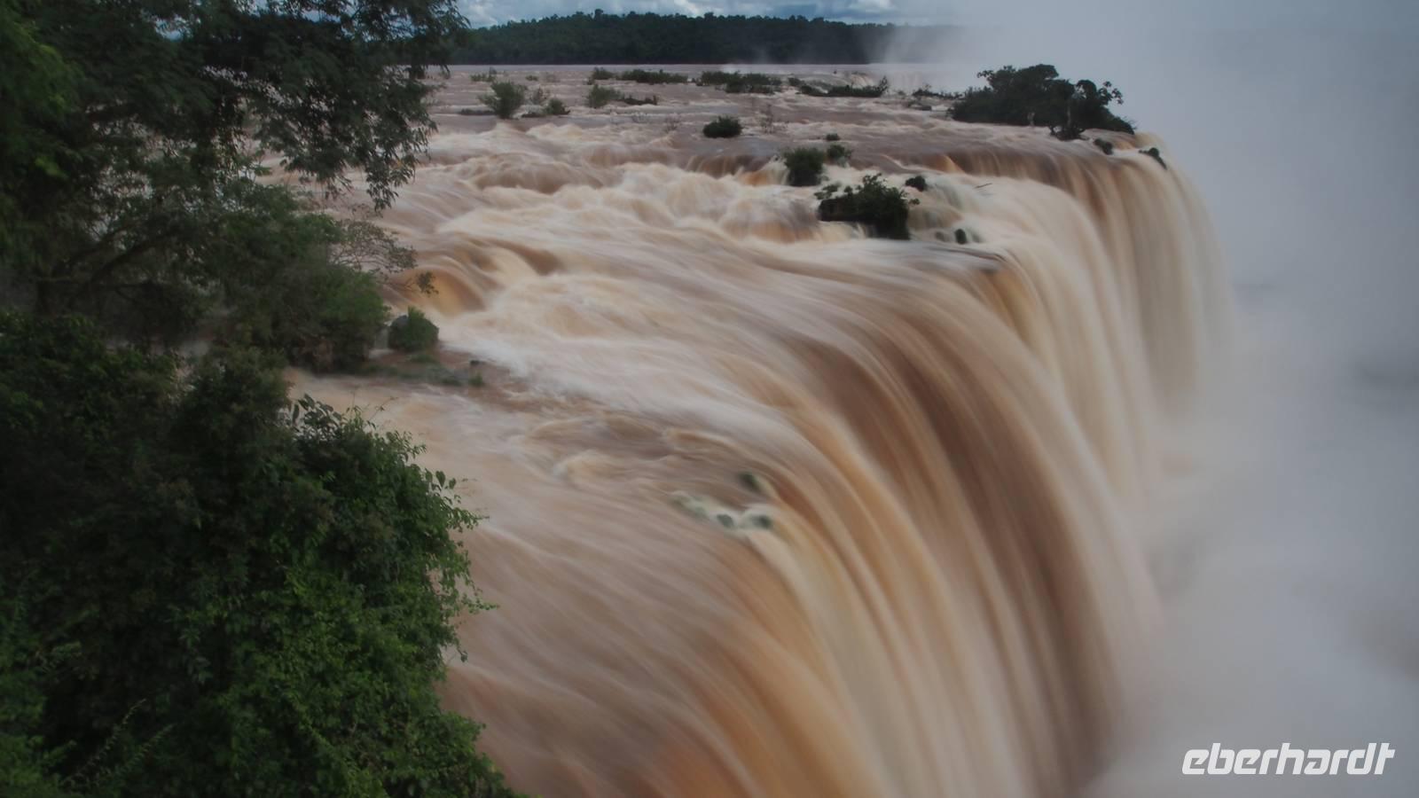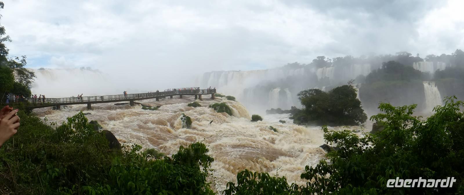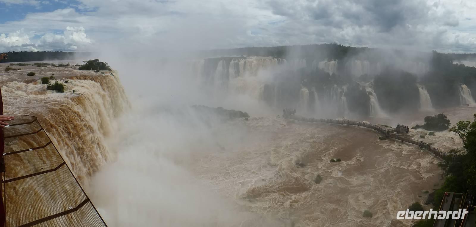 Mit Egon starten wir gegen 14.30 Uhr zu einem Halbtagesausflug an die Wasserfälle von Iguazu auf der brasilianischen Seite. Diese Region der Wasserfälle ist riesengroß und total beeindruckend. Wir befinden uns im Dreiländereck Brasilien, Argentinien und Paraguay. Hauptanziehungspunkt sind die berühmten, seit 1986 zum Weltnaturerbe zählenden Wasserfälle von Iguazu im gleichnamigen Nationalpark. Es hat in der letzten Zeit unwahrscheinlich stark geregnet. Daher führen die Wasserfälle dreimal so viel Wasser wie zu normalen Zeiten. Der Rio Iguazu ist hier vier Kilometer breit. Es überwinden bis zu 6500 Quadratmeter Wasser pro Sekunde das Gefälle und bilden bis zu 272 Kaskaden - das wohl spektakulärste Naturschauspiel Brasiliens. Wir sind auf Grund der Größe völlig beeindruckt. Da die meisten Fälle in Argentinien liegen, ist der größere Panoramablick von der brasilianischen Seite aus möglich. Gemeinsam unternahmen wir eine tolle Wanderung entlang der Kaskaden und wurden auch völlig nass. Das war uns der Spaß wert.