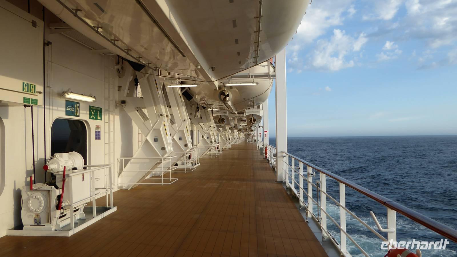 Heute erleben wir einen kompletten Tag auf dem Meer und genießen das schöne Badewetter und die Vorzüge des Schiffes. Es ist Sonnenbaden und Faulenzen angesagt. Bei Temperaturen um 28°C gab es zum Glück auch etwas Seewind.