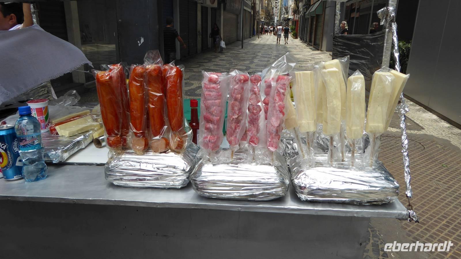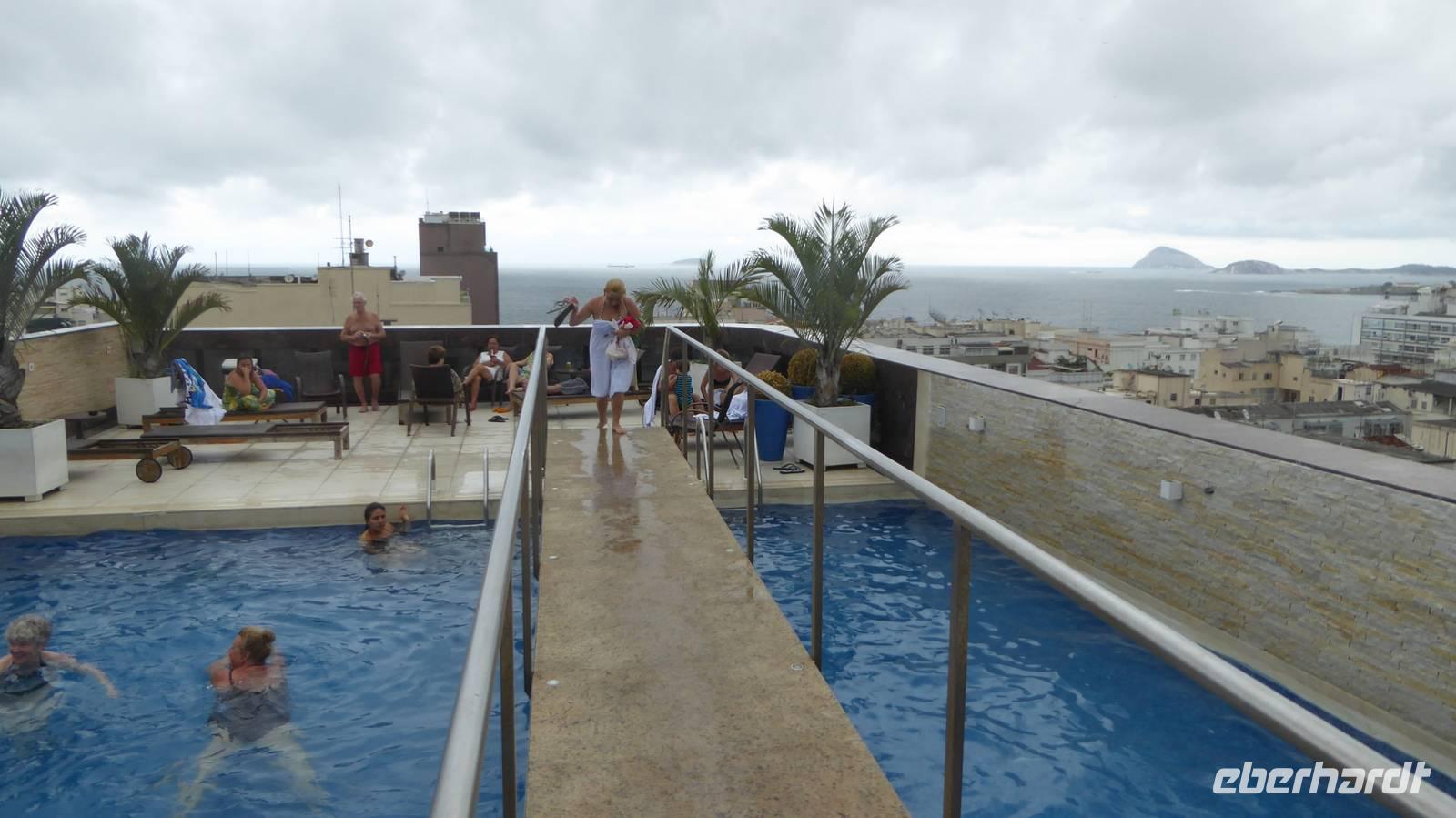 Das Mittagessen haben wir typisch brasilianisch auf der Straße mit Spießen und Spießchen eingenommen. Carlos und unser Fahrer waren beeindruckt von der Unkompliziertheit unser Gruppe und genossen diesen Punkt gemeinsam mit uns. Sidney, unser Fahrer sagte: seit zwölf Jahren gab es bei ihm keine Gruppe, die ein typisch brasilianisches „SPIESSCHEN" am Bürgersteig gegessen habe. Bei diesen heißen Temperaturen über 30°C gab es noch ein kühlendes Bad auf der Hotelterrasse hoch oben im 18. Stock mit einem fantastischen Blick über Rio. Der Höhepunkt des Abends folgte mit dem Abendessen im berühmtesten Restaurant der Stadt im Palace Barbecue. Wir genossen Fleisch vom Spieß in vollendeter Form. Alle waren begeistert, den letzten Drink des Abends gab es mit Carlos am abendlichen Strand der Copacabana. Wir übernachteten im Hotel Royal Rio Palace in einer Seitenstraße unweit der Copacabana.