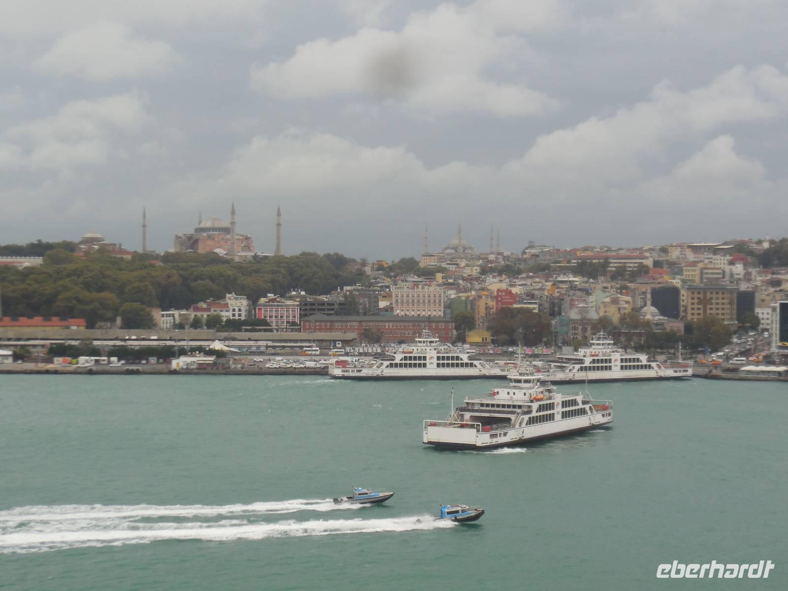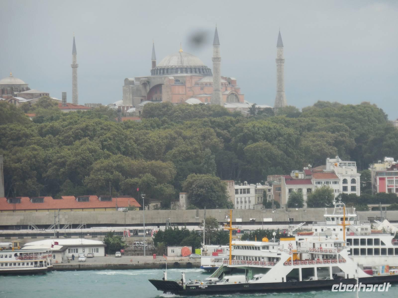 Als wir erwachen trauen wir unseren Augen kaum. Mitten in der beeindruckenden Stadt hat unser Kreuzfahrtschiff den Anker geworfen. Leider ist es heute ein bisschen trüb und regnerisch, aber der außergewöhnliche Charakter der Ansicht von Istanbul ist deutlich sichtbar. Viele Passagiere haben es heute besonders eilig das Schiff für den Landausflug zu verlassen, um die Stadt auf 2 Kontinenten kennen zu lernen. Vorerst schauen uns wieder im Hafen um und werden von einem Taxiunternehmer erspäht. Nachdem für uns die passende Taxigröße gefunden ist geht es los. Unser freundlicher Fahrer Halil bringt uns zu den Prachtbauten Hagia Sophia und der Blauen Moschee mit ihren Minaretten. Hier haben wir Zeit zum Spazieren gehen und genießen den Flair und die Eindrücke in diesem Terrain. Natürlich sind wir alle Genießer und schon bald haben wir ein kleines Cafè entdeckt und trinken unseren türkischen Tee und wer möchte probiert ein Stück des süßen Kuchens. Durch die stark befahrenen Straßen und Nebengassen bringt uns Halil zum „Großen Bazar" neben der „Großen Moschee". Verschiedene Gewürzdüfte, Kaffeearomen, getrocknetes Obst, unzählige oft unbekannte Nussorten begeistern unsere Sinnesorgane. Das rege Treiben der einheimischen Händler zieht uns in seinen Bann. Im nächsten kleinen Obstladen wird für uns frischer Granatapfelsaft gepresst....hm, schmeckt das gesund! Den Abschluss unseres Kurzbesuches findet der Besuch im Ottoman- Viertel von Istanbul.