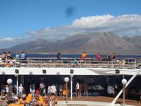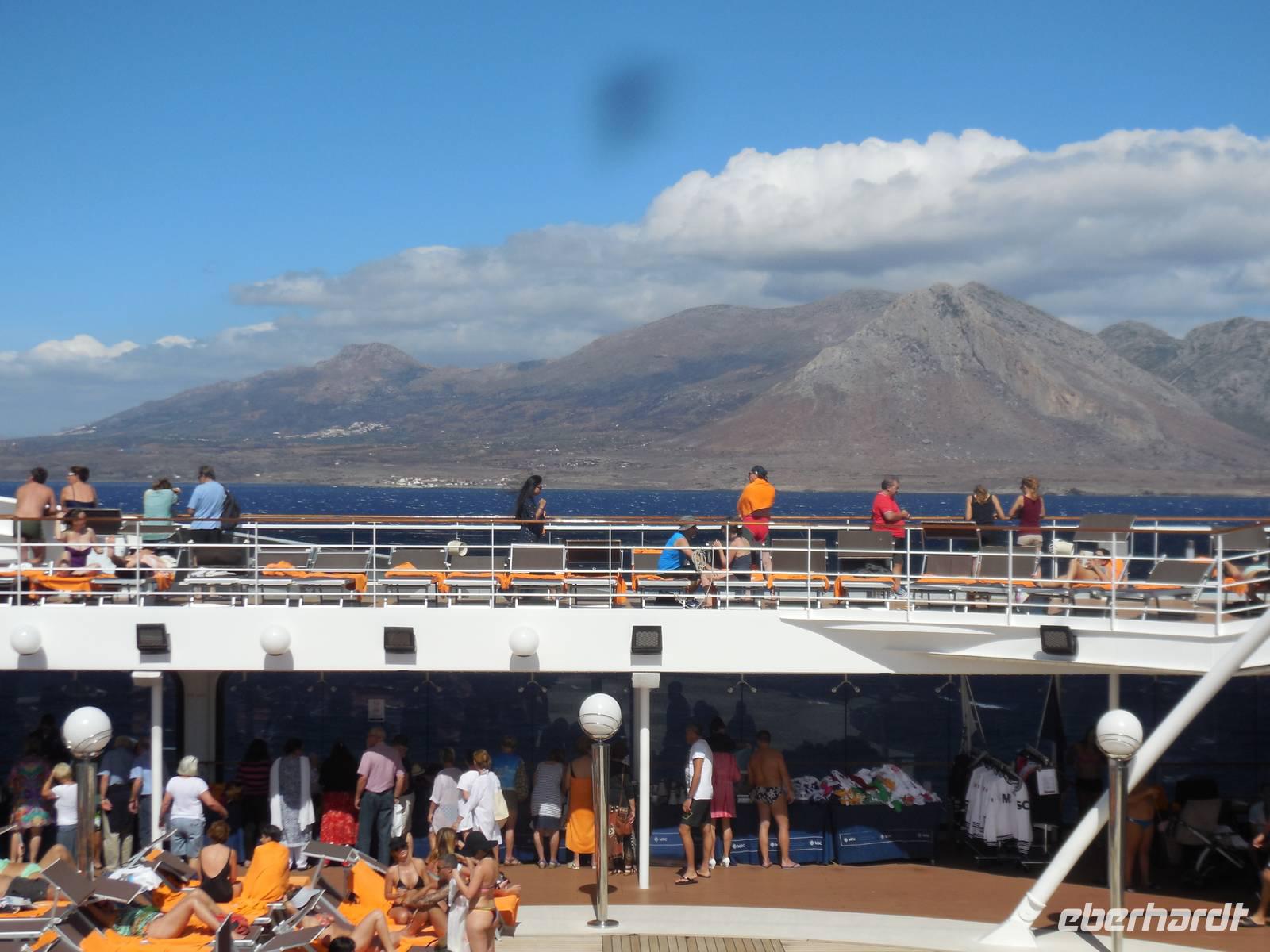 Sonne pur, das Sonnendeck ist gut besucht, das Animationsteam ist fleißig und lehrt komplizierte Schrittkombinationen.