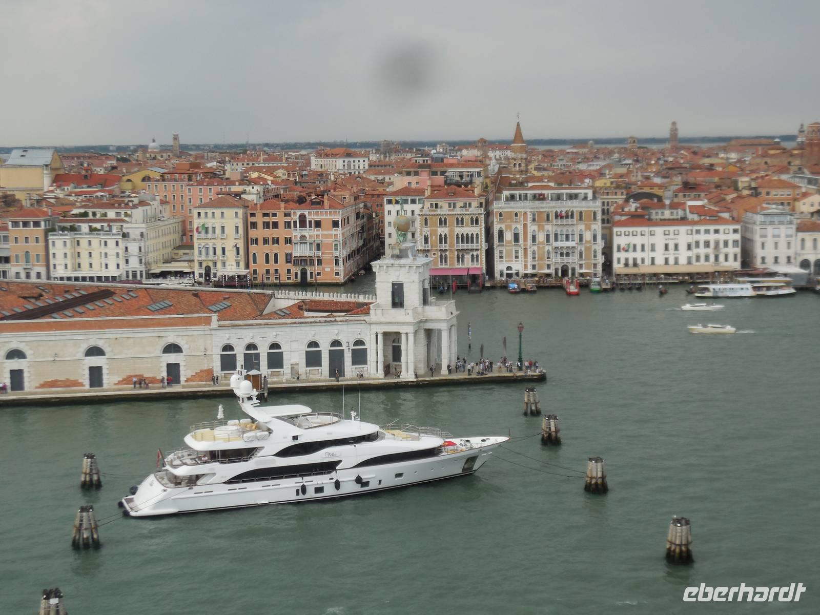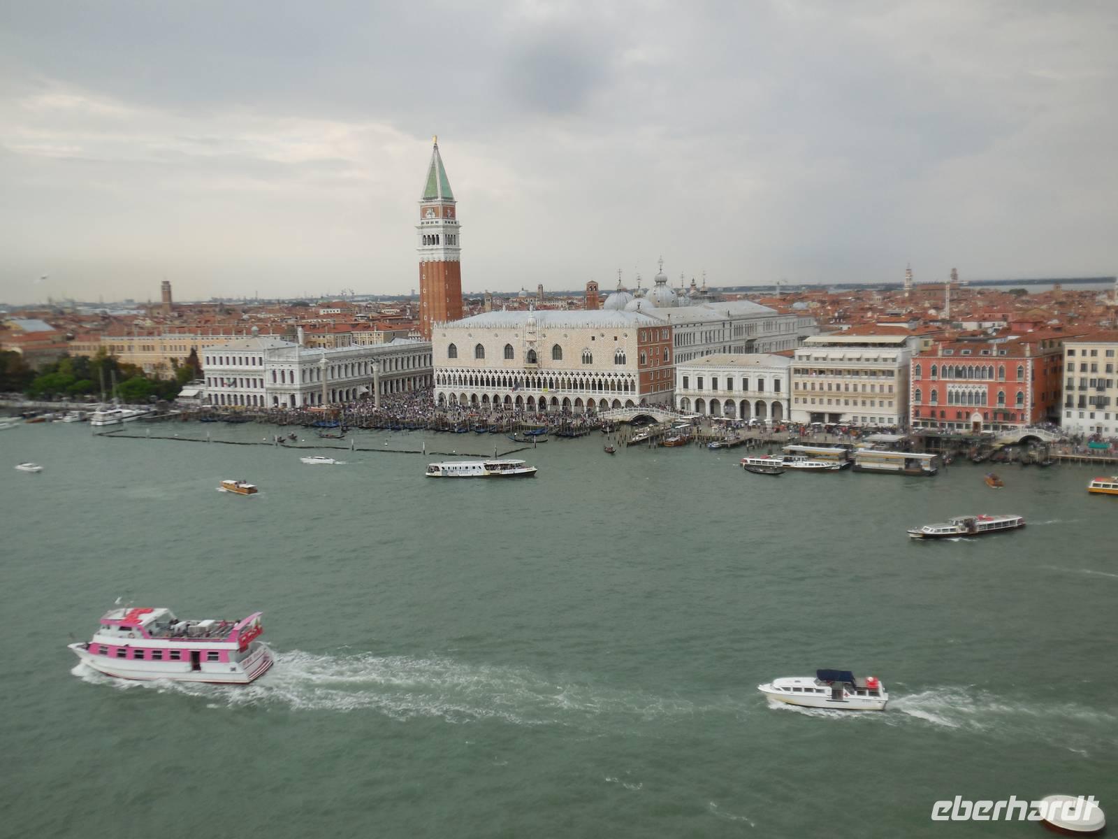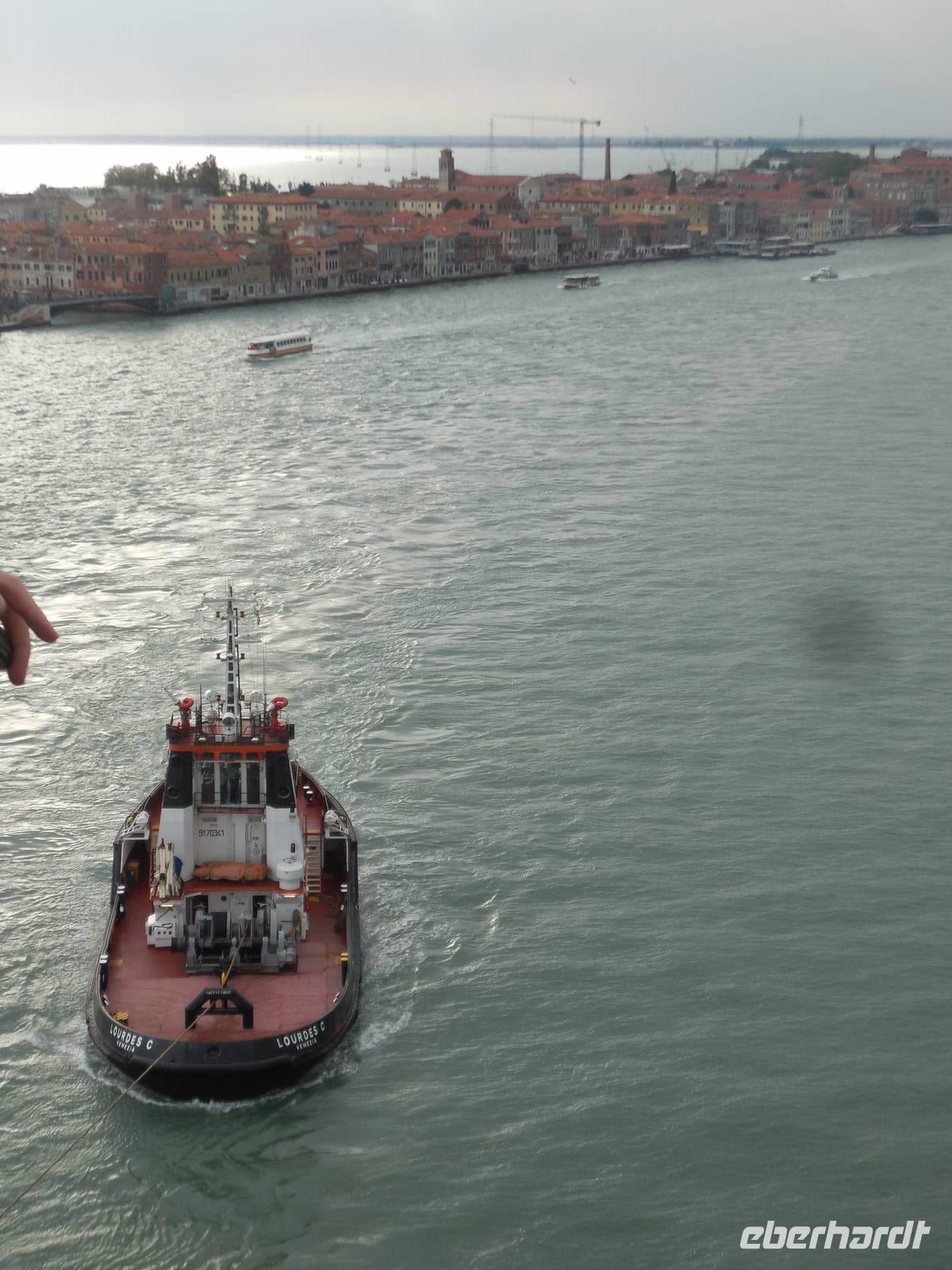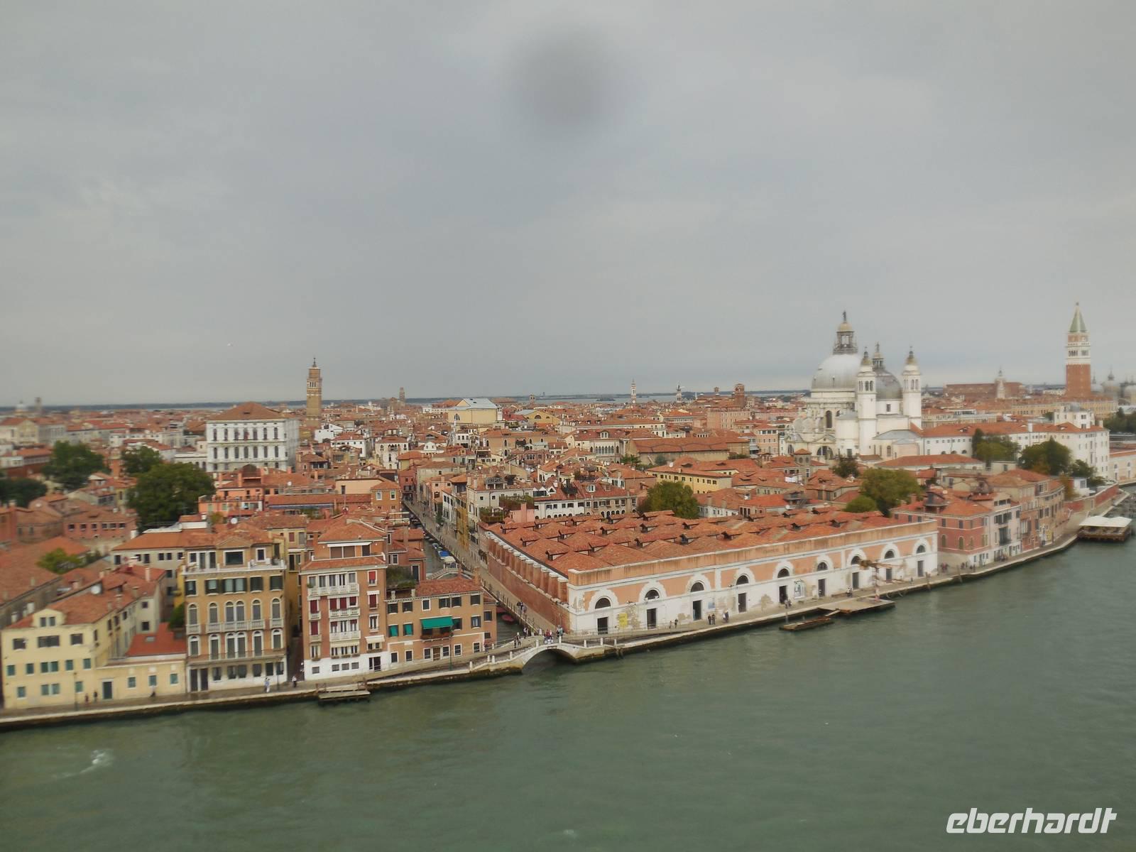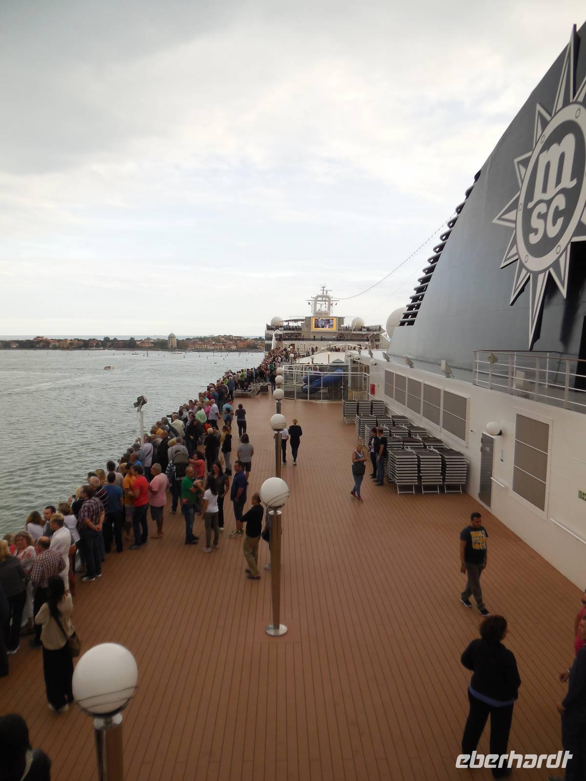 Nach dem reichhaltigen Frühstücksbuffet mit dem aromatischen Kaffee bereiten wir unsere Koffer für die Einschiffung auf die MSC Poesia vor. Alle mitgebrachten Taschenmesser, spitzen Gegenstände, kleines noch ungeöffnetes Naschwerk werden noch schnell in die Koffer verstaut und mit der Banderole versehen, denn es heißt, dass wir diesen erst wieder vor unserer Kabinentür auf dem Schiff in Empfang nehmen. Pünktlich erreichen wir den Hafen in Venedig und das Terminal an dem die MSC Poesia liegt. Hier herrscht schon großer Andrang an international anreisenden Passagieren. Wir bringen unser Gepäck auf das Förderband in die Ankunftshalle, beantworten den Gesundheitsfragebogen, ordnen immer wieder unsere Dokumente und hoffen, diese nicht fallen oder gar zu verlieren. Die Eindrücke über das temperamentvolle Treiben übermannen doch einen jeden von uns. Endlich legt das Schiff ab und wir sind überwältigt von der Hafenausfahrt durch die Lagunenstadt Venedig.