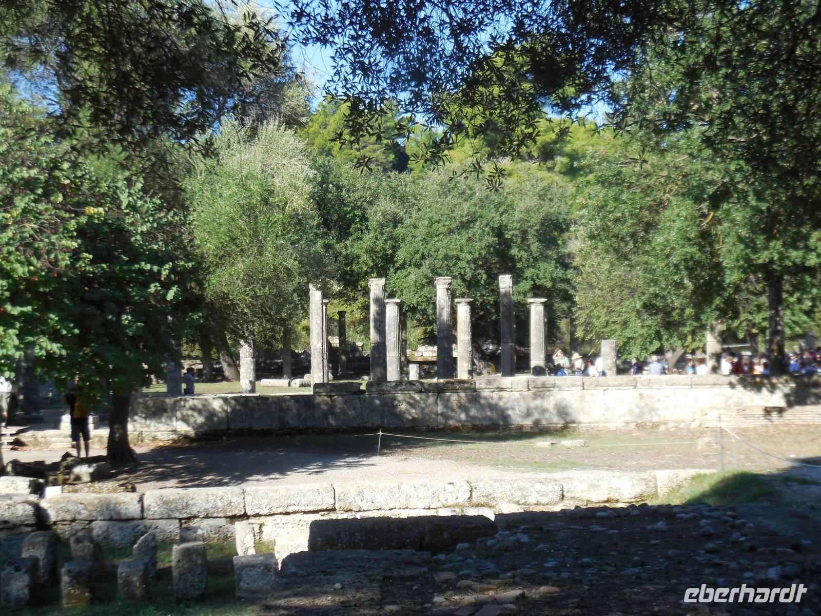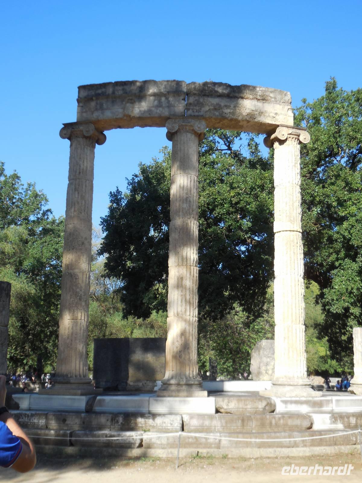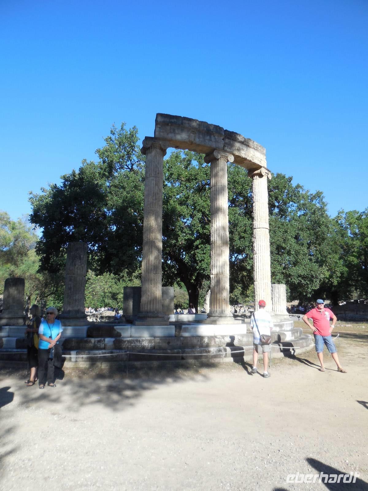 Wir sehen das Philippeion, ein 338 v. Chr. von Philipp II in das Heiligtum von Olympia gestifteter Rundbau, der von seinem Sohn Alexander dem Großen vollendet wurde. Es stand im Nordwesten der Altis von Olympia und diente der Aufstellung einer Statuengruppe aus der Hand des Bildhauers Leochares, die Philipp und seine Familie darstellte.