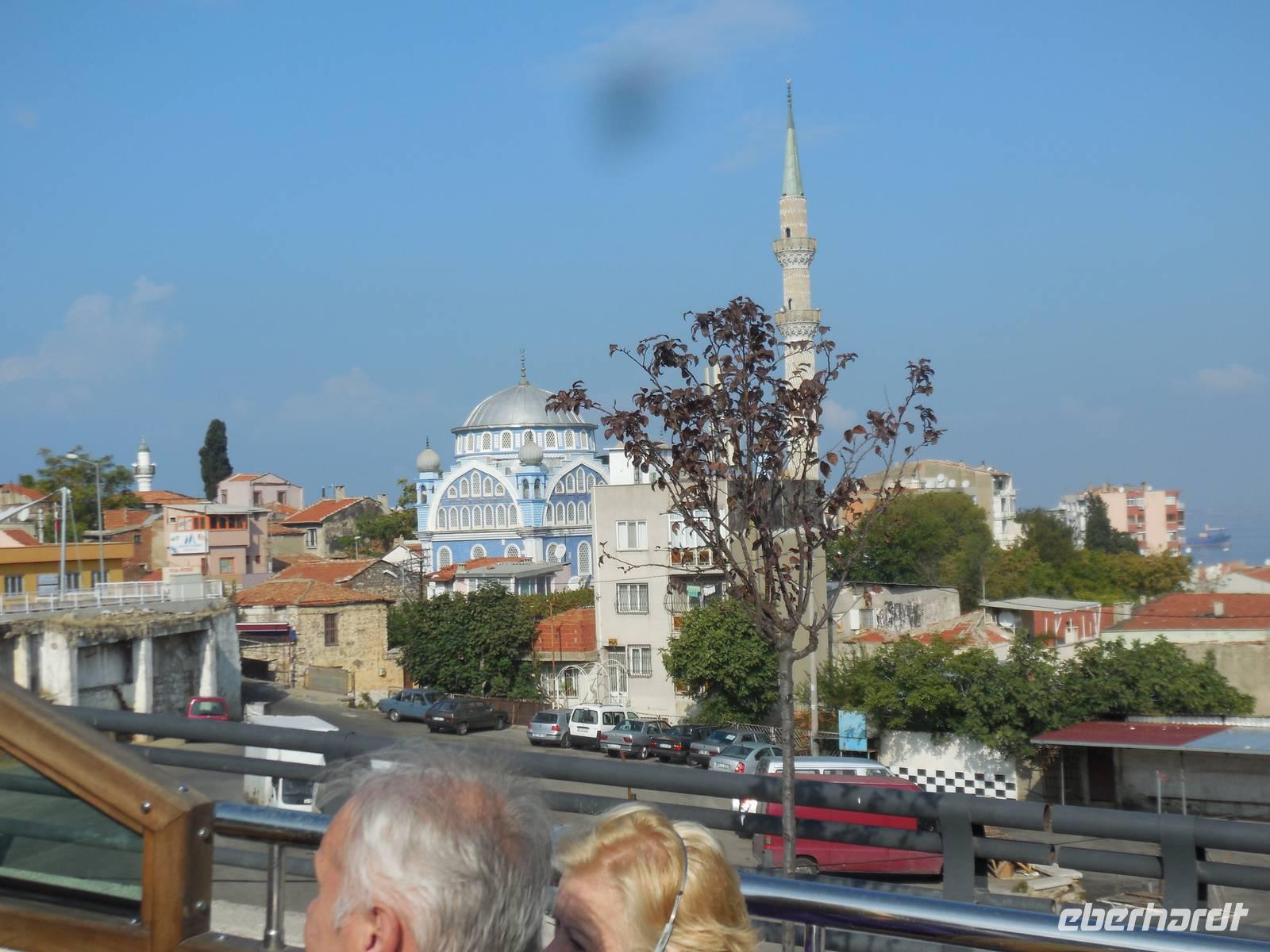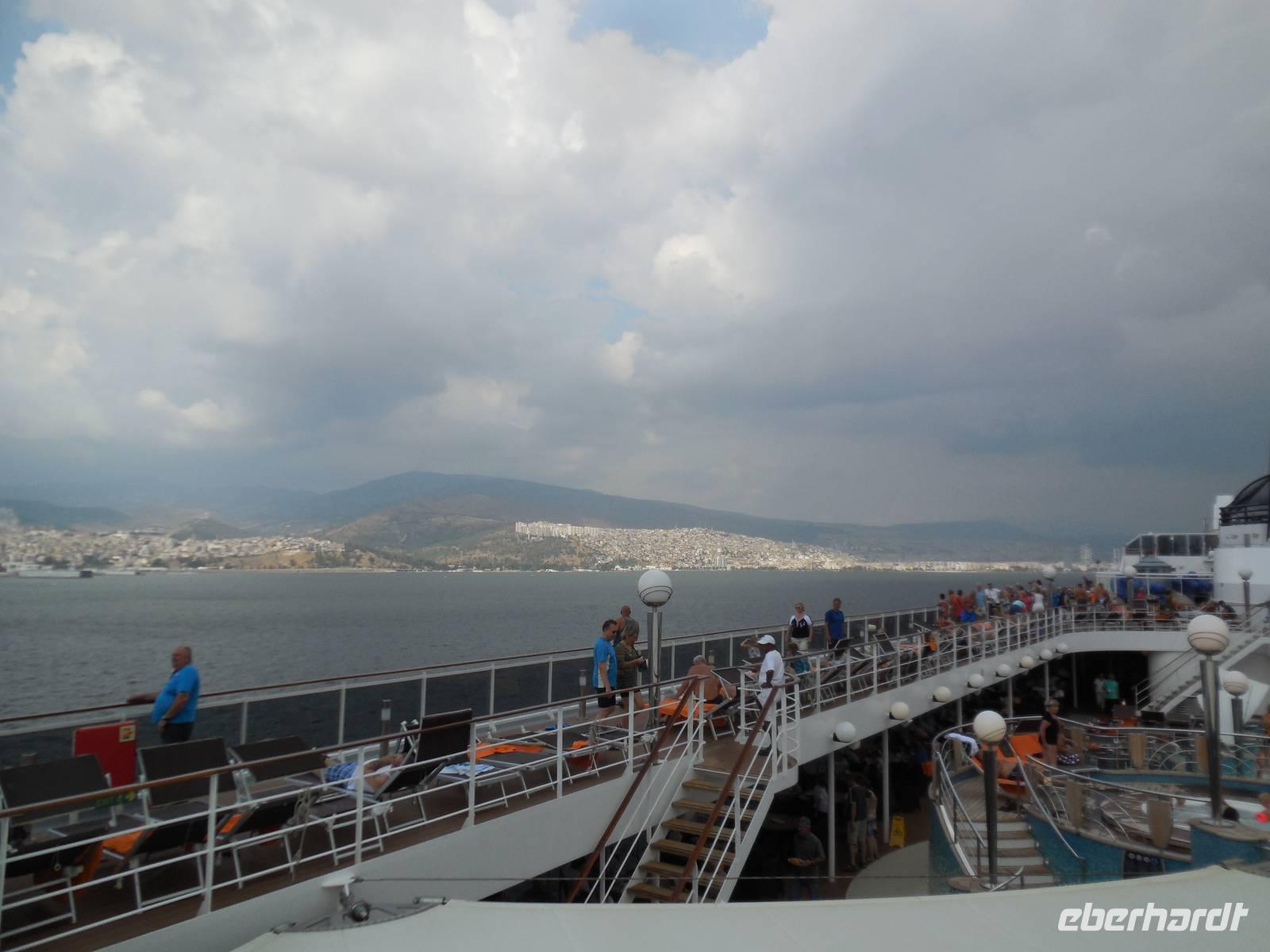 Nach einer langen Galanacht mit Live - Musik und Tanzeinlagen in der Zebra-Bar sind wir wieder früh unterwegs und möchten heute Izmir - die Perle der Ägäis kennenlernen. Wir erspähen die Cabrio- Busse, nehmen Platz und genießen bei angenehmen Temperaturen den Sonnenschein und den Charme Izmirs. Unsere Stadtrundfahrt führt uns durch die hügelig angelegte Stadt und erlaubt uns tolle Ausblicke über die Bucht der Ägäisküste. Die Ausmaße der drittgrößten Stadt der Türkei sind grenzenlos. Wir verlassen den Bus in der Nähe des Bazar von Kemeralt. Hier erfüllen sich orientalische Einkaufsträume. Ein riesiges Sortiment an Ballkleidern mit filigran bestickten Ornamenten, fernöstliche Kunstgegenstände, türkische Köstlichkeiten und eine unüberschaubare Menge an Lederartikeln sind hier zu finden. Wir gönnen uns eine türkische Teepause und besuchen im Anschluss das Innere der Hisar- Moschee. Die größte Moschee Izmirs wurde im Jahre 1598 eröffnet und ist ein bedeutendes Bauwerk osmanischer Architektur. Mit diesen Eindrücken fahren wir zurück an Bord des Schiffes. In den späteren Nachmittagsstunden macht es sich ein klein wenig bemerkbar, dass wir auf einem Schiff wohnen. Wind zieht auf, die Wellen schlagen an den Bug und die Sturmfrisuren werden wilder...doch unser Kapitän schifft uns sicher durch die Dardanellen bis nach Istanbul.