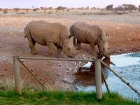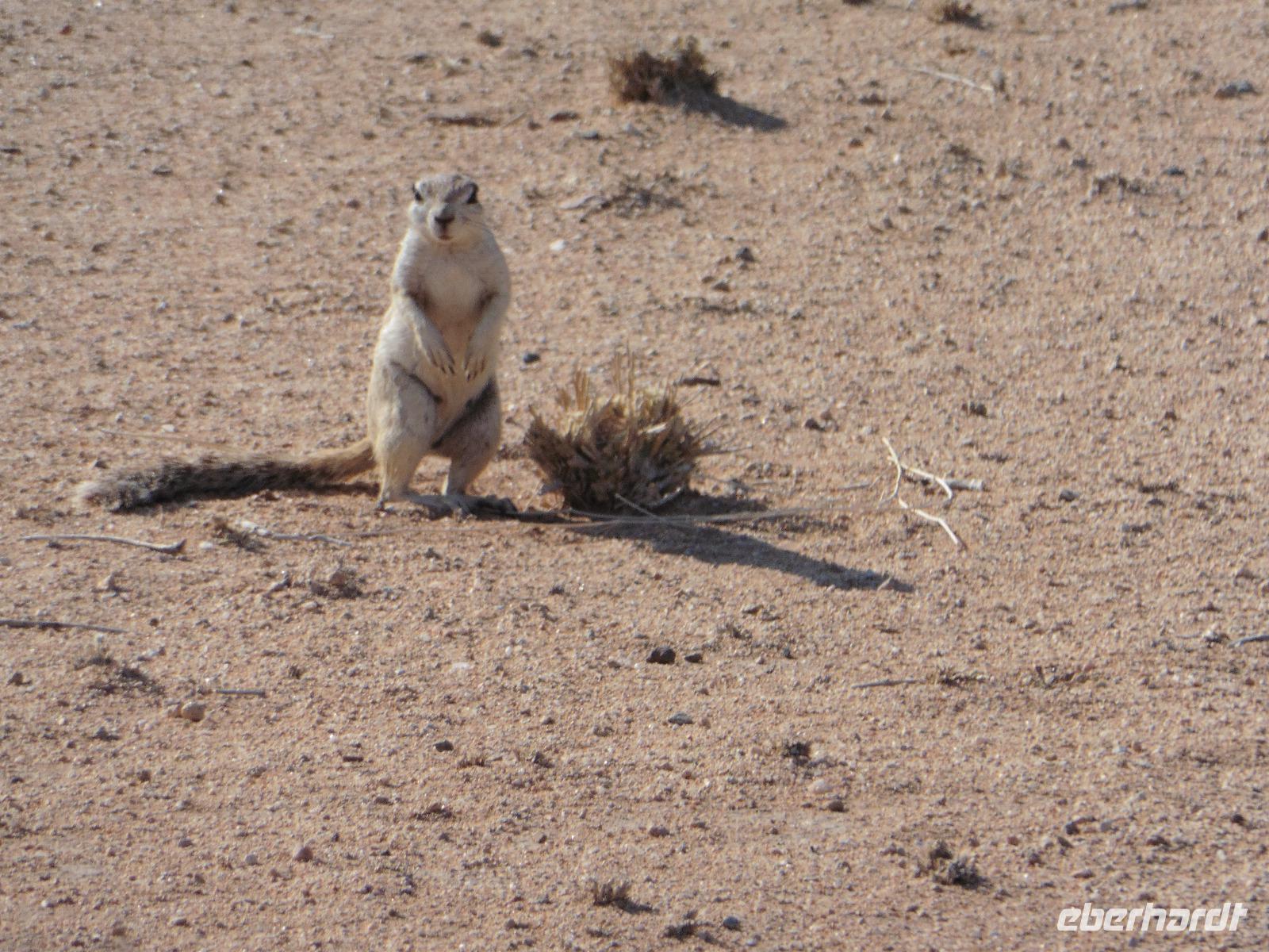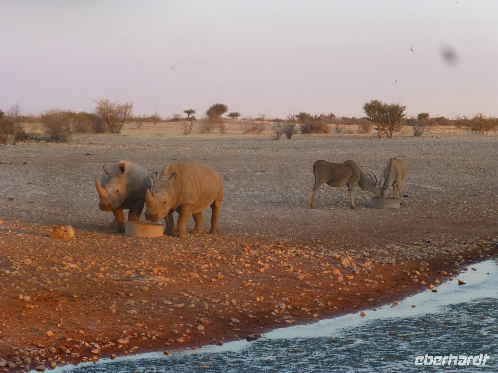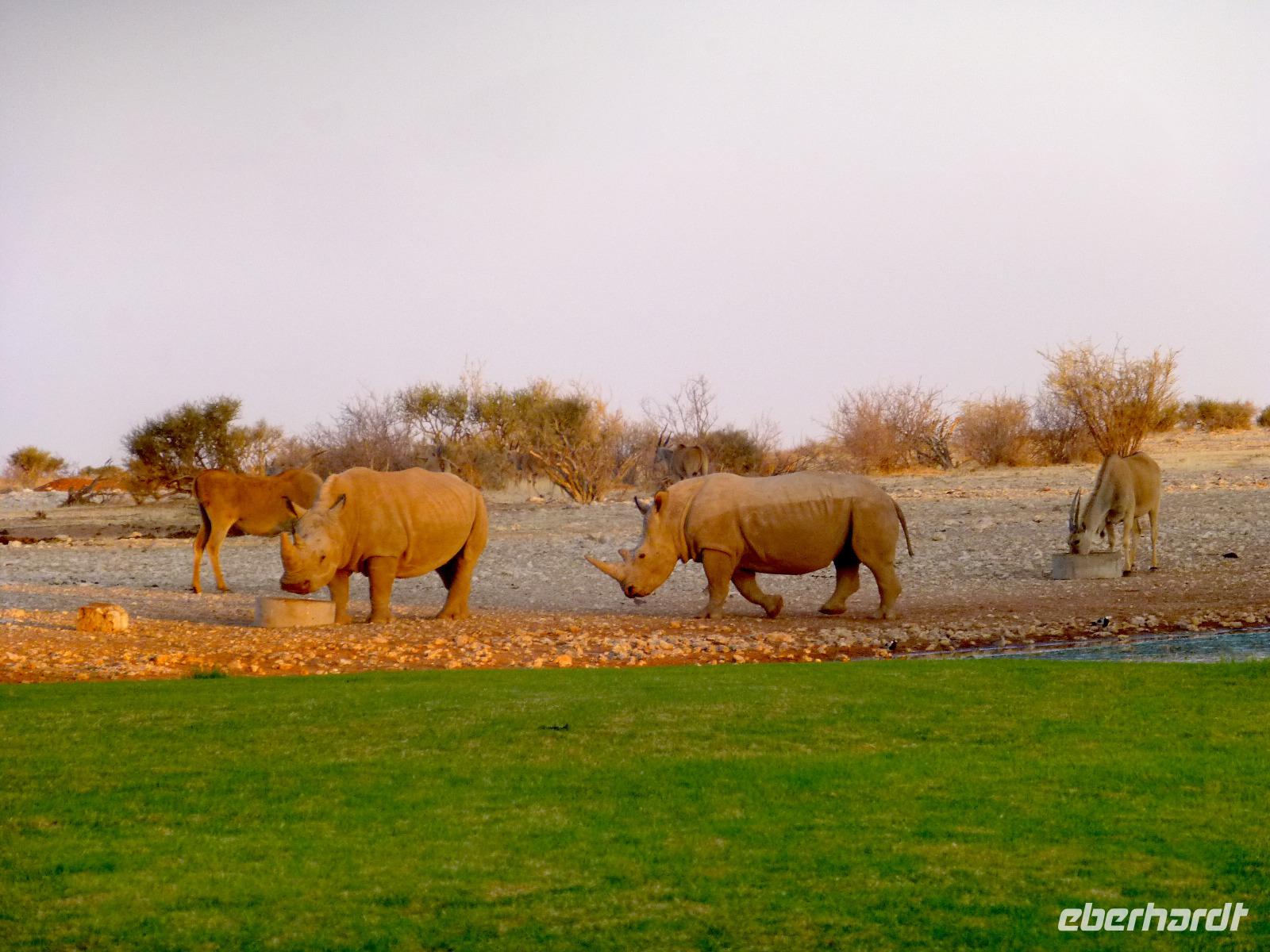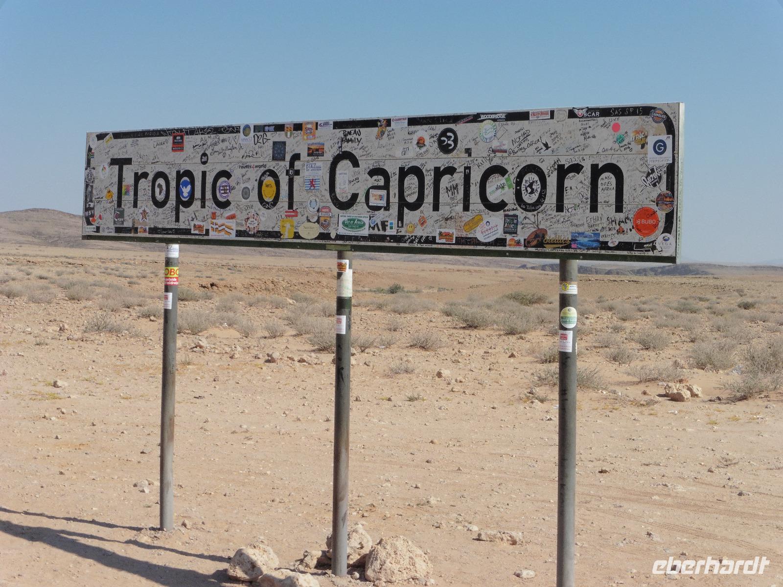 Nach einem Zwischenstopp in Südafrika, landeten wir bei strahlendem Sonnenschein in der Hauptstadt Namibias. Für afrikanische Verhältnisse relativ zügig, brachten wir die Einreiseformalitäten hinter uns. Am Kofferband der Schreck, 10 Koffer von Passagieren fehlten. Bei uns hatte es Andrea erwischt. Nachdem alles gemeldet und notiert war wurden wir von unserem namibischen Reiseleiter Ernst und unserem Truck-Driver Filipo begrüßt. Schnell noch Geld tauschen und schon nahmen wir die ersten 300 km unserer Entdeckungsreise in Angriff. Zunächst auf Asphalt, später auf Schotterpiste fuhren wir Richtung Mariental. In der "Basterstadt" Rehoboth legten wir eine kurze Pause ein. Als Baster wurden damals die unehelichen Kinder zwischen den Holländern und den Khoisan bezeichnet. Am 23. Breitengrad überquerten wir das 1. Mal, auf unserer Reise den südlichen Wendekreis des Steinbocks. Am späten Nachmittag erreichten wir unsere erste Unterkunft, die wunderschöne Lapa Lange Lodge bei Mariental. Ein erster Spaziergang durch die Lodge, das erste namibische Bier, die ersten afrikanischen Tiere. In der Abenddämmerung konnten wir 2 Nashörner und zahlreiche Antilopenarten am Wasserloch der Lodge beobachten. Nach einem tollen Abendessen gingen wir ins Bett mit dem Wissen, morgen geht es richtig los...unsere erste Nacht unter dem traumhaften Sternenhimmel Namibias.