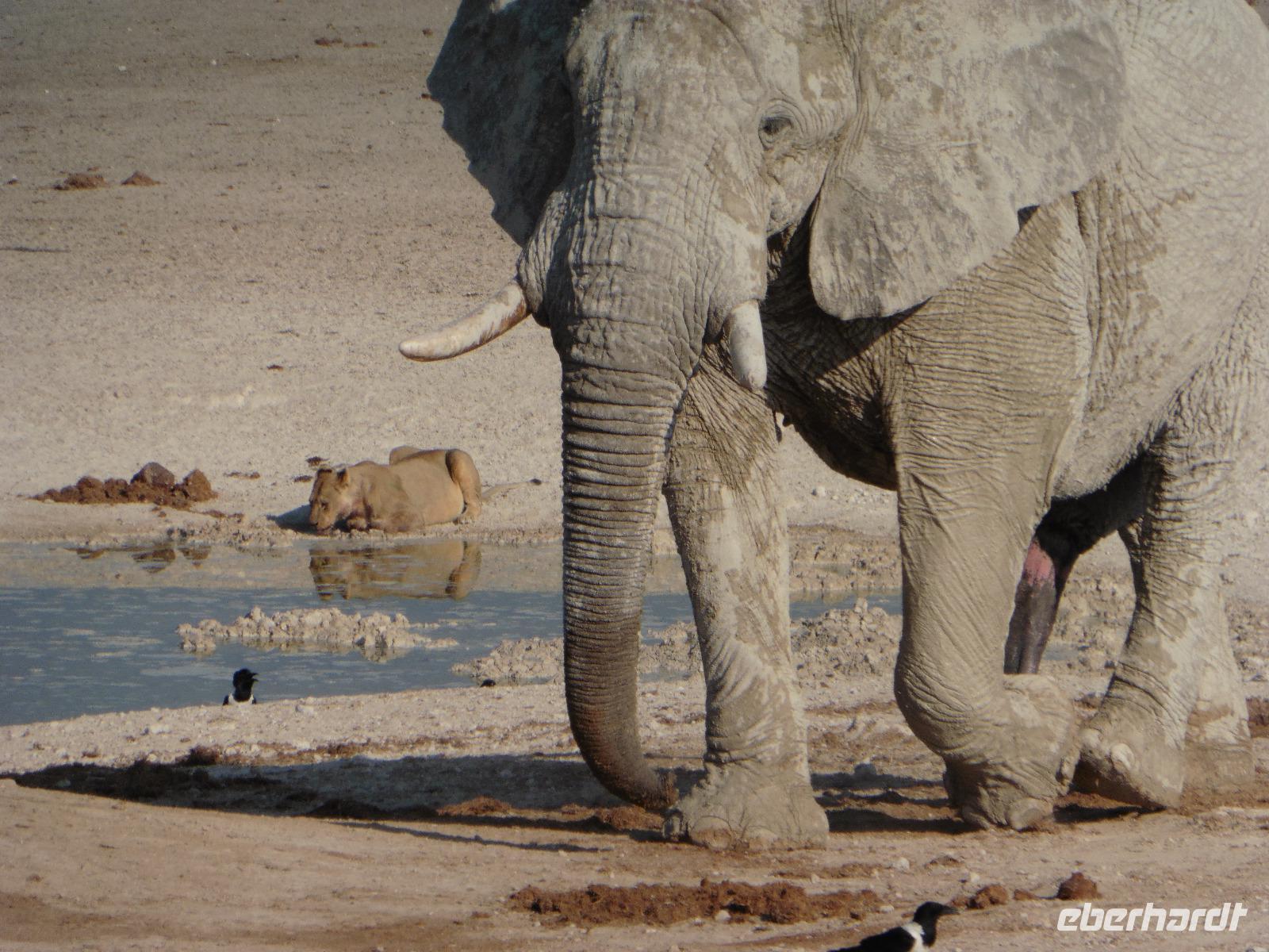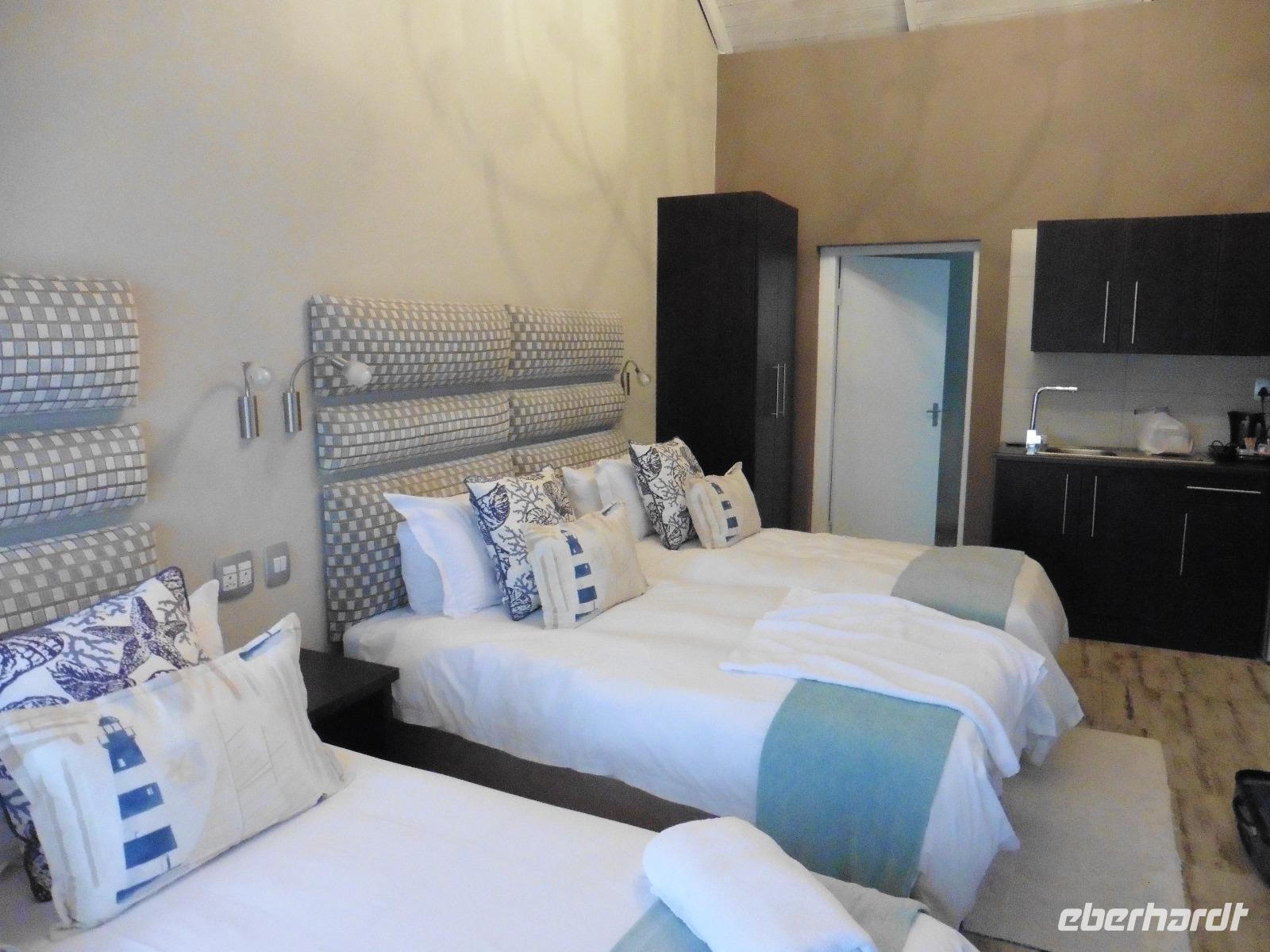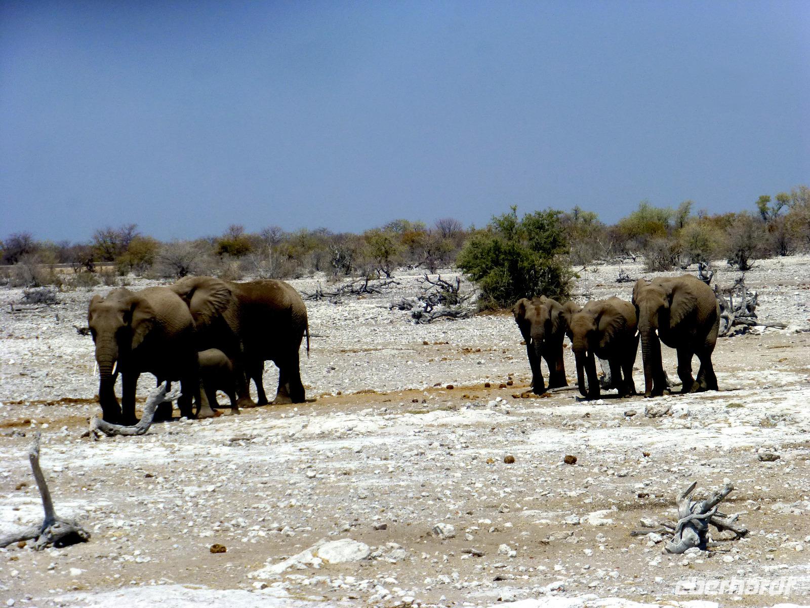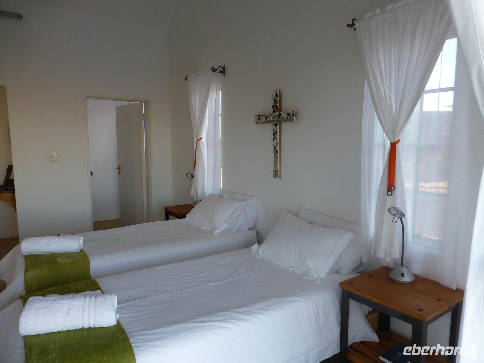 Nach einem Zwischenstopp in Südafrika, landeten wir bei strahlendem Sonnenschein in der Hauptstadt Namibias. Für afrikanische Verhältnisse relativ zügig, brachten wir die Einreiseformalitäten hinter uns. Am Kofferband der Schreck, 10 Koffer von Passagieren fehlten. Bei uns hatte es Andrea erwischt. Nachdem alles gemeldet und notiert war wurden wir von unserem namibischen Reiseleiter Ernst und unserem Truck-Driver Filipo begrüßt. Schnell noch Geld tauschen und schon nahmen wir die ersten 300 km unserer Entdeckungsreise in Angriff. Zunächst auf Asphalt, später auf Schotterpiste fuhren wir Richtung Mariental. In der "Basterstadt" Rehoboth legten wir eine kurze Pause ein. Als Baster wurden damals die unehelichen Kinder zwischen den Holländern und den Khoisan bezeichnet. Am 23. Breitengrad überquerten wir das 1. Mal, auf unserer Reise den südlichen Wendekreis des Steinbocks. Am späten Nachmittag erreichten wir unsere erste Unterkunft, die wunderschöne Lapa Lange Lodge bei Mariental. Ein erster Spaziergang durch die Lodge, das erste namibische Bier, die ersten afrikanischen Tiere. In der Abenddämmerung konnten wir 2 Nashörner und zahlreiche Antilopenarten am Wasserloch der Lodge beobachten. Nach einem tollen Abendessen gingen wir ins Bett mit dem Wissen, morgen geht es richtig los...unsere erste Nacht unter dem traumhaften Sternenhimmel Namibias.