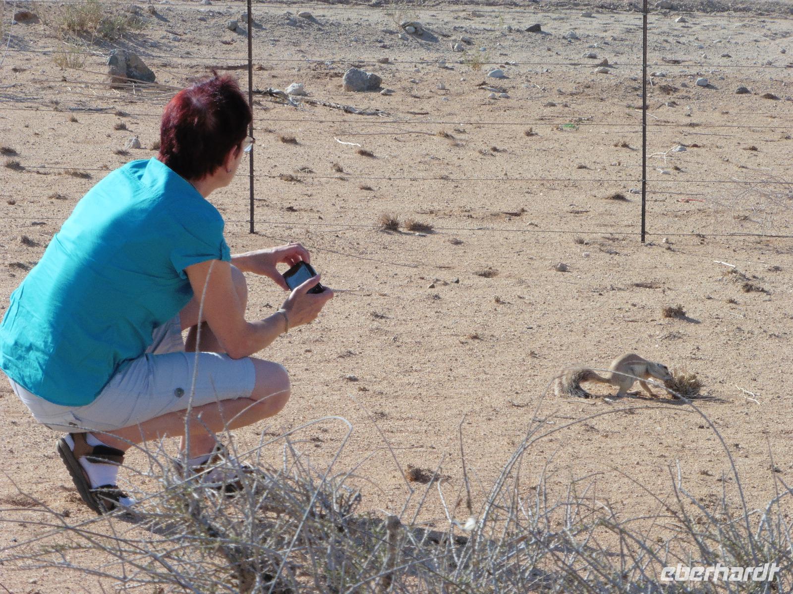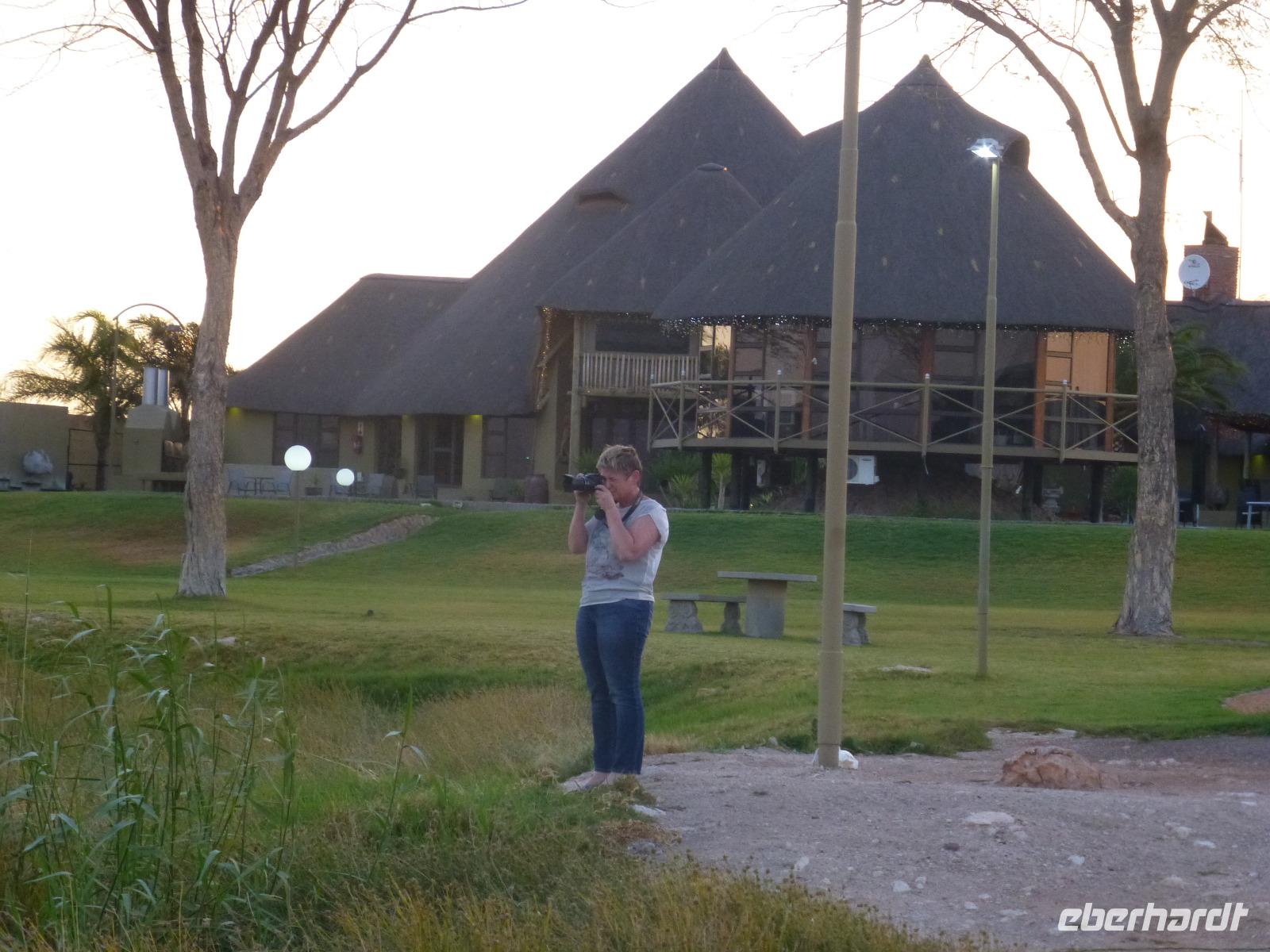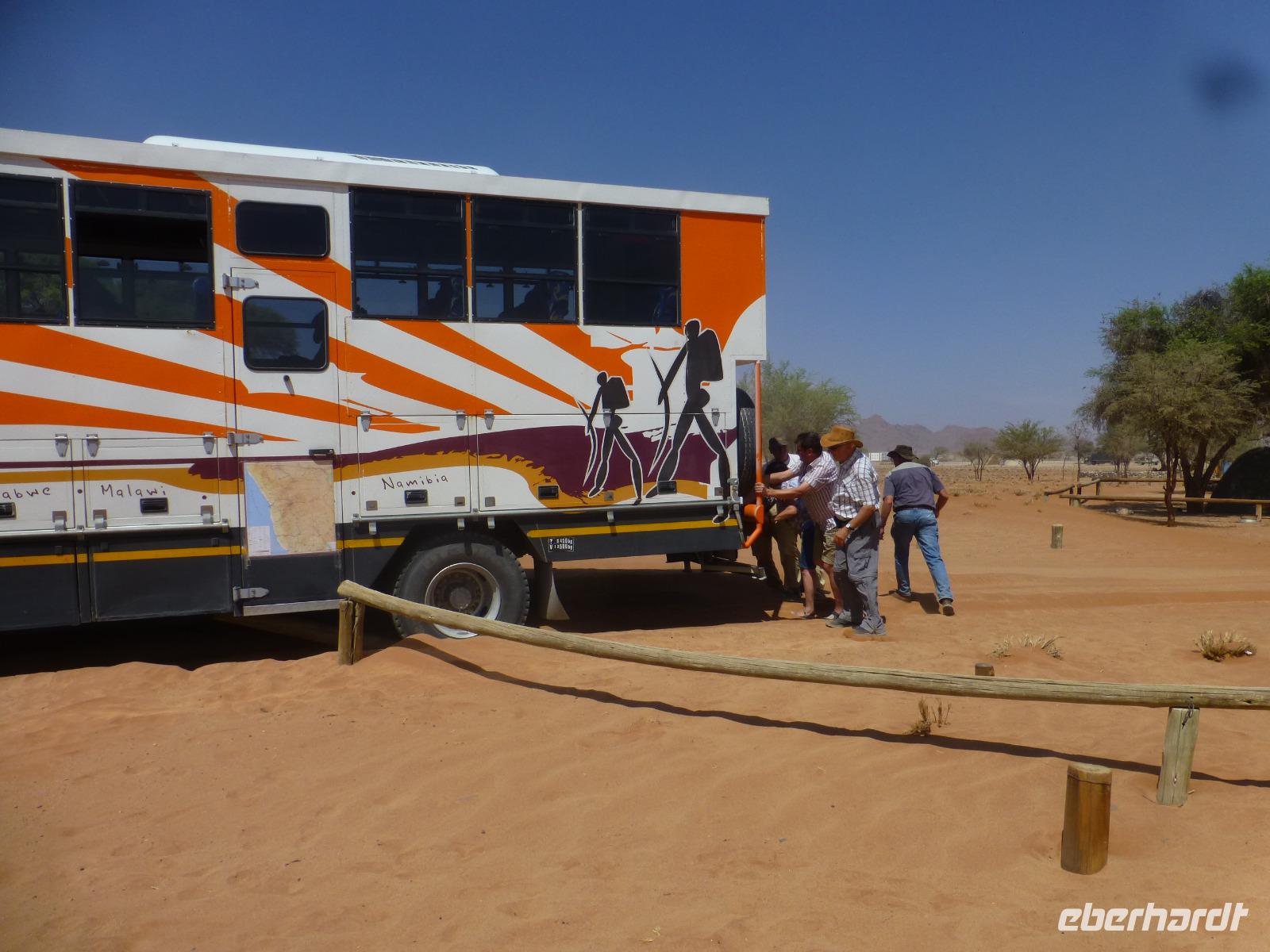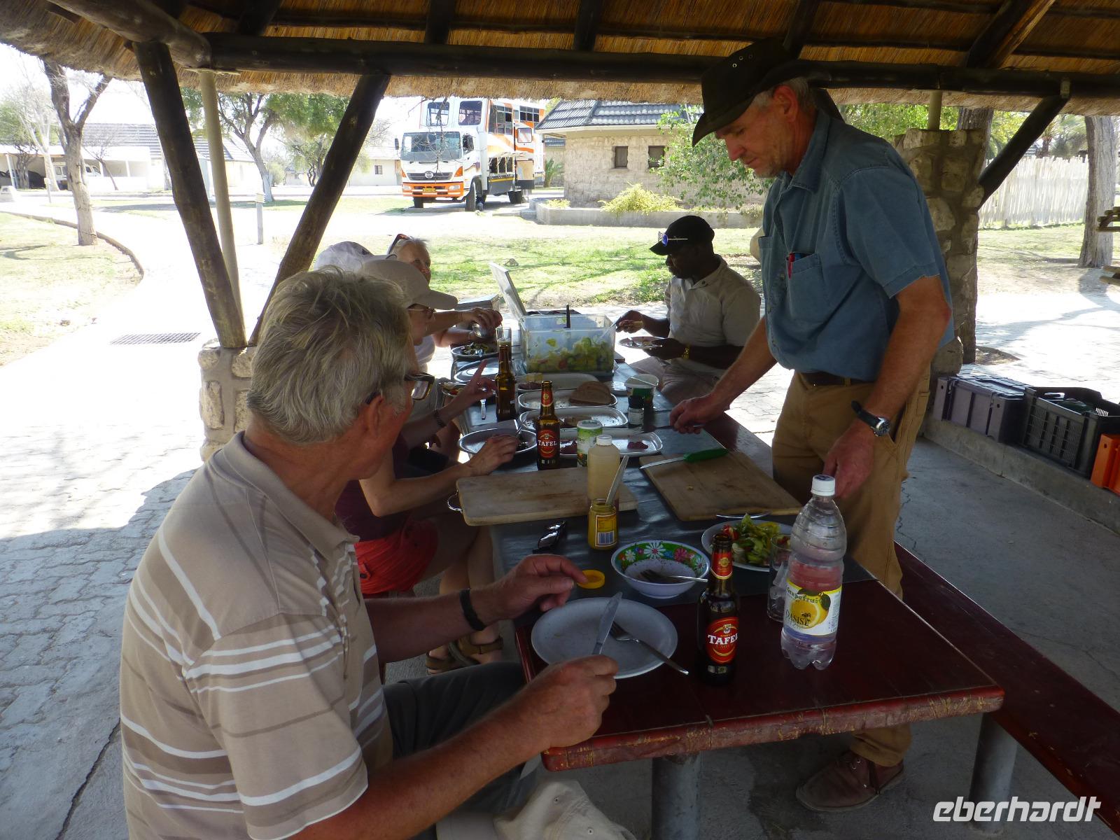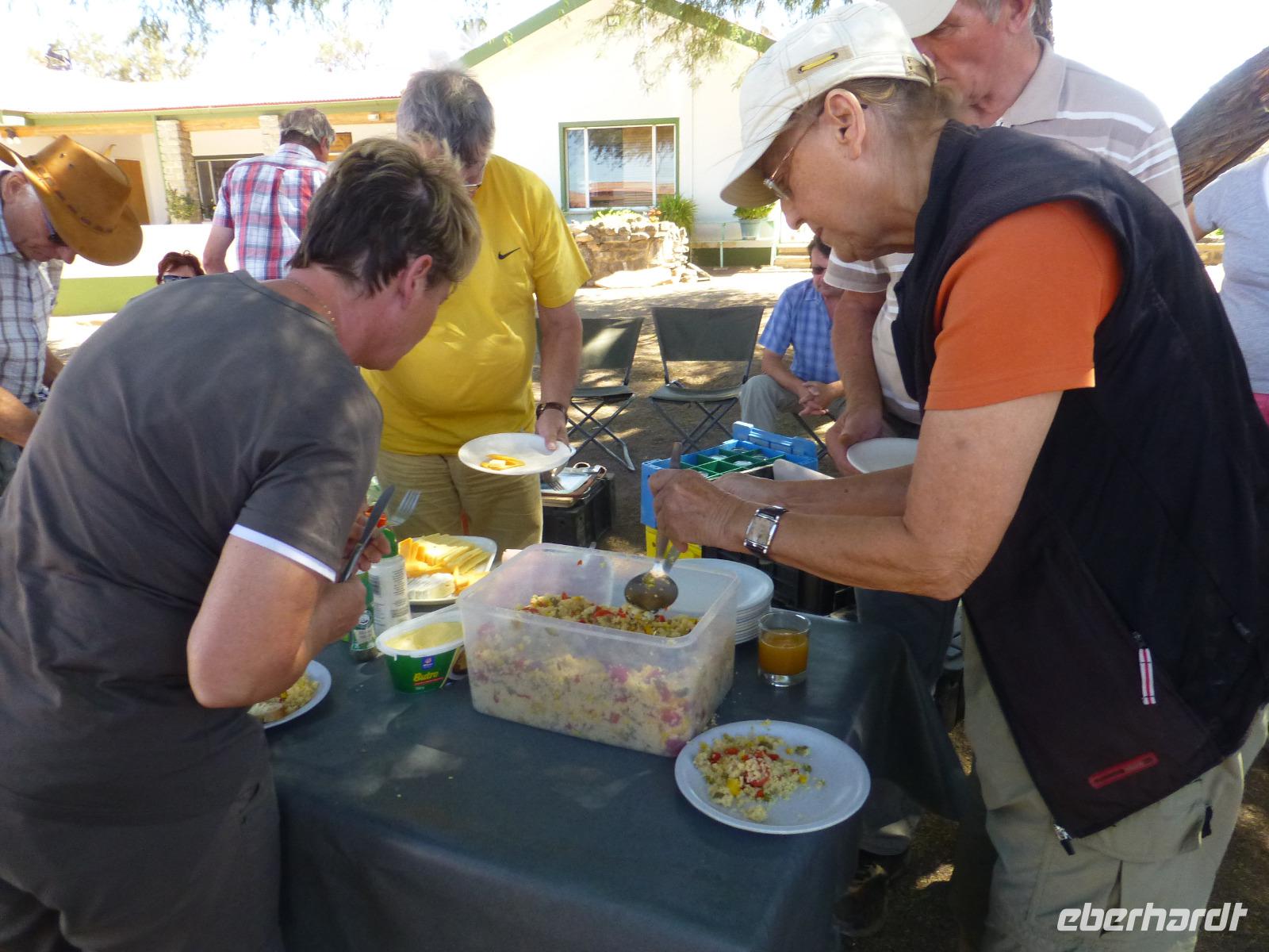 Jetzt haben wir aber Hunger, auf dem Parkplatz Lodge zum Nationalpark Eingang wollten wir picknicken. Der Platz unter einem großen, Schatten spendenden Baum war leider besetzt. Also rauf auf den Campingplatz und schattiges Plätzen suchen. Plötzlich steckte unser Truck im Sand fest. Mit vereinten Kräften schoben wir unser Gefährt aus dem Sandloch. Dann gab es endlich was zu essen. Der selbst gemachte frische Möhrensalat schmeckte bei den heißen Temperaturen besonders gut. Dann fahren wir zurück zu unserem Camp wo sich ein viele erst einmal ein kühles frischgezapftes Bier genießt. Den Nachmittag verbringt jeder nach eigenen Wünschen: das kühle Nass des Pools genießen, schlafen, lesen oder einfach die Stille der Wüste wirken lassen. Am frühen Abend wir wieder gemeinsam gekocht und gegessen. Nachdem die Dunkelheit hereingebrochen ist, erhalten wir von Ernst noch Unterricht in Sternenkunde. Er zeigt uns Milchstraße, Kreuz des Südens, Scorpion und andere Sternenbilder. Traumhaft schön...