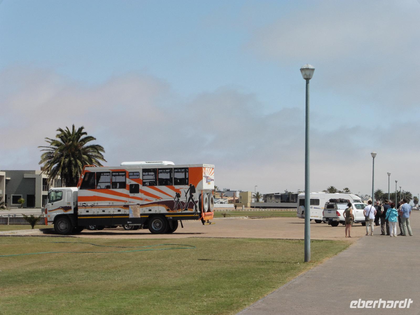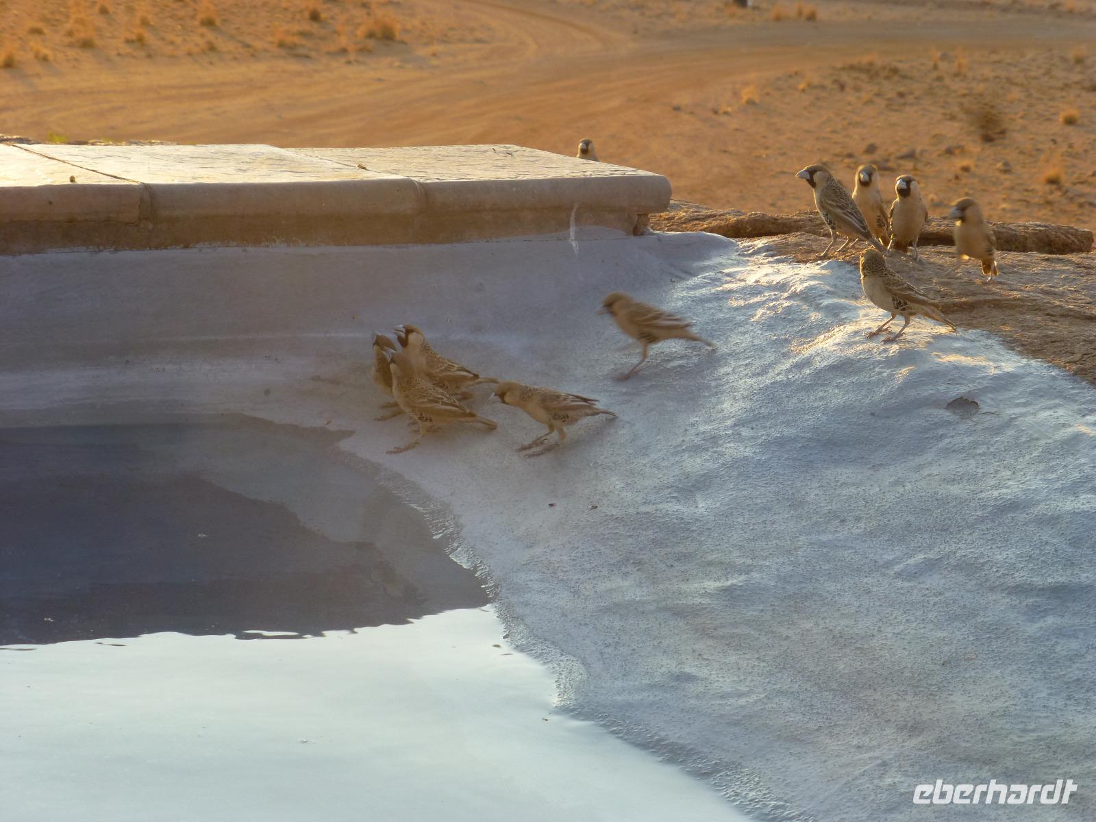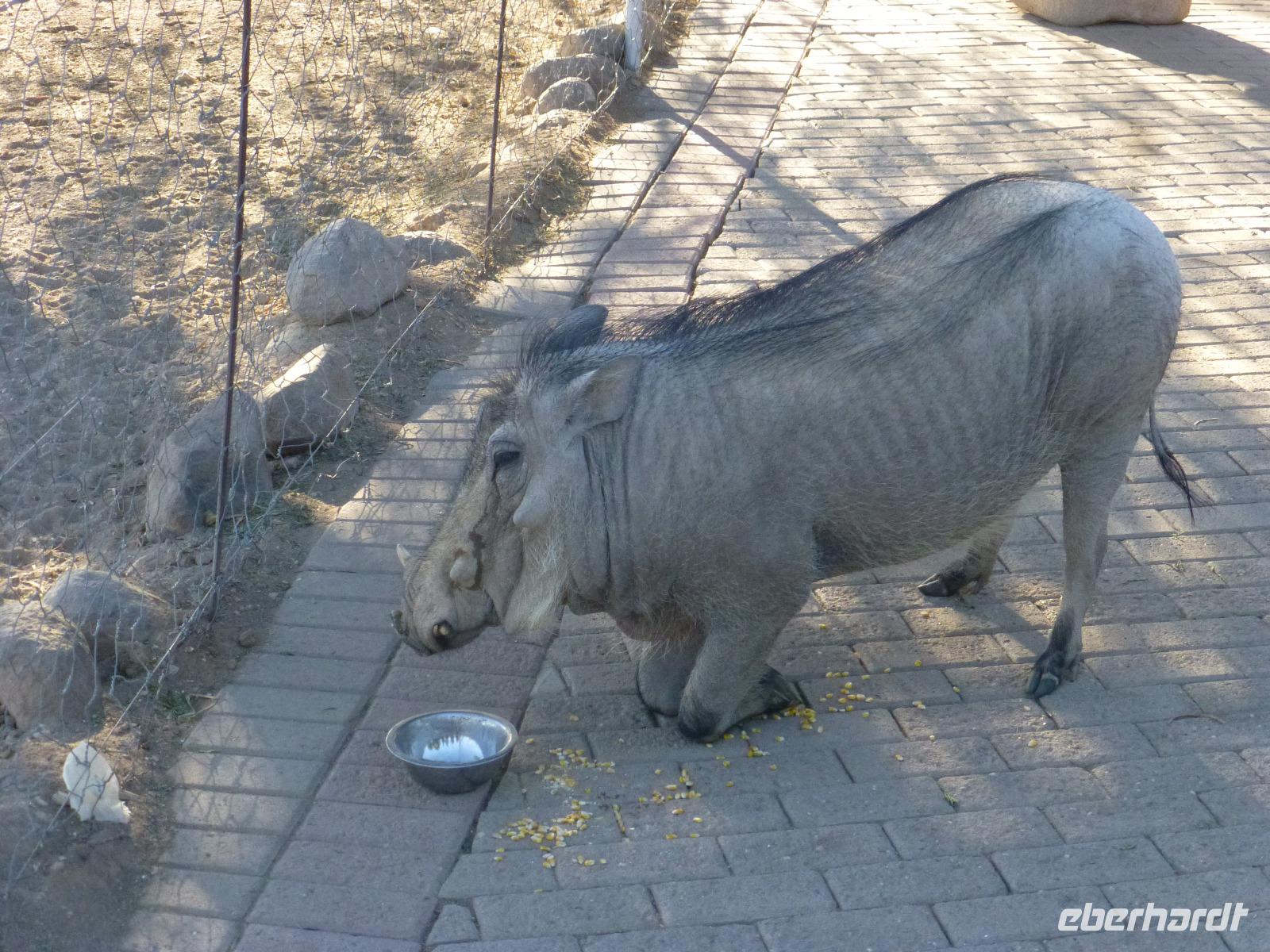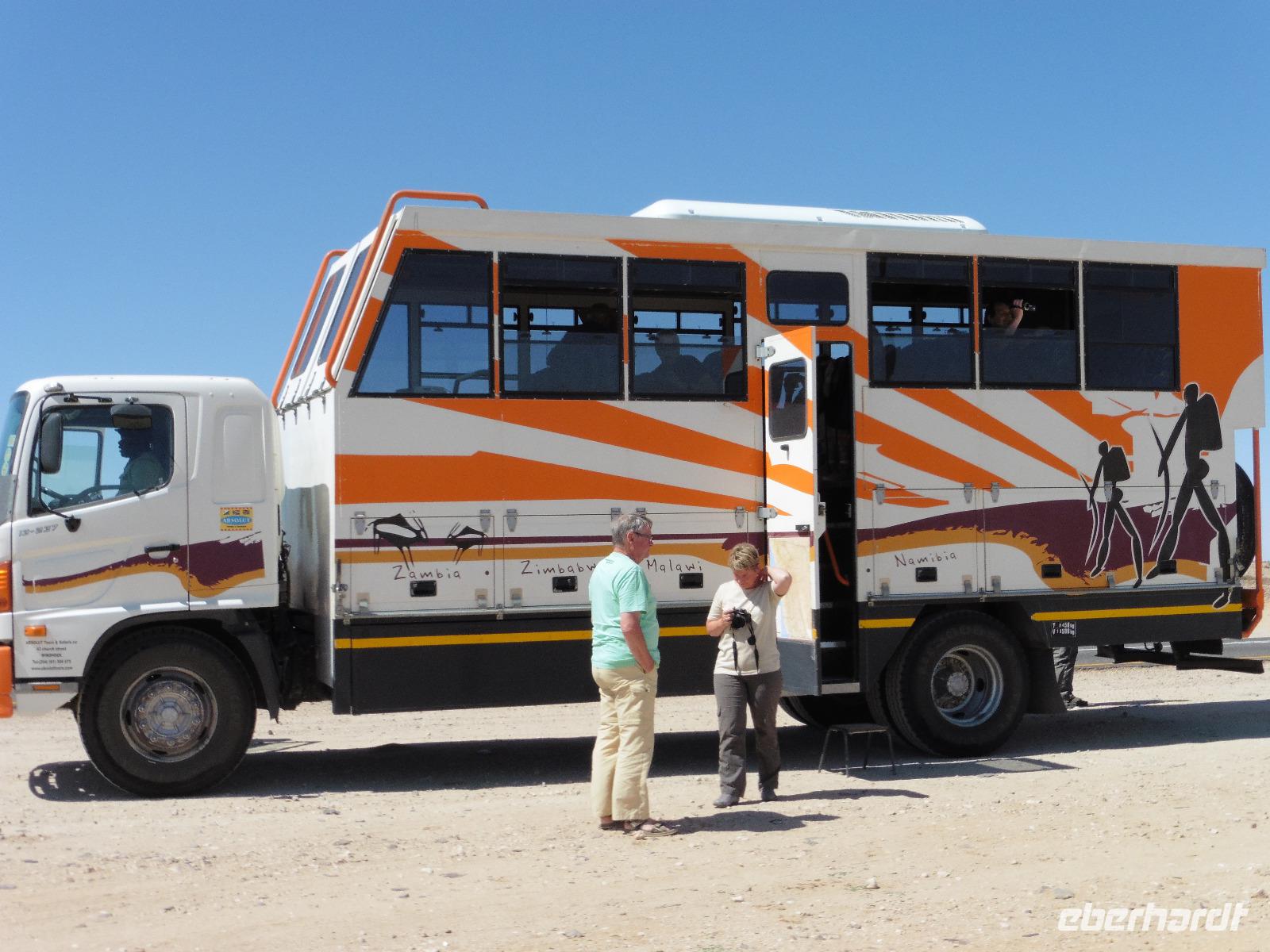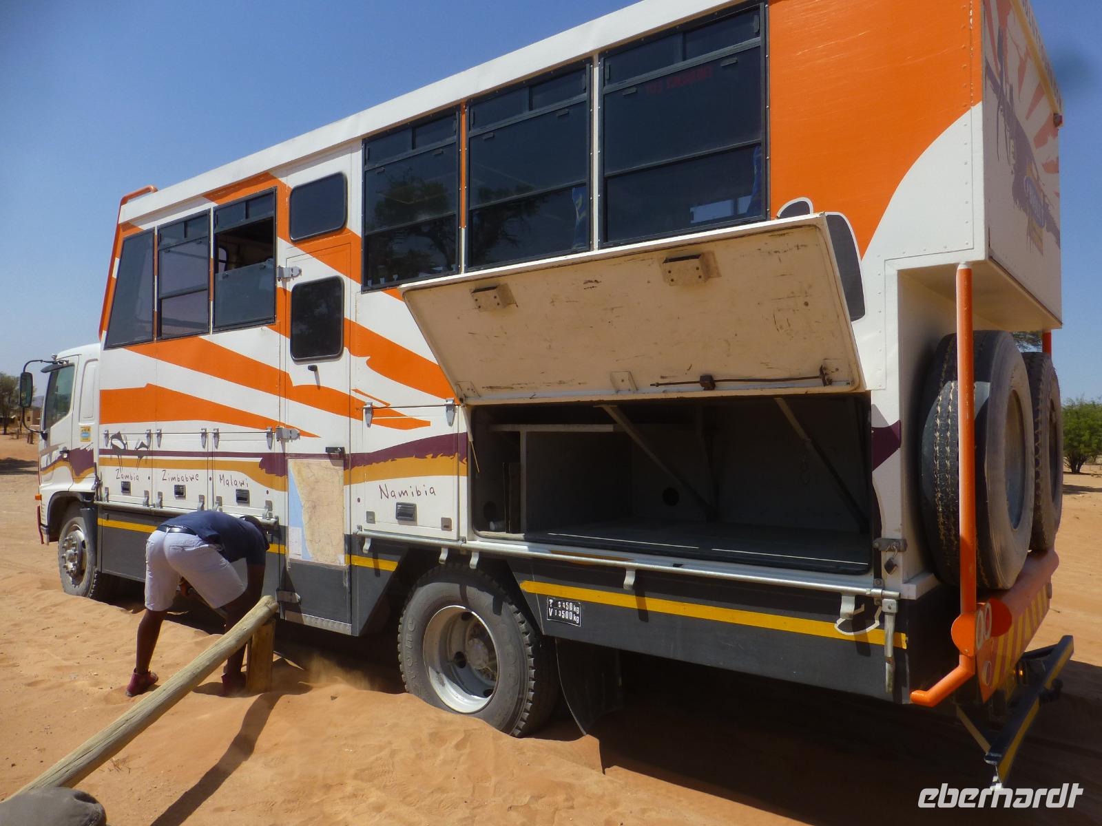 Jetzt haben wir aber Hunger, auf dem Parkplatz Lodge zum Nationalpark Eingang wollten wir picknicken. Der Platz unter einem großen, Schatten spendenden Baum war leider besetzt. Also rauf auf den Campingplatz und schattiges Plätzen suchen. Plötzlich steckte unser Truck im Sand fest. Mit vereinten Kräften schoben wir unser Gefährt aus dem Sandloch. Dann gab es endlich was zu essen. Der selbst gemachte frische Möhrensalat schmeckte bei den heißen Temperaturen besonders gut. Dann fahren wir zurück zu unserem Camp wo sich ein viele erst einmal ein kühles frischgezapftes Bier genießt. Den Nachmittag verbringt jeder nach eigenen Wünschen: das kühle Nass des Pools genießen, schlafen, lesen oder einfach die Stille der Wüste wirken lassen. Am frühen Abend wir wieder gemeinsam gekocht und gegessen. Nachdem die Dunkelheit hereingebrochen ist, erhalten wir von Ernst noch Unterricht in Sternenkunde. Er zeigt uns Milchstraße, Kreuz des Südens, Scorpion und andere Sternenbilder. Traumhaft schön...